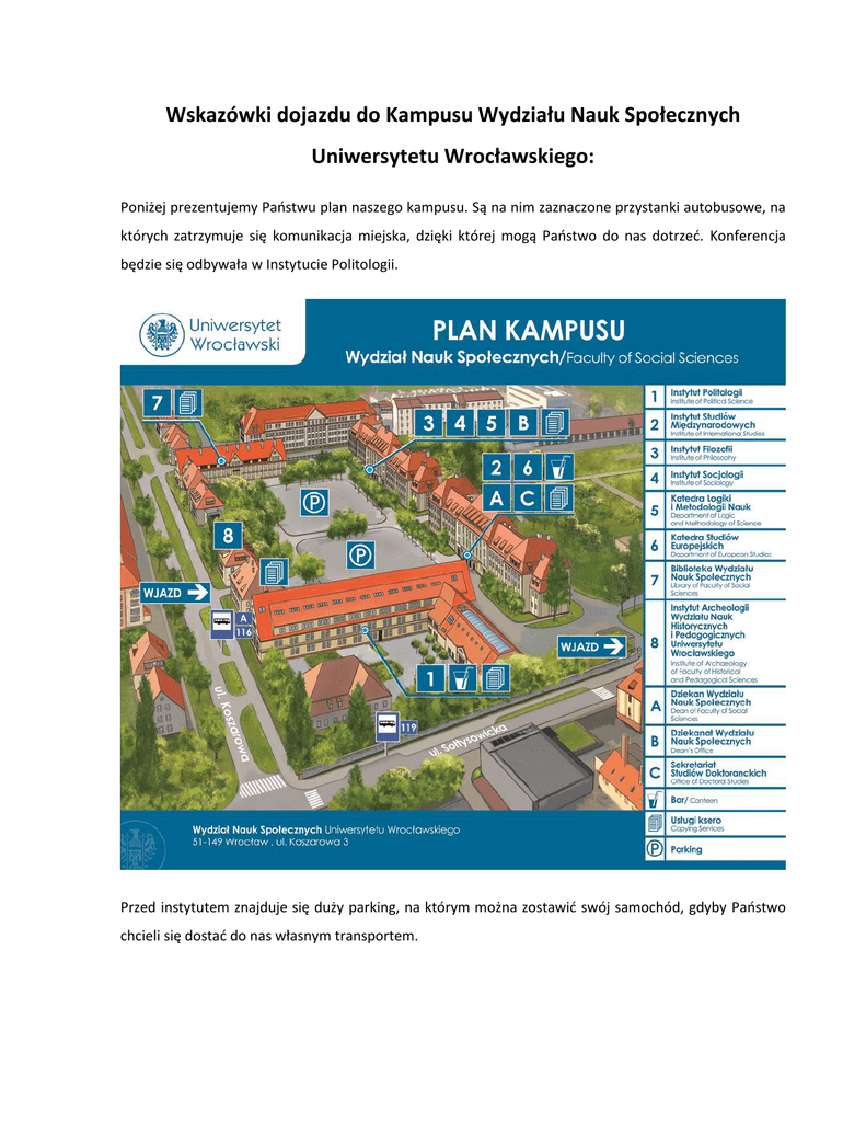 Wskazówki dojazdu do Kampusu Wydziału Nauk Społecznych Uniwersytetu Wrocławskiego: Poniżej prezentujemy Państwu plan naszego kampusu. Są na nim zaznaczone przystanki autobusowe, na których zatrzymuje się komunikacja miejska, dzięki której mogą Państwo do nas dotrzeć. Konferencja będzie się odbywała w Instytucie Politologii. Przed instytutem znajduje się duży parking, na którym można zostawić swój samochód, gdyby Państwo chcieli się dostać do nas własnym transportem. Dojazd z Dworca Głównego PKP: Do kampusu WNS z Dworca Głównego PKP można się dostać zarówno komunikacją autobusową jak i tramwajową. Autobus pospieszny A: Autobus nie ma bezpośredniego przystanku przy Dworcu PKP, ale jest do niego niedaleko. Znajduje się na ulicy Kościuszki (przystanek DWORCOWA). Dojście do niego zostało zaprezentowane na poniższej mapce: Dworzec Główny PKP Autobus A jedzie bezpośrednio na ulicę Koszarową (kierunek: KOSZAROWA SZPITAL) a jego przystanek znajduje się tuż przy bramie Wydziału Nauk Społecznych (jest to przystanek „na żadanie”: Koszarowa Uniwersytet). Godziny odjazdu Autobusu A z przystanku Dworcowa mogą Państwo znaleźć pod adresem: http://www.wroclaw.pl/przystanek-dworcowa-linia-a-kierunek-koszarowa-szpital-slupek-20334 Czas przejazdu to około 25 minut (w godzinach szczytu może być dłuższy). . Tramwaj nr 11: Istnieje jeszcze możliwość dostania się na konferencję z Dworca Głównego PKP tramwajem. Jednakże podróż wymaga przesiadki lub przejścia pewnej części trasy na piechotę. Przystanek tramwaju nr 11 znajduje się bezpośrednio przed Dworcem Głównym PKP, co zostało zaprezentowane na mapce: Przystanek tramwaju 11 Dworzec Główny PKP Tramwaj jedzie w kierunku pętli KROMERA (rozkład: http://www.wroclaw.pl/przystanek-dworzec-gl-pkplinia-11-kierunek-kromera-slupek-10268) na której należy wysiąść i przesiąść się na autobus linii A lub 116, albo udać się w dalszą podróż pieszo. Obie możliwości zaprezentowano poniżej. Przystanek 116 i A Pętla KROMERA Rozkład linii A z przystanku KROMERA: http://www.wroclaw.pl/przystanek-kromera-linia-a-kierunekkoszarowa-szpital-slupek-24112 (należy wysiąść na przystanku KOSZAROWA UNIWERSYTET – jest to przystanek na żądanie) Rozkład linii 116 z przystanku KROMERA: http://www.wroclaw.pl/przystanek-kromera-linia-116kierunek-soltysowice-slupek-24112 (należy wysiąść na przystanku KOSZAROWA) Do Kampusu WNS z pętli KROMERA można dotrzeć również pieszo: Wydział Nauk Społecznych Pętla KROMERA Dojazd z Dworca Głównego PKS: Dla osób, które chciałyby się dostać na naszą konferencję autobusem (również Polskim Busem), to pragniemy przypomnieć, że Dworzec Główny PKS jest teraz w przebudowie, a przyjazdy i odjazdy zostały przeniesione na dworzec tymczasowy. W tym przypadku również polecamy skorzystanie ze środków transportu zaproponowanych powyżej. Poniżej prezentujemy jak dostać się z dworca tymczasowego do Dworca Głównego PKP. Dworzec Główny PKP Dworzec Tymczasowy PKS