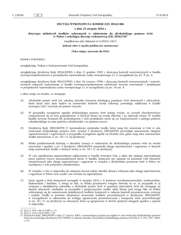 L 228/46 Dziennik Urzędowy Unii Europejskiej PL 23.8.2016 DECYZJA WYKONAWCZA KOMISJI (UE) 2016/1406 z dnia 22 sierpnia 2016 r. dotycząca niektórych środków ochronnych w odniesieniu do afrykańskiego pomoru świń w Polsce i uchylająca decyzję wykonawczą (UE) 2016/1367 (notyfikowana jako dokument nr C(2016) 5467) (Jedynie tekst w języku polskim jest autentyczny) (Tekst mający znaczenie dla EOG) KOMISJA EUROPEJSKA, uwzględniając Traktat o funkcjonowaniu Unii Europejskiej, uwzględniając dyrektywę Rady 89/662/EWG z dnia 11 grudnia 1989 r. dotyczącą kontroli weterynaryjnych w handlu wewnątrzwspólnotowym w perspektywie wprowadzenia rynku wewnętrznego (1), w szczególności jej art. 9 ust. 4, uwzględniając dyrektywę Rady 90/425/EWG z dnia 26 czerwca 1990 r. dotyczącą kontroli weterynaryjnych i zootech nicznych mających zastosowanie w handlu wewnątrzwspólnotowym niektórymi żywymi zwierzętami i produktami w perspektywie wprowadzenia rynku wewnętrznego (2), w szczególności jej art. 10 ust. 4, a także mając na uwadze, co następuje: (1) Afrykański pomór świń jest zakaźną chorobą wirusową dotykającą populacje świń domowych i zdziczałych, która może mieć duży wpływ na rentowność hodowli trzody chlewnej, powodując zakłócenia w handlu wewnątrz Unii i wywozie do państw trzecich. (2) W przypadku wystąpienia ogniska afrykańskiego pomoru świń istnieje ryzyko, że czynnik chorobotwórczy rozprzestrzeni się na inne gospodarstwa, w których chowa się trzodę chlewną, i na zdziczałe świnie. W wyniku handlu żywymi świniami lub pochodzącymi z nich produktami może się on rozprzestrzenić z jednego państwa członkowskiego na inne państwa członkowskie i na państwa trzecie. (3) Dyrektywą Rady 2002/60/WE (3) wprowadzono minimalne środki, które mają być stosowane w Unii w celu zwalczania afrykańskiego pomoru świń. Artykuł 9 dyrektywy 2002/60/WE przewiduje ustanowienie okręgów zapowietrzonych i zagrożonych w przypadku wystąpienia ognisk tej choroby tam, gdzie mają mieć zastosowanie środki ustanowione w art. 10 i 11 tej dyrektywy. (4) Polska poinformowała Komisję o aktualnej sytuacji w odniesieniu do afrykańskiego pomoru świń na swoim terytorium i zgodnie z art. 9 dyrektywy 2002/60/WE ustanowiła okręgi zapowietrzone i zagrożone, w których mają zastosowanie środki, o których mowa w art. 10 i 11 tej dyrektywy. (5) W celu zapobieżenia niepotrzebnym zakłóceniom w handlu wewnątrz Unii, a także aby uniknąć wprowadzenia przez państwa trzecie nieuzasadnionych barier w handlu, konieczne jest opisanie na poziomie Unii obszarów ustanowionych jako okręgi zapowietrzone i zagrożone w związku z afrykańskim pomorem świń w Polsce we współpracy z tym państwem członkowskim. (6) W związku z tym w załączniku do niniejszej decyzji należy określić obszary wskazane jako okręgi zapowietrzone i zagrożone w Polsce oraz ustalić czas trwania tej regionalizacji. (7) Sześć ognisk u świń domowych wystąpiło w sierpniu 2016 r. w powiecie wysokomazowieckim, zambrowskim, białostockim i bielskim. Z uwagi na fakt, że Polska przedstawia wstępne dowody na to, że przypadki te są związane z działalnością człowieka, a afrykański pomór świń w populacji zdziczałych świń nie występuje na danych obszarach, niezbędne są szczególne i proporcjonalne środki, także biorąc pod uwagę fakt, że Polska zobowiązuje się do zastosowania dodatkowych środków krajowych w zakresie kontroli przemieszczania zwierząt i rynków. Środki te powinny obejmować stosowanie środków przewidzianych w dyrektywie 2002/60/WE, w szczególności w odniesieniu do ścisłego ograniczenia przemieszczania i transportu świń, przewidzianego w art. 10 i 11 tej dyrektywy na obszarach, które są zgrupowane w dwóch spójnych okręgach zgodnie z opisem w załączniku. (1) Dz.U. L 395 z 30.12.1989, s. 13. (2) Dz.U. L 224 z 18.8.1990, s. 29. (3) Dyrektywa Rady 2002/60/WE z dnia 27 czerwca 2002 r. ustanawiająca przepisy szczególne w celu zwalczania afrykańskiego pomoru świń oraz zmieniająca dyrektywę 92/119/EWG w zakresie choroby cieszyńskiej i afrykańskiego pomoru świń (Dz.U. L 192 z 20.7.2002, s. 27). 23.8.2016 PL Dziennik Urzędowy Unii Europejskiej L 228/47 (8) W celu uwzględnienia ogólnej sytuacji epidemiologicznej i zastosowania odpowiednich środków należy również poddać przeglądowi decyzję wykonawczą Komisji 2014/709/UE (1). Po otrzymaniu dowodów potwierdzających z Polski w odniesieniu do ognisk opisanych powyżej środki przewidziane we wspomnianej decyzji wykonawczej należy także poddać przeglądowi, aby wykluczyć ryzyko rozprzestrzeniania się tej choroby u zdziczałych świń. (9) Decyzja wykonawcza Komisji (UE) 2016/1367 (2) określa niektóre środki ochronne w odniesieniu do afrykań skiego pomoru świń w Polsce. Od momentu jej przyjęcia sytuacja epidemiologiczna w odniesieniu do tej choroby uległa zmianie i środki te muszą zostać dostosowane. Dla zachowania jasności należy uchylić decyzję wykonawczą (UE) 2016/1367 i zastąpić ją niniejszą decyzją. (10) Środki przewidziane w niniejszej decyzji są zgodne z opinią Stałego Komitetu ds. Roślin, Zwierząt, Żywności i Pasz, PRZYJMUJE NINIEJSZĄ DECYZJĘ: Artykuł 1 Polska zapewnia, aby okręgi zapowietrzone i zagrożone ustanowione zgodnie z art. 9 dyrektywy 2002/60/WE obejmowały co najmniej obszary wymienione jako okręgi zapowietrzone i zagrożone w załączniku do niniejszej decyzji. Artykuł 2 Niniejszą decyzję stosuje się do dnia 15 października 2016 r. Artykuł 3 Decyzja wykonawcza (UE) 2016/1367 traci moc. Artykuł 4 Niniejsza decyzja skierowana jest do Rzeczypospolitej Polskiej. Sporządzono w Brukseli dnia 22 sierpnia 2016 r. W imieniu Komisji Vytenis ANDRIUKAITIS Członek Komisji (1) Decyzja wykonawcza Komisji 2014/709/UE z dnia 9 października 2014 r. w sprawie środków kontroli w zakresie zdrowia zwierząt w odni