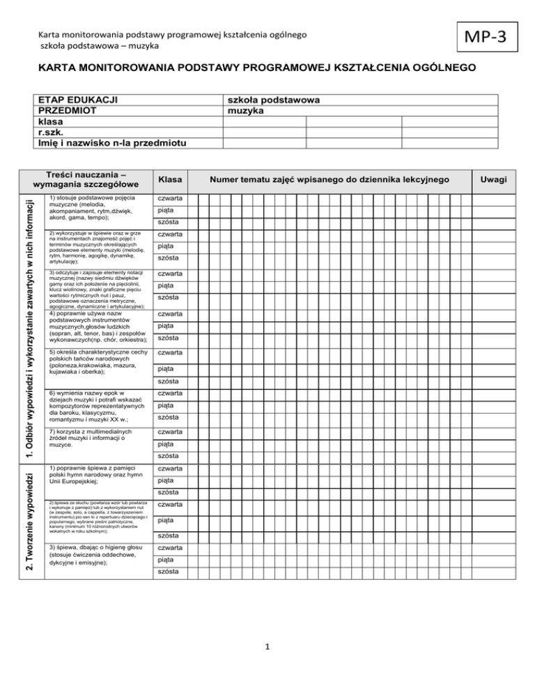 Karta monitorowania podstawy programowej kształcenia ogólnego szkoła podstawowa – muzyka MP-3 KARTA MONITOROWANIA PODSTAWY PROGRAMOWEJ KSZTAŁCENIA OGÓLNEGO ETAP EDUKACJI PRZEDMIOT klasa r.szk. Imię i nazwisko n-la przedmiotu 2. Tworzenie wypowiedzi 1. Odbiór wypowiedzi i wykorzystanie zawartych w nich informacji Treści nauczania – wymagania szczegółowe Klasa 1) stosuje podstawowe pojęcia muzyczne (melodia, akompaniament, rytm,dźwięk, akord, gama, tempo); czwarta 2) wykorzystuje w śpiewie oraz w grze na instrumentach znajomość pojęć i terminów muzycznych określających podstawowe elementy muzyki (melodię, rytm, harmonię, agogikę, dynamikę, artykulację); czwarta 3) odczytuje i zapisuje elementy notacji muzycznej (nazwy siedmiu dźwięków gamy oraz ich położenie na pięciolinii, klucz wiolinowy, znaki graficzne pięciu wartości rytmicznych nut i pauz, podstawowe oznaczenia metryczne, agogiczne, dynamiczne i artykulacyjne); czwarta 4) poprawnie używa nazw podstawowych instrumentów muzycznych,głosów ludzkich (sopran, alt, tenor, bas) i zespołów wykonawczych(np. chór, orkiestra); czwarta 5) określa charakterystyczne cechy polskich tańców narodowych (poloneza,krakowiaka, mazura, kujawiaka i oberka); czwarta szkoła podstawowa muzyka Numer tematu zajęć wpisanego do dziennika lekcyjnego piąta szósta piąta szósta piąta szósta piąta szósta piąta szósta 6) wymienia nazwy epok w dziejach muzyki i potrafi wskazać kompozytorów reprezentatywnych dla baroku, klasycyzmu, romantyzmu i muzyki XX w.; czwarta 7) korzysta z multimedialnych źródeł muzyki i informacji o muzyce. czwarta piąta szósta piąta szósta 1) poprawnie śpiewa z pamięci polski hymn narodowy oraz hymn Unii Europejskiej; czwarta piąta szósta 2) śpiewa ze słuchu (powtarza wzór lub powtarza i wykonuje z pamięci) lub z wykorzystaniem nut (w zespole, solo, a cappella, z towarzyszeniem instrumentu) pio sen ki z repertuaru dziecięcego i popularnego, wybrane pieśni patriotyczne, kanony (minimum 10 różnorodnych utworów wokalnych w roku szkolnym); czwarta 3) śpiewa, dbając o higienę głosu (stosuje ćwiczenia oddechowe, dykcyjne i emisyjne); czwarta piąta szósta piąta szósta 1 Uwagi 3. Analiza i interpretacja tekstów kultury 2. Tworzenie wypowiedzi Karta monitorowania podstawy programowej kształcenia ogólnego szkoła podstawowa – muzyka 4) gra na instrumentach ze słuchu i z wykorzystaniem nut (solo i w zespole) melodie, schematy rytmiczne, proste utwory i akompaniamenty (uczeń gra na jednym lub kilku instrumentach, do wyboru: dowolny instrument klasyczny lub elektroniczny, np.flet prosty, instrument klawiszowy, dzwonki, instrumentarium perkusyjne Orfa); czwarta 5) odtwarza ruchem i gestodźwiękami proste rytmy i schematy rytmiczne, wykonuje kroki, figury i układy taneczne poloneza i krakowiaka, tańców ludowych (szczególnie własnego regionu) oraz podstawowe kroki wybranych tańców towarzyskich; czwarta 6) tworzy proste struktury rytmiczne, sygnały dźwiękowe, swobodne akompaniamenty, prosty dwugłos (burdon, nagłos), ilustracje dźwiękowe do scen sytuacyjnych, tekstów literackich i obrazów (samodzielnie i pod kierunkiem nauczyciela); czwarta 7) tworzy improwizacje ruchowe do muzyki; czwarta piąta szósta piąta szósta piąta szósta piąta szósta 8) tworzy według ustalonych zasad improwizacje wokalne i instrumentalne (ćwiczenie wykonuje samodzielnie i pod kierunkiem nauczyciela z wykorzystaniem instrumentów wskazanych w pkt. 4 lub wykonanych przez uczniów); 9) tworzy wypowiedzi o muzyce za pomocą środków pozamuzycznych – odzwierciedla graficznie cechy muzyki i form muzycznych, rysuje, maluje i układa teksty do muzyki, opisuje słowami cechy i charakter słuchanych utworów. czwarta 1) świadomie odbiera muzykę – słucha (słuchanie analityczne, ukierunkowane przez nauczyciela na wybrane cechy utworu) wybranych dzieł literatury muzycznej (w całości lub fragmentów) reprezentatywnych dla kolejnych epok (od średniowiecza do XX w.) oraz dla muzyki jazzowej i rozrywkowej, słucha polskich pieśni patriotycznych oraz utworów ludowych w postaci oryginalnej i stylizowanej; czwarta 2) rozpoznaje cechy i budowę utworu muzycznego – określa nastrój, tempo, dynamikę, fakturę jednogłosową i wielogłosową, rozróżnia podstawowe formy muzyczne (A, AB, ABA1, rondo, wariacje); czwarta 3) rozróżnia podstawowe głosy ludzkie (sopran, alt, tenor, bas), rodzaje zespołu wykonawczego (soliści, orkiestra symfoniczna, różne typy chórów i zespołów), określa grupy instrumentów (strunowe – smyczkowe, szarpane, uderzane; dęte drewniane i blaszane; perkusyjne) i główne instrumenty z tych grup; czwarta 4) rozpoznaje charakterystyczne cechy polskich tańców narodowych (poloneza, krakowiaka, mazura, kujawiaka i oberka); czwarta 5) charakteryzuje wybrane utwory muzyczne wysłuchane i omówione na zajęciach oraz inne, określając cechy muzyki, które decydują o charakterze utworu; czwarta 6) porządkuje chronologicznie postacie kompozytorów – J. S. Bach, W. A. Mozart, L. van Beethoven, F. Chopin, S. Moniuszko, W. Lutosławski; czwarta 7) interpretuje (gra i śpiewa) utwory zgodnie ze wskazówkami wykonawczymi umieszczonymi w nutach oraz własnym odczuwaniem muzyki. czwarta piąta szósta czwarta piąta szósta piąta szósta piąta szósta piąta szósta piąta szósta piąta szósta piąta szósta piąta szósta 2