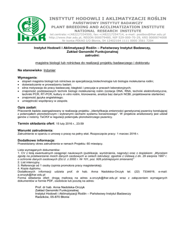 INSTYTUT HODOWLI I AKLIMATYZACJI ROŚLIN PAŃSTWOWY INSTYTUT BADAWCZY PLANT BREEDING AND ACCLIMATIZATION INSTITUTE NATIONAL RESEARCH INSTITUTE tel.centrala:+(4822)7334500, fax:+(4822)7254714, e-mail: [email protected] http://www.ihar.edu.pl, REGON 000079480, NIP 529-000-70-29, KRS 0000074008 Nr konta:PEKAO I/O Błonie, 54 12402164 1111 0000 3561 7204 Instytut Hodowli i Aklimatyzacji Roślin – Państwowy Instytut Badawczy, Zakład Genomiki Funkcjonalnej zatrudni: magistra biologii lub rolnictwa do realizacji projektu badawczego i doktoratu Na stanowisko: Inżynier Wymagania: stopień magistra biologii lub rolnictwa ze specjalizacją biotechnologia lub biologia molekularna roślin; doświadczenie w prowadzeniu badań; silna motywacja do pracy badawczej; biegłość i precyzja w pracach laboratoryjnych; znajomość podstawowych technik biologii molekularnej roślin (izolacja DNA, RNA, techniki elektroforetyczne, techniki PCR, RT-PCR, kultury in vitro roślin, klonowanie, analiza baz danych NCBI, projektowanie starterów) znajomość języka angielskiego; umiejętność współpracy w zespole. Opis zadań: Pracownik będzie zaangażowany w realizację projektu: „Identyfikacja zmienności genetycznej pszenicy korelującej z potencjałem plonotwórczym i wybranymi cechami systemu korzeniowego”. W projekcie analizowany jest udział genów z rodziny TaCKX w regulacji potencjału plonotwórczego pszenicy. Termin składania ofert: 15 luty 2016 r., 23:59 Warunki zatrudnienia: Zatrudnienie w oparciu o umowę o pracę na pełny etat. Rozpoczęcie pracy: 1 marzec 2016 r. Dodatkowe informacje: Przewidziany okres zatrudnienia w ramach Projektu: 60 miesięcy. Lista wymaganych dokumentów: 1. CV z listą ewentualnych osiągnięć naukowych (publikacje, wyróżnienia, nagrody) oraz z dopiskiem: „Wyrażam zgodę na przetwarzanie moich danych osobowych w celach rekrutacji, zgodnie z Ustawą z dn. 29 sierpnia 1997 r. o ochronie danych osobowych (Dz.U. z 2002 r. Nr 101, poz. 926 późniejszymi zmianami)” 2. List intencyjny. 3. Referencje od 1 osoby (opinia promotora pracy magisterskiej). 4. Kopia dyplomu. Dodatkowych informacji udziela prof. dr hab. Anna Nadolska-Orczyk tel. (22) 7334619, e-mail: [email protected] Forma składania ofert: drogą mailową na adres [email protected] wraz z załączeniem wymaganych dokumentów w formie PDF, osobiście lub pocztą na adres: Prof. dr hab. Anna Nadolska-Orczyk Zakład Genomiki Funkcjonalnej Instytut Hodowli i Aklimatyzacji Roślin – Państwowy Instytut Badawczy Radzików, 05-870 Błonie
