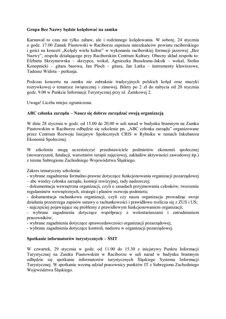 Grupa Bez Nazwy będzie kolędować na zamku Karnawał to czas nie tylko zabaw, ale i rodzinnego kolędowania. W sobotę, 24 stycznia o godz. 17.00 Zamek Piastowski w Raciborzu zaprasza mieszkańców powiatu raciborskiego i gości na koncert „Kolędy wielu kultur” w wykonaniu raciborskiej formacji jazzowej „Bez Nazwy”, zespołu działającego przy Raciborskim Centrum Kultury. Obecny skład zespołu to: Elżbieta Skrzymowska – skrzypce, wokal, Agnieszka Busuleanu-Jaksik – wokal, Stefan Konopnicki – gitara basowa, Jan Ploch – gitara, Jan Latka – instrumenty klawiszowe, Tadeusz Widota – perkusja. Podczas koncertu na zamku nie zabraknie tradycyjnych polskich kolęd oraz muzyki rozrywkowej o tematyce świątecznej i zimowej. Bilety po 2 zł do nabycia od 20 stycznia godz. 9.00 w Punkcie Informacji Turystycznej przy ul. Zamkowej 2. Uwaga! Liczba miejsc ograniczona. ABC członka zarządu – Naucz się dobrze zarządzać swoją organizacją W dniu 28 stycznia w godz. od 15.00 do 20.00 w sali narad w budynku bramnym na Zamku Piastowskim w Raciborzu odbędzie się szkolenie pn. „ABC członka zarządu” organizowane przez Centrum Rozwoju Inicjatyw Społecznych CRIS w Rybniku w ramach Inkubatora Ekonomii Społecznej. W szkoleniu mogą uczestniczyć przedstawiciele podmiotów ekonomii społecznej (stowarzyszeń, fundacji, warsztatów terapii zajęciowej, zakładów aktywności zawodowej itp.) z terenu Subregionu Zachodniego Województwa Śląskiego. Zakres tematyczny szkolenia: - wybrane zagadnienia formalno-prawne dotyczące funkcjonowania organizacji pozarządowej – abc wiedzy członka zarządu, komisji rewizyjnej, rady nadzorczej; - dokumentacja wewnętrzna organizacji, czyli o zasadach przyjmowania członków, tworzeniu regulaminów wewnętrznych, strategii i planów rozwoju podmiotu; - dokumentacja rachunkowa organizacji, czyli czy nasza organizacja prowadząc swoje działania przestrzega zapisów ustawy o rachunkowości i prawidłowo rozlicza się z ZUS i US; - najczęściej pojawiające się problemy z prawidłowym funkcjonowaniem organizacji; - wybrane zagadnienia dotyczące współpracy z wolontariuszami i zatrudnianiem pracowników; - wybrane zagadnienia dotyczące sprawozdawczości organizacji pozarządowej; - wybrane zagadnienia dotyczące kontroli, nadzoru w organizacji pozarządowej. Spotkanie informatorów turystycznych – ŚSIT W czwartek, 29 stycznia w godz. od 11.00 do 15.30 z inicjatywy Punktu Informacji Turystycznej na Zamku Piastowskim w Raciborzu w sali narad w budynku bramnym odbędzie się spotkanie informatorów turystycznych Śląskiego Systemu Informacji Turystycznej. W spotkaniu wezmą udział pracownicy punktów IT z Subregionu Zachodniego Województwa Śląskiego. Hełm, szyszak czy rogatywka – wojskowe nakrycia głowy. Niecodzienna wystawa na Zamku Piastowskim Czymże żołnierz byłby bez swojej czapki lub hełmu? Nakrycia głowy w historii wojskowości od wieków odgrywały bardzo ważną rolę – ochronną, galową lub reprezentacyjną. Po czapce można było rozpoznać, z jakim wojskiem mamy do czynienia oraz jaka jest ranga zbrojnego, ale nade wszystko można było ustalić, czy to przyjaciel, czy też wróg. W sobotę, 31 stycznia o godz. 16.00, w przeddzień zimowych ferii na Zamku Piastowskim w Raciborzu odbędzie się wernisaż niecodziennej wystawy – historycznych nakryć głowy. Będą nakrycia używane w czasach starożytnej Grecji i Rzymu, w okresie średniowiecza, w czasach nowożytnych, aż po Wojsko Polskie 1944-2014. Właścicielem eksponatów jest Krzysztof Wincenty Banaś herbu Dołęga z Familii Szlacheckiej – Rzecznik Tradycji i Obyczaju Szlacheckiego w Stowarzyszeniu Szlachty Wielkopolskiej. Uczestnicy spotkania, oglądając różne hełmy, kaski i czapki, jakich używali na przestrzeni wieków wojownicy i żołnierze, poznają ich nazwy, zalety i wady. Każdy chętny będzie mógł przez chwilę poczuć się jak rycerz księcia Mieszka Laskonogiego, husarz króla Jana III Sobieskiego lub polski ułan przymierzając hełm, szyszak i inne nakrycia głowy używane przez żołnierzy. Przypomnijmy, Familia Szlachecka znana jest z wielu inscenizacji i rekonstrukcji historycznych nawiązujących do złotych lat Rzeczpospolitej Polskiej. Wielokrotnie gościła już na raciborskim zamku. Działalność Familii niejednokrotnie była już nagradzana. Uczy i przypomina o naszej barwnej i pięknej historii oraz tradycji. Zamek Piastowski w Raciborzu – dom książęcy, 31 stycznia 2015 r., godz. 16.00, wernisaż. Wystawę można będzie oglądać wyłącznie podczas ferii, czyli od 31 stycznia do 13 lutego. Zapraszamy. Metapsychiczne Treści – zamek zaprasza na nową wystawę Metapsychiczne Treści – to tytuł nowej wystawy malarstwa Violetty Larysz-Wołek, na którą zaprasza Zamek Piastowski w Raciborzu. Wernisaż odbędzie się 3 lutego o godz. 17.00 w domu książęcym. Wystawa jest zbiorem obrazów, które powstawały w różnym czasie, obok tych, stworzonych całkiem niedawno, pojawiają się i te, które mimo upływu czasu nadal zawierają porte-parole autorki. Podczas kontemplowania obrazów autorka zachęca do wyjścia poza ramy umysłu, po to, by swobodnie poczuć się w wykreowanym przez nią świecie. Violetta Larysz-Wolek, urodzona w roku 1975 w Opolu (pseudonim artystyczny VLW). Ukończyła m.in. Wyższą Szkołę Techniczną w Katowicach na Wydziale Architektury, Budownictwa i Sztuk Stosowanych (rocznik 2007-2009). Jest członkiem Związku Polskich Artystów Plastyków Polska Sztuka Użytkowa. Od zawsze pasjonowało ją dekoratorstwo, a w szczególności zaś fascynowały ją akcenty plastyczne we wnętrzach. Od roku 2003 mieszka w Raciborzu. Malować zaczęła tuż po zakończeniu studiów architektury wnętrz. Jej pierwsza wystawa odbyła się w marcu 2012 w Raciborzu. Twórczość autorki prezentowana była w Galerii za Szafą na Przystanku Kulturalnym Koniec Świata. W 2014 jej prace można było zobacz