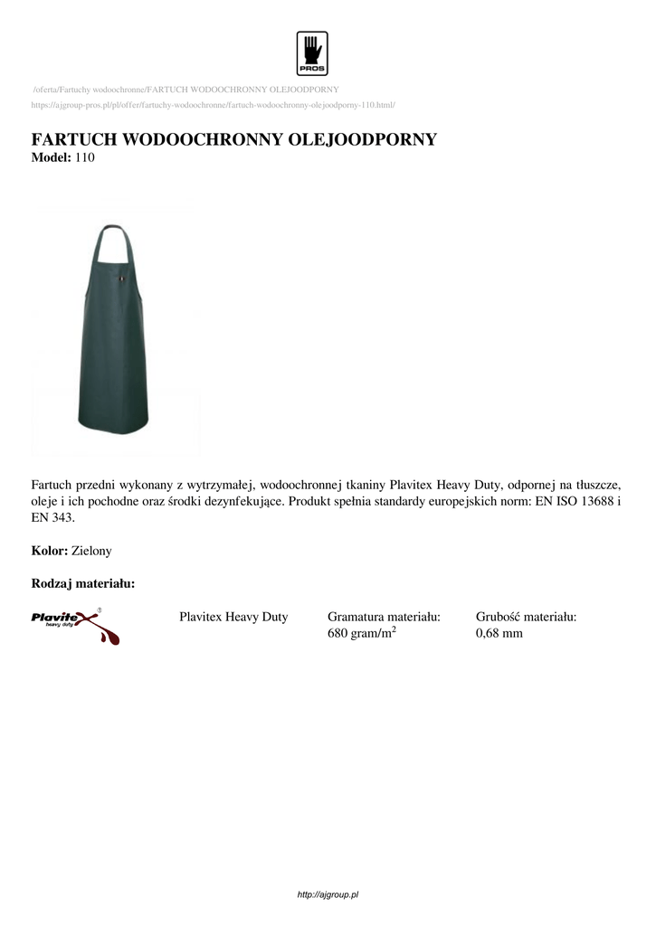 /oferta/Fartuchy wodoochronne/FARTUCH WODOOCHRONNY OLEJOODPORNY https://ajgroup-pros.pl/pl/offer/fartuchy-wodoochronne/fartuch-wodoochronny-olejoodporny-110.html/ FARTUCH WODOOCHRONNY OLEJOODPORNY Model: 110 Fartuch przedni wykonany z wytrzymałej, wodoochronnej tkaniny Plavitex Heavy Duty, odpornej na tłuszcze, oleje i ich pochodne oraz środki dezynfekujące. Produkt spełnia standardy europejskich norm: EN ISO 13688 i EN 343. Kolor: Zielony Rodzaj materiału: Plavitex Heavy Duty Gramatura materiału: 680 gram/m² http://ajgroup.pl Grubość materiału: 0,68 mm Tabela rozmiarów: Rozmiar Normy: DŁUGOŚĆ 120 cm Cechy specyficzne: EN ISO 13688 Odzież ochronna wymagania ogólne. EN 343 Odzież ochronna. Ochrona przed deszczem. -50ºC Produkt odporny na zginanie przy dużych ujemnych temperaturach. Regulacja na pasku szyjnym http://ajgroup.pl Powered by TCPDF (www.tcpdf.org) SZEROKOŚĆ 120 cm