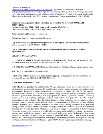 Ogłoszenie powiązane: Ogłoszenie nr 248577-2012 z dnia 2012-11-23 r. Ogłoszenie o zamówieniu - Parczew Usługa obejmuje pranie na zewnątrz szpitala wraz z transportem asortymentu brudnego do prania i przywóz asortymentu czystego po praniu na koszt Wykonawcy. Termin wykonania zamówienia 24 miesiące w ilości ok. 108 000 kg prania - miesięczna. Termin składania ofert: 2012-12-11 Parczew: Usługa prania bielizny szpitalnej na zewnątrz. Nr sprawy: SPZOZ.V.ZP3521/21/2012. Numer ogłoszenia: 3541 - 2013; data zamieszczenia: 07.01.2013 OGŁOSZENIE O UDZIELENIU ZAMÓWIENIA - Usługi Zamieszczanie ogłoszenia: obowiązkowe. Ogłoszenie dotyczy: zamówienia publicznego. Czy zamówienie było przedmiotem ogłoszenia w Biuletynie Zamówień Publicznych: tak, numer ogłoszenia w BZP: 248577 - 2012r. Czy w Biuletynie Zamówień Publicznych zostało zamieszczone ogłoszenie o zmianie ogłoszenia: nie. SEKCJA I: ZAMAWIAJĄCY I. 1) NAZWA I ADRES: Samodzielny Publiczny Zakład Opieki Zdrowotnej, ul. Kościelna 136, 21-200 Parczew, woj. lubelskie, tel. 83 3552113, faks 83 3552113. I. 2) RODZAJ ZAMAWIAJĄCEGO: Inny: Samodzielny Publiczny Zakład Opieki Zdrowotnej. SEKCJA II: PRZEDMIOT ZAMÓWIENIA II.1) Nazwa nadana zamówieniu przez zamawiającego: Usługa prania bielizny szpitalnej na zewnątrz. Nr sprawy: SPZOZ.V.ZP-3521/21/2012.. II.2) Rodzaj zamówienia: Usługi. II.3) Określenie przedmiotu zamówienia: Usługa obejmuje pranie na zewnątrz szpitala wraz z transportem asortymentu brudnego do prania i przywóz asortymentu czystego po praniu na koszt Wykonawcy. Termin wykonania zamówienia 24 miesiące w ilości ok. 108 000 kg prania miesięczna ilość około 4 500 kg. Asortyment prania który obejmuje: bieliznę pościelową (poszwy, poszewki, prześcieradła,parawany), bieliznę operacyjną (bluzy, spódnice, spodnie, sukienki), bieliznę porodową, bieliznę zakażoną, bieliznę niemowlęcą plus pieluchy i kocyki, bieliznę noworodkową plus pieluchy i kocyki, rożki, kompresy białe i zielone, serwety gazowe, odzież szpitalna (piżamy, koszule, szlafroki itp.), odzież ochronną personelu (fartuchy, ubrania lekarskie męskie i damskie, bluzy, spodnie), materace, ręczniki, ścierki, obrusy i serwety, koce, poduszki, kołdry, firanki, zasłony, wkłady wymienne do mopa, ściereczki kolorowe. Wykonawca powinien posiadać dwa własne pojemniki (kosze) na odpady powstające w magazynie bielizny brudnej. Pojemniki muszą być wyposażone w worki foliowe w odpowiednim kolorze - odpady komunalne worek koloru niebieskiego, odpady medyczne - worek koloru czerwony. Wykonanie usługi winno nastąpić w terminie 24 godzin (oprócz materace, poduszki, kołdry do 72 godzin) od momentu odbioru od Zamawiającego asortymentu brudnego do momentu przekazania do magazynu bielizny czystej tj. odbiór asortymentu brudnego do godz. 11:00, dostawa upranego asortymentu czystego www.spzozparczew.pl 07.01.2013 dnia następnego w godz. 10:00 do 11:00. Brudna bielizna odbierana w dzień poprzedzający dzień ustawowo wolny od pracy winna być po upraniu dostarczona do Zamawiającego w dzień następujący po dniu wolnym od pracy do godz. 11:00. II.4) Wspólny Słownik Zamówień (CPV): 98.30.00.00-6, 98.31.00.00-9, 98.31.10.00-6, 98.31.50.00-4, 50.83.00.00-2. SEKCJA III: PROCEDURA III.1) TRYB UDZIELENIA ZAMÓWIENIA: Przetarg nieograniczony III.2) INFORMACJE ADMINISTRACYJNE Zamówienie dotyczy projektu/programu finansowanego ze środków Unii Europejskiej: nie SEKCJA IV: UDZIELENIE ZAMÓWIENIA IV.1) DATA UDZIELENIA ZAMÓWIENIA: 31.12.2012. IV.2) LICZBA OTRZYMANYCH OFERT: 3. IV.3) LICZBA ODRZUCONYCH OFERT: 0. IV.4) NAZWA I ADRES WYKONAWCY, KTÓREMU UDZIELONO ZAMÓWIENIA: SUPER OLA Przedsiębiorstwo Usługowo- Handlowe Robert Hanc, ul. Chełmska 26, 22-150 Wierzbica, kraj/woj. lubelskie. IV.5) Szacunkowa wartość zamówienia (bez VAT): 293092,68 PLN. IV.6) INFORMACJA O CENIE WYBRANEJ OFERTY ORAZ O OFERTACH Z NAJNIŻSZĄ I NAJWYŻSZĄ CENĄ Cena wybranej oferty: 288262,80 Oferta z najniższą ceną: 288262,80 / Oferta z najwyższą ceną: 348040,80 Waluta: PLN. Podpisał: Dyrektor Samodzielnego Publicznego Zakładu Opieki Zdrowotnej w Parczewie mgr Janusz Hordejuk www.spzozparczew.pl 07.01.2013