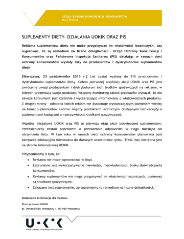 SUPLEMENTY DIETY- DZIAŁANIA UOKIK ORAZ PIS Reklama suplementów diety nie może przypisywać im właściwości leczniczych, czy sugerować, że są remedium na liczne dolegliwości – Urząd Ochrony Konkurencji i Konsumentów oraz Państwowa Inspekcja Sanitarna (PIS) działając w ramach sieci ochrony konsumentów wysłały listy do producentów i dystrybutorów suplementów diety [Warszawa, 23 października 2015 r.] List został wysłany do 315 producentów i dystrybutorów suplementów diety. Celem pierwszej wspólnej akcji UOKiK oraz PIS jest zwrócenie uwagi producentom i dystrybutorom tych środków spożywczych na reklamy, w których prezentują swoje produkty. Wstępny monitoring takich przekazów wykazał, że nie zawsze konsument jest rzetelnie i wyczerpująco informowany o właściwościach produktu. Z drugiej strony – odbiorca takich reklam nie dysponuje wystarczającym poziomem wiedzy na temat suplementów i różnic między produktami leczniczymi dostępnymi bez recepty a suplementami będącymi w rzeczywistości środkami spożywczymi. Wspólna inicjatywa UOKiK oraz PIS to pierwszy etap akcji poświęconej suplementom. Przedsiębiorcy zostali poproszeni o przekazanie odpowiedzi w ciągu miesiąca od otrzymania listu. W tym roku w ramach sieci ochrony konsumentów planowana jest kampania edukacyjna skierowana do słabszych uczestników rynku. Treść listu dostępna jest na stronie internetowej UOKiK. Przypominamy o tym, że: Reklama nie może wprowadzać w błąd. Zabronione jest wykorzystywanie niewiedzy, nieświadomości, braku doświadczenia konsumentów. Reklamy suplementów nie mogą przypisywać im właściwości leczniczych, ponieważ są środkami spożywczymi. Zakazane jest sugerowanie, że suplementy to remedium na liczne dolegliwości. Dodatkowe informacje dla mediów: Biuro prasowe UOKiK pl. Powstańców Warszawy 1, 00-950 Warszawa Tel. 22 827 28 92, 55 60 314 , 55 60 111 E-mail: [email protected] Twitter: @UOKiKgovPL