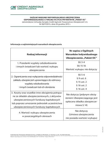 OGÓLNE WARUNKI INDYWIDUALNEGO UBEZPIECZENIA ODPOWIEDZIALNOŚCI CYWILNEJ W ŻYCIU PRYWATNYM „PAKIET OC” zatwierdzone Uchwałą Zarządu Credit Agricole Towarzystwo Ubezpieczeń S.A. Nr 08/P/2015 z dnia 30 grudnia 2015 r. Informacja o najistotniejszych warunkach ubezpieczenia 1. Przesłanki wypłaty odszkodowania i innych świadczeń lub wartość wykupu ubezpieczenia §§ 3-4 §§ 15-16 Wartość wykupu: nie dotyczy 2. Ograniczenia oraz wyłączenia odpowiedzialności zakładu ubezpieczeń uprawniające do odmowy wypłaty odszkodowania i innych świadczeń lub ich obniżenia §§ 5-6 § 9 ust. 6 § 15 ust. 2 § 16 ust. 2 § 16 ust. 4 3. Koszty oraz wszelkie inne obciążenia potrącane ze składek ubezpieczeniowych, z aktywów ubezpieczeniowych funduszy kapitałowych lub poprzez umorzenie jednostek uczestnictwa ubezpieczeniowych funduszy kapitałowych Nie dotyczy (jedynym obciążeniem Ubezpieczającego jest opłacana składka ubezpieczeniowa § 14) 4. Wartość wykupu ubezpieczenia w poszczególnych okresach Nie dotyczy (Umowa ubezpieczenia nie posiada wartości wykupu) OC-2016-V2 Rodzaj informacji Nr zapisu z Ogólnych Warunków Indywidualnego Ubezpieczenia „Pakiet OC” Credit Agricole Towarzystwo Ubezpieczeń S.A. z siedzibą we Wrocławiu, ul. Tęczowa 11, lok. 13, 53-601 Wrocław, wpisana do rejestru przedsiębiorców Krajowego Rejestru Sądowego prowadzonego przez Sąd Rejonowy dla Wrocławia-Fabrycznej we Wrocławiu, VI Wydział Gospodarczy Krajowego Rejestru Sądowego pod numerem KRS 0000528682, NIP 1010007027, Regon 022525091. 1 SPIS TREŚCI Rozdział 1 Postanowienia wstępne § 1................................................................................................................................................................ Str. 3 Rozdział 2 Definicje § 2.............................................................................................................................................................................................Str. 3 Rozdział 3 Przedmiot i zakres ubezpieczenia § 3...............................................................................................................................................Str. 4 Rozdział 4 Klauzule § 4.............................................................................................................................................................................................Str. 4 Rozdział 5 Wyłączenia odpowiedzialności §§ 5-6.......................................................................................................................................... Str. 4-5 Rozdział 6 Suma gwarancyjna § 7..........................................................................................................................................................................Str. 5 Rozdział 7 Zawarcie Umowy ubezpieczenia §§ 8-9........................................................................................................................................ Str. 5-6 Rozdział 8 Okres ubezpieczenia. Początek i koniec odpowiedzialności Ubezpieczyciela §§ 10-13........................................................Str. 6 Rozdział 9 Składka ubezpieczeniowa § 14...........................................................................................................................................................Str. 7 Rozdział 10 Postępowanie w razie zajścia Wypadku ubezpieczeniowego §§ 15-16.....................................................................................Str. 7 Rozdział 11 Odpowiedzialność Ubezpieczyciela § 17..........................................................................................................................................Str. 8 Rozdział 12 Powołanie rzeczoznawców § 18.........................................................................................................................................................Str. 8 Rozdział 13 Czynności podejmowane przez Ubezpieczyciela § 19...................................................................................................................Str. 8 Rozdział 14 Wymiana informacji § 20......................................................................................................................................................................Str. 8 Rozdział 15 Reklamacje § 21......................................................................................................................................................................................Str. 9 Rozdział 16 Postanowienia końcowe § 22..............................................................................................................................................................Str. 9 ZAŁĄCZNIK KLAUZULE DOTYCZĄCE RYZYK DODATKOWYCH Klauzula Nr 1 Rozszerzenie zakresu odpowiedzialności o Szkody powstałe w mieniu najmowanym (OC Najemcy).............................Str. 10 Klauzula Nr 2Rozszerzenie zakresu odpowiedzialności o Szkody powstałe z tytułu posiadania lub używania koni w celach rekreacyjnych.......................................................................................................................................................................................Str. 10 Rozszerzenie zakresu odpowiedzialności o Szkody wyrządzone przez posiadane Psy agresywne..................................Str. 10 Klauzula Nr 4 Rozszerzenie zakresu ubezpieczenia o odpowiedzialność cywilną pełnoletnich Osób bliskich Ubezpieczonego pozostających z nim we wspólnym gospodarstwie domowym (OC Pełnoletnie Osoby bliskie)..........Str. 10 OC-2016-V2 Klauzula Nr 3 Credit Agricole Towarzystwo Ubezpieczeń S.A. z siedzibą we Wrocławiu, ul. Tęczowa 11, lok. 13, 53-601 Wrocław, wpisana do rejestru przedsiębiorców Krajowego Rejestru Sądowego prowadzonego przez Sąd Rejonowy dla Wrocławia-Fabrycznej we Wrocławiu, VI Wydział Gospodarczy Krajowego Rejestru Są