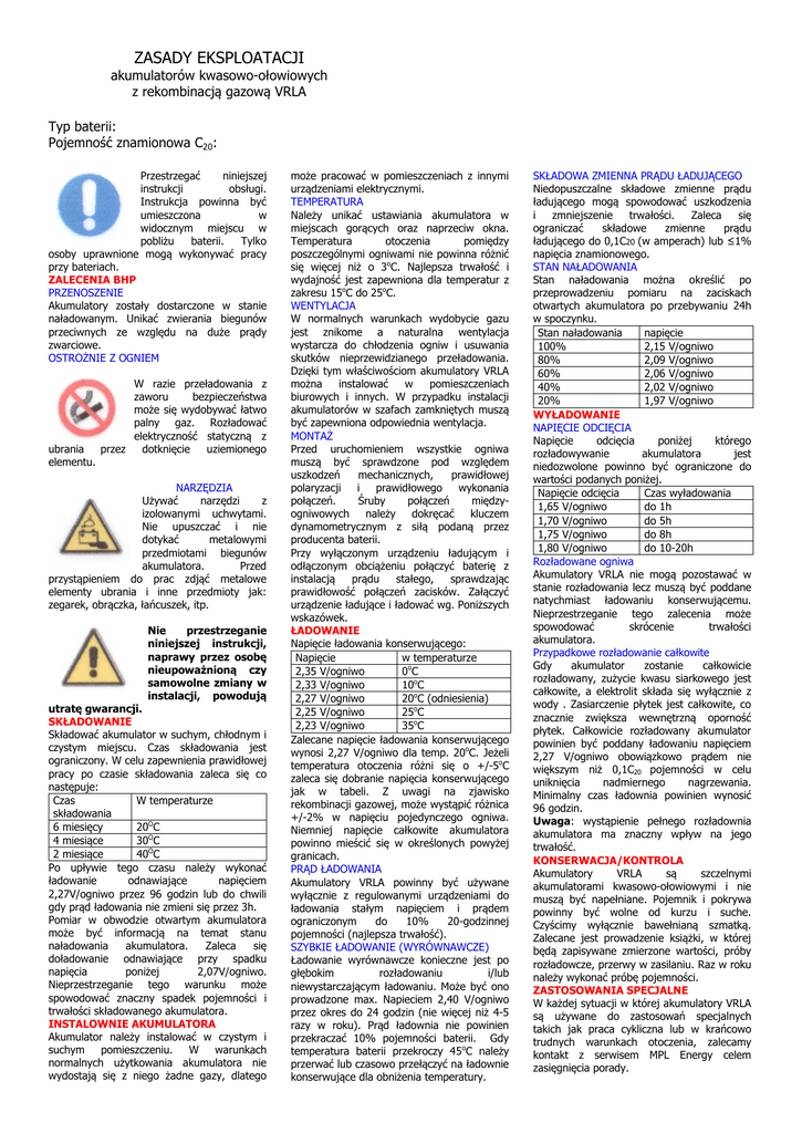 ZASADY EKSPLOATACJI akumulatorów kwasowo-ołowiowych z rekombinacją gazową VRLA Typ baterii: Pojemność znamionowa C20: Przestrzegać niniejszej instrukcji obsługi. Instrukcja powinna być umieszczona w widocznym miejscu w pobliżu baterii. Tylko osoby uprawnione mogą wykonywać pracy przy bateriach. ZALECENIA BHP PRZENOSZENIE Akumulatory zostały dostarczone w stanie naładowanym. Unikać zwierania biegunów przeciwnych ze względu na duże prądy zwarciowe. OSTROŻNIE Z OGNIEM ubrania elementu. W razie przeładowania z zaworu bezpieczeństwa może się wydobywać łatwo palny gaz. Rozładować elektryczność statyczną z przez dotknięcie uziemionego NARZĘDZIA Używać narzędzi z izolowanymi uchwytami. Nie upuszczać i nie dotykać metalowymi przedmiotami biegunów akumulatora. Przed przystąpieniem do prac zdjąć metalowe elementy ubrania i inne przedmioty jak: zegarek, obrączka, łańcuszek, itp. Nie przestrzeganie niniejszej instrukcji, naprawy przez osobę nieupoważnioną czy samowolne zmiany w instalacji, powodują utratę gwarancji. SKŁADOWANIE Składować akumulator w suchym, chłodnym i czystym miejscu. Czas składowania jest ograniczony. W celu zapewnienia prawidłowej pracy po czasie składowania zaleca się co następuje: Czas W temperaturze składowania 6 miesięcy 20OC 4 miesiące 30OC 2 miesiące 40OC Po upływie tego czasu należy wykonać ładowanie odnawiające napięciem 2,27V/ogniwo przez 96 godzin lub do chwili gdy prąd ładowania nie zmieni się przez 3h. Pomiar w obwodzie otwartym akumulatora może być informacją na temat stanu naładowania akumulatora. Zaleca się doładowanie odnawiające przy spadku napięcia poniżej 2,07V/ogniwo. Nieprzestrzeganie tego warunku może spowodować znaczny spadek pojemności i trwałości składowanego akumulatora. INSTALOWNIE AKUMULATORA Akumulator należy instalować w czystym i suchym pomieszczeniu. W warunkach normalnych użytkowania akumulatora nie wydostają się z niego żadne gazy, dlatego może pracować w pomieszczeniach z innymi urządzeniami elektrycznymi. TEMPERATURA Należy unikać ustawiania akumulatora w miejscach gorących oraz naprzeciw okna. Temperatura otoczenia pomiędzy poszczególnymi ogniwami nie powinna różnić się więcej niż o 3oC. Najlepsza trwałość i wydajność jest zapewniona dla temperatur z zakresu 15oC do 25oC. WENTYLACJA W normalnych warunkach wydobycie gazu jest znikome a naturalna wentylacja wystarcza do chłodzenia ogniw i usuwania skutków nieprzewidzianego przeładowania. Dzięki tym właściwościom akumulatory VRLA można instalować w pomieszczeniach biurowych i innych. W przypadku instalacji akumulatorów w szafach zamkniętych muszą być zapewniona odpowiednia wentylacja. MONTAŻ Przed uruchomieniem wszystkie ogniwa muszą być sprawdzone pod względem uszkodzeń mechanicznych, prawidłowej polaryzacji i prawidłowego wykonania połączeń. Śruby połączeń międzyogniwowych należy dokręcać kluczem dynamometrycznym z siłą podaną przez producenta baterii. Przy wyłączonym urządzeniu ładującym i odłączonym obciążeniu połączyć baterię z instalacją prądu stałego, sprawdzając prawidłowość połączeń zacisków. Załączyć urządzenie ładujące i ładować wg. Poniższych wskazówek. ŁADOWANIE Napięcie ładowania konserwującego: Napięcie w temperaturze 2,35 V/ogniwo 0 oC 2,33 V/ogniwo 10oC 2,27 V/ogniwo 20oC (odniesienia) 2,25 V/ogniwo 25oC 2,23 V/ogniwo 35oC Zalecane napięcie ładowania konserwującego wynosi 2,27 V/ogniwo dla temp. 20oC. Jeżeli temperatura otoczenia różni się o +/-5oC zaleca się dobranie napięcia konserwującego jak w tabeli. Z uwagi na zjawisko rekombinacji gazowej, może wystąpić różnica +/-2% w napięciu pojedynczego ogniwa. Niemniej napięcie całkowite akumulatora powinno mieścić się w określonych powyżej granicach. PRĄD ŁADOWANIA Akumulatory VRLA powinny być używane wyłącznie z regulowanymi urządzeniami do ładowania stałym napięciem i prądem ograniczonym do 10% 20-godzinnej pojemności (najlepsza trwałość). SZYBKIE ŁADOWANIE (WYRÓWNAWCZE) Ładowanie wyrównawcze konieczne jest po głębokim rozładowaniu i/lub niewystarczającym ładowaniu. Może być ono prowadzone max. Napieciem 2,40 V/ogniwo przez okres do 24 godzin (nie więcej niż 4-5 razy w roku). Prąd ładownia nie powinien przekraczać 10% pojemności baterii. Gdy temperatura baterii przekroczy 45oC należy przerwać lub czasowo przełączyć na ładownie konserwujące dla obniżenia temperatury. SKŁADOWA ZMIENNA PRĄDU ŁADUJĄCEGO Niedopuszczalne składowe zmienne prądu ładującego mogą spowodować uszkodzenia i zmniejszenie trwałości. Zaleca się ograniczać składowe zmienne prądu ładującego do 0,1C20 (w amperach) lub ≤1% napięcia znamionowego. STAN NAŁADOWANIA Stan naładowania można określić po przeprowadzeniu pomiaru na zaciskach otwartych akumulatora po przebywaniu 24h w spoczynku. Stan naładowania napięcie 100% 2,15 V/ogniwo 80% 2,09 V/ogniwo 60% 2,06 V/ogniwo 40% 2,02 V/ogniwo 20% 1,97 V/ogniwo WYŁADOWANIE NAPIĘCIE ODCIĘCIA Napięcie odcięcia poniżej którego rozładowywanie akumulatora jest niedozwolone powinno być ograniczone do wartości podanych poniżej. Napięcie odcięcia Czas wyładowania 1,65 V/ogniwo do 1h 1,70 V/ogniwo do 5h 1,75 V/ogniwo do 8h 1,80 V/ogniwo do 10-20h Rozładowane ogniwa Akumulatory VRLA nie mogą pozostawać w stanie rozładowania lecz muszą być poddane natychmiast ładowaniu konserwującemu. Nieprzestrzeganie tego zalecenia może spowodować skrócenie trwałości akumulatora. Przypadkowe rozładowanie całkowite Gdy akumulator zostanie całkowicie rozładowany, zużycie kwasu siarkowego jest całkowite, a elektrolit składa się wyłącznie z wody . Zasiarczenie płytek jest całkowite, co znacznie zwiększa wewnętrzną oporność płytek. Całkowicie rozładowany akumulator powinien być poddany ładowaniu napięciem 2,27 V/ogniwo obowiązkowo prądem 