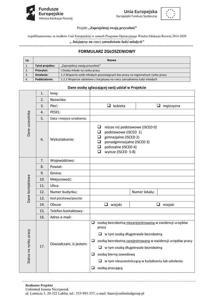 Projekt „Zaprojektuj swoją przyszłość” współfinansowany ze środków Unii Europejskiej w ramach Programu Operacyjnego Wiedza Edukacja Rozwój 2014-2020 „ Inicjatywy na rzecz zatrudnienia ludzi młodych” FORMULARZ ZGŁOSZENIOWY Lp. 1. 2. 3. 4. Nazwa Tytuł projektu: Priorytet: Działanie: Poddziałanie: „Zaprojektuj swoją przyszłość” I Osoby młode na rynku pracy 1.2 Wsparcie osób młodych pozostających bez pracy na regionalnym rynku pracy 1.2.2 Wsparcie udzielane z Inicjatywy na rzecz zatrudnienia ludzi młodych Status na rynku pracy Dane kontaktowe Dane uczestnika Dane osoby zgłaszającej swój udział w Projekcie 1. Imię: 2. Nazwisko: 3. Płeć: 4. PESEL: 5. Data i miejsce urodzenia: 6. Wykształcenie: 7. Województwo: 8. Powiat: 9. Gmina: 10. Miejscowość: 11. Ulica: 12. Numer budynku: 13. Kod pocztowy/poczta: 14. Obszar 15. Telefon kontaktowy: 16. Adres e-mail: kobieta mężczyzna niższe niż podstawowe (ISCED 0) podstawowe (ISCED 1) gimnazjalne (ISCED 2) ponadgimnazjalne (ISCED 3) policealne (ISCED 4) wyższe (ISCED 5-8) Numer lokalu: wiejski miejski osobą bezrobotną niezarejestrowaną w ewidencji urzędów pracy w tym osobą długotrwale bezrobotną 17. Oświadczam, iż jestem: osobą bezrobotną zarejestrowaną w ewidencji urzędów pracy w tym osobą długotrwale bezrobotną osobą bierną zawodową w tym nieuczestniczącą w kształceniu lub szkoleniu osobą pracującą Realizator Projektu Unlimited Joanna Niczyporuk ul. Lotnicza 3, 20-322 Lublin, tel.: 533-993-337; e-mail: [email protected] Projekt „Zaprojektuj swoją przyszłość” współfinansowany ze środków Unii Europejskiej w ramach Programu Operacyjnego Wiedza Edukacja Rozwój 2014-2020 „ Inicjatywy na rzecz zatrudnienia ludzi młodych” osobą należącą do mniejszości narodowej lub etnicznej, migrantem, osobą obcego pochodzenia (dane wrażliwe) osobą bezdomną lub dotkniętą wykluczeniem z dostępu do mieszkań osobą z niepełnosprawnościami (dane wrażliwe) Status społeczny i ekonomiczny: (należy załączyć orzeczenie o niepełnosprawności) osobą przebywającą w gospodarstwie domowym bez osób 18. Oświadczam, iż jestem: pracujących w tym: w gospodarstwie domowym z dziećmi pozostającymi na utrzymaniu osobą żyjąca w gospodarstwie składającym się z jednej osoby dorosłej i dzieci pozostających na utrzymaniu osobą w innej niekorzystnej sytuacji społecznej (innej niż wymienione powyżej), (dane wrażliwe) (jakiej?) ………………………………………………………………………………. …………………………………………………………………………………………….. …………………………………………………………………………………………….. 19. Oświadczam, że opiekuję się dzieckiem do lat 6 / osobą zależną dochód netto/m-c gospodarstwa domowego, w którym zamieszkuje wynosi poniżej 1.500 zł Dane dotyczące udziału w projekcie indywidualne poradnictwo zawodowe warsztaty poszukiwania pracy (pisania CV/LM, 20. Które z wymienionych działań podwyższyłoby Twoje szanse na znalezienie pracy? (można zakreślić więcej niż jedno) 21. Jak oceniasz swoją motywację do znalezienia pracy? prowadzenie rozmowy rekrutacyjnej, warsztaty rozwijające kompetencje społeczne dodatkowe kursy, szkolenia staż zawodowy spotkanie z osobą która pokaże mi do czego mam największe predyspozycje wszystkie powyższe inne (jakie?) ………………….. nie wiem bardzo chcę znaleźć jakąś pracę szukam pracy w swoim zawodzie, za godziwe wynagrodzenie jest mi to obojętne kiedy znajdę nie chce mi się ( nie wierzę że znajdę ) Realizator Projektu Unlimited Joanna Niczyporuk ul. Lotnicza 3, 20-322 Lublin, tel.: 533-993-337; e-mail: [email protected] Projekt „Zaprojektuj swoją przyszłość” współfinansowany ze środków Unii Europejskiej w ramach Programu Operacyjnego Wiedza Edukacja Rozwój 2014-2020 „ Inicjatywy na rzecz zatrudnienia ludzi młodych” 22. Od jakiego czasu szukasz pracy? 23. Które szkoleń podwyższyło by Twoje szanse na rynku pracy? poniżej 6 m-ce poniżej roku powyżej roku w sumie to nie szukam, bo nic i tak nie ma nie szukam przedstawiciel/ka handlowy/a z prawem jazdy kategorii B asystent/asystentka zarządu Pracownik centrum elektronicznej obsługi klienta mam wystarczające umiejętności Ja, niżej podpisany/-a oświadczam, że: 1. Zgłaszam chęć udziału w Projekcie współfinansowanym ze środków Unii Europejskiej w ramach Programu Operacyjnego Wiedza Edukacja Rozwój 2014-2020, pt. „Zaprojektuj swoją przyszłość”. 2. Zostałem/-am poinformowany/-a, że Projekt „Zaprojektuj swoją przyszłość” jest współfinansowany ze środków Unii Europejskiej w ramach Programu Operacyjnego Wiedza Edukacja Rozwój 2014-2020. 3. Wyrażam zgodę na udział w postępowaniu rekrutacyjnym. 4. Akceptuję fakt, że złożenie przeze mnie formularza zgłoszeniowego nie jest równoznaczne z zakwalifikowaniem do Projektu. W przypadku nie zakwalifikowania się do udziału w Projekcie nie będę wznosił/-a żadnych roszczeń ani zastrzeżeń do Firmy Unlimited Joanna Niczyporuk z siedzibą w Lublinie przy ul. Lotniczej 3. 5. Oświadczam, iż zapoznałem/-am się z Regulaminem w/w Projektu i zgodnie z wymogami jestem uprawniony/-a do uczestnictwa w nim. 6. Deklaruję uczestnictwo we wszystkich formach wsparcia w projekcie, równocześnie zobowiązuję się, iż w przypadku rezygnacji z uczestnictwa w Projekcie niezwłocznie poinformuję o tym fakcie Realizatora Projektu. 7. Deklaruję uczestnictwo w badaniach ankietowych oraz ewaluacyjnych na potrzeby Projektu. 8. Oświadczam, że nie jestem zatrudniony/-a na podstawie umowy o pracę, powołania, wyboru, mianowania, spółdzielczej umowy o pracę oraz na podstawie umów prawa cywilnego, a także nie prowadzę działalności gospodarczej ani rolniczej. Uprzedzony/-a o odpowiedzialności karnej za złoże