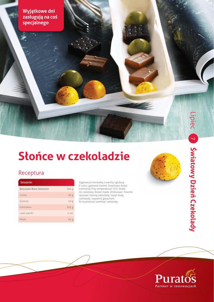Wyjątkowe dni zasługują na coś specjalnego Lipiec 7 Receptura Składniki Belcolade Blanc Selection 300 g Cukier 60 g Glukoza 50 g Kremówka 365 g Laski wanilii 2 szt. Masło 65 g Zagotować kremówkę z wanilią i glukozą. Z cukru ugotować karmel. Stopniowo dodać kremówkę. Przy temperaturze 75°C dodać do czekolady. Dodać masło. Zmiksować. Foremki spryskać ciemną czekoladą i wylać białą czekoladę i wypełnić ganachem. Po krystalizacji zamknąć czekoladą. Światowy Dzień Czekolady Słońce w czekoladzie