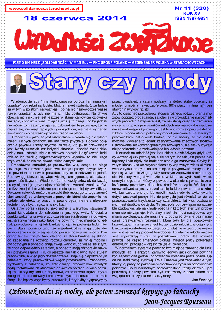www.solidarnosc.starachowice.pl 18 czerwca 2014 Nr 11 (320) ROK XV ISSN 1897-9831 PISMO KM NSZZ „SOLIDARNOŚĆ” W MAN Bus — PKC GROUP POLAND — GEGENBAUER POLSKA w STARACHOWICACH Wiadomo, że aby firma funkcjonowała oprócz hal, maszyn i urządzeń potrzebni są ludzie. Można nawet stwierdzić, że ludzie są w tym wszystkim najważniejsi, bo na nic najnowocześniejsze nawet urządzenia, gdy nie ma ich, kto obsługiwać. Na chwilę obecną nic i nikt nie jest jeszcze w stanie całkowicie człowieka zastąpić, chociaż w wielu miejsca już się to dzieje. Co by jednak nie mówić to maszyny mają nad człowiekiem tę przewagę, że nie męczą się, nie mają lepszych i gorszych dni, nie mają wymagań socjalnych i co najważniejsze nie trzeba im płacić. Pracownik – jako, że jest człowiekiem – składa się nie tylko z mięśni i innych organów, ale ma także psychikę. Dopiero połączenie psychiki i sfery fizycznej określa, kto jakim człowiekiem jest. Każdy człowiek jest indywidualnością i chociaż różne dziedziny nauki starają się dla różnych potrzeb klasyfikować ludzi dzieląc ich według najprzeróżniejszych kryteriów to nie ulega wątpliwości, że nie ma dwóch takich samych ludzi. Pracodawca zatrudniając pracownika wie, czego od niego oczekuje. Wie również, jakie kwalifikacje i predyspozycje fizyczne powinien pracownik posiadać, aby te oczekiwania spełnić. Pod uwagę bierze się, więc wiedzę, umiejętności, ale także i sprawność fizyczną. Wiadomo, że nie każdy człowiek do każdej pracy się nadaje gdyż najprzeróżniejsze uwarunkowania zarówno fizyczne jak i psychiczne po prostu go do niej dyskwalifikują. Owszem człowiek może się zmusić (lub mogą go to tego zmusić okoliczności) do wykonywania pracy, do której się zupełnie nie nadaje, ale efekty tej pracy na pewno będą mierne a niejednokrotnie mogą być tragiczne w skutkach. Ostatnio coraz częściej, jako jedne z warunków stawianych przed kandydatem do zatrudnienia jest jego wiek. Chociaż z punktu widzenia prawa pracy uzależnianie zatrudnienia od wieku jest dyskryminacją i jako takie nie powinno mieć miejsca to jednak pracodawcy mniej lub bardziej oficjalnie preferują ludzi młodych. Starsi pomimo tego, że niejednokrotnie mają duże doświadczenie i wiedzę są na dużo gorszej pozycji niż młodzi. Dlaczego tak się dzieje? Ano, dlatego, że starsi bardziej są skłonni do zapadania na różnego rodzaju choroby, są mniej mobilni i dyspozycyjni a ponadto znają swoją wartość, co wiąże się z tym, że chcą odpowiednio zarabiać, a ponadto mają różnorakie nawyki i przyzwyczajenia. To, co jeszcze nie tak dawno było atutem pracownika, a więc jego doświadczenie, staje się niepotrzebnym balastem, który pracownikowi wręcz przeszkadza. Pracodawcy wychodzą z założenia, że zatrudniając pracowników młodych będą kształtować ich stosownie do swoich potrzeb. A więc narzucą im taki styl myślenia, który sprawi, że pracownik będzie myślał kategoriami pracodawcy i całe swoje życie dostosuje do potrzeb firmy. Najlepszy więc byłby pracownik, który byłby dyspozycyjny przez dwadzieścia cztery godziny na dobę, słabo opłacany (a młodemu można nawet zaoferować 80% płacy minimalnej), bez starych nawyków itp. itd. Aby to osiągnąć pracodawcy stosują różnego rodzaju prania mózgów poprzez propagandę, szkolenia i wprowadzanie najrozmaitszych procedur. Oczywiste jest, że najłatwiej osiągnąć zamierzony cel w grupach pracowników młodych nie mający doświadczenia zawodowego i życiowego. Jest to w dużym stopniu plastelina, z której można ulepić potrzebny model pracownika. Ze starszymi pracownikami jest o wiele trudniej, co nie znaczy, że nie jest to możliwe. Wymaga to jednak zaangażowania znacznych środków i stosowania niekonwencjonalnych rozwiązań, ale efekty bywają niejednokrotnie nie zadawalające lub jedynie pozorne. Kierunek na młodość jest kierunkiem niewłaściwym gdyż każdy wcześniej czy później staje się starym, bo taki jest proces biologiczny i nikt nigdy nie będzie w stanie go zatrzymać. Gdyby iść w tym kierunku to starszych należałoby w pewnym wieku eliminować z rynku pracy a na ich miejsce przyjmować młodych. Nie było by w tym nic złego gdyby starszym zapewnić środki do życia. Niestety w tej chwili idzie to w kierunku wydłużania wieku emerytalnego a ci, którzy z powodu wieku nie są w stanie znaleźć pracy pozostawiani są bez środków do życia. Wielką niesprawiedliwością jest, że zwalnia się ludzi z powodu stanu zdrowia (za często chorują lub nabyli niezdolność do wykonywania dotychczasowej pracy). Nie do przyjęcia jest również to, że po przepracowaniu trzydziestu czy czterdziestu lat ktoś pozbawionych jest środków do życia. Tu jest pole do rozwiązań na szczeblu rządowym, ale na chwilę obecną nikt z tych sfer tym problemem się nie zajmuje. Naturalnym jest, że musi następować wymiana pokoleniowa, ale musi się to odbywać płynnie bez narzucania drastycznych rozwiązań, które były by dla kogokolwiek krzywdzące. Inną sprawą jest to, że ludzie młodzi znajdują się w bardzo niekomfortowej sytuacji, bo to właśnie w tej grupie wiekowej jest najwyższy procent bezrobocia. To właśnie młodzi najczęściej wyjeżdżają z kraju w poszukiwaniu pracy. Jest również prawdą, że część emerytów blokuje miejsca pracy pobierając emerytury i pracując – często za „psie” pieniądze. W normalnym systemie powinno być miejsce zarówno dla ludzi młodych jak i starszych. Zarówno jednym jak i drugim powinna być zapewniona godna i odpowiednia opłacana praca pozwalająca na stabilizację życiową. Rolą Państwa jest zapewnienie tym, którzy tej pracy są pozbawieni środków do życia na odpowiednim poziomie. Bo w normalnym społeczeństwie każdy człowiek jest potrzebny i każdy powinien być traktowany z szacunkiem bez względu na to czy