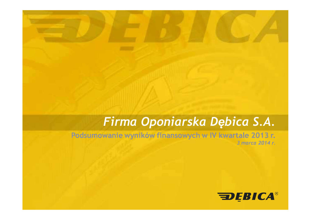 Firma Oponiarska Dębica S.A. Agenda Sytuacja na rynku Skonsolidowane wyniki finansowe Istotne wydarzenia w IV kw. 2013 r. 2 www.debica.com.pl Executive Summary • Zysk netto na poziomie 114 mln PLN: wzrost o 7% w porównywalnych warunkach, dodatkowo wsparty także przez pozytywne efekty podatkowe realizowanych inwestycji. • EBIT na poziomie 103 mln PLN: wzrost o 9% w porównywalnych warunkach potwierdza, że uzyskane wyniki opierają się na solidnych podstawach. • Stabilny poziom przychodów (+0,4% y/y) i marży brutto (+1,1% y/y), zachowany w bardzo trudnym roku. • Rozpoczęło się stopniowe odzyskiwanie potencjału rynkowego, przez co prognozy na rok 2014 są umiarkowanie optymistyczne. 3 www.debica.com.pl Sytuacja na rynku 4 www.debica.com.pl Opona standardowa – surowce MATERIAŁY POCHODZENIA PETROCHEMICZNEGO - Kauczuk syntetyczny Tkanina Sadza MATERIAŁY ORGANICZNE - Kauczuk naturalny METALE - Walcówka ze stali Drut Drutówka Cynk 5 www.debica.com.pl 6 2008 2009 2010 2011 2012 13/Q4 13/Q3 2012 13/Q2 13/Q4 13/Q3 13/Q2 13/Q1 12/Q4 12/Q3 2012 13/Q1 12/Q4 12/Q3 12/Q2 12/Q1 11/Q4 2011 12/Q2 2011 12/Q1 11/Q4 11/Q3 11/Q3 11/Q2 11/Q1 10/Q4 2010 11/Q2 2010 11/Q1 10/Q4 10/Q3 10/Q3 10/Q2 10/Q1 09/Q4 2009 10/Q2 10/Q1 2009 09/Q4 09/Q3 09/Q3 09/Q2 09/Q1 08/Q4 08/Q3 2008 09/Q2 09/Q1 2008 08/Q4 08/Q3 08/Q2 KORDY I DRUTY STALOWE 08/Q2 KORD TEKSTYLNY 08/Q1 08/Q1 08/Q2 08/Q3 08/Q4 09/Q1 09/Q2 09/Q3 09/Q4 10/Q1 10/Q2 10/Q3 10/Q4 11/Q1 11/Q2 11/Q3 11/Q4 12/Q1 12/Q2 12/Q3 12/Q4 13/Q1 13/Q2 13/Q3 13/Q4 EUR/MT SADZA 08/Q1 EUR/MT EUR/MT Zmiany cen surowców 180,0% 160,0% 140,0% 2008/Q1=120,0% 100,0% 80,0% 60,0% 40,0% 20,0% 0,0% 2013 120,0% 100,0% 80,0% 60,0% 2008/Q1= 40,0% 20,0% 0,0% 2013 140,0% 120,0% 2008/Q1= 100,0% 80,0% 60,0% 40,0% 20,0% 0,0% 2013 Dane wewnętrzne www.debica.com.pl 7 2008 2009 2010 2011 2012 13/Q4 13/Q3 2012 13/Q4 13/Q3 13/Q2 13/Q1 12/Q4 12/Q3 12/Q2 2012 13/Q2 13/Q1 12/Q4 2011 12/Q3 12/Q1 11/Q4 11/Q3 2011 12/Q2 12/Q1 11/Q4 11/Q3 2010 11/Q2 11/Q1 10/Q4 10/Q3 2010 11/Q2 11/Q1 10/Q4 10/Q3 2009 10/Q2 10/Q1 09/Q4 09/Q3 2009 10/Q2 10/Q1 09/Q4 09/Q3 2008 09/Q2 09/Q1 08/Q4 08/Q3 08/Q2 13/Q3 13/Q4 13/Q1 13/Q2 12/Q3 12/Q4 12/Q2 11/Q4 12/Q1 11/Q2 11/Q3 10/Q4 11/Q1 10/Q2 10/Q3 09/Q4 10/Q1 09/Q3 09/Q1 09/Q2 08/Q3 08/Q4 08/Q1 08/Q2 EUR/MT 2008 09/Q2 09/Q1 08/Q4 08/Q3 KAUCZUK SYNTETYCZNY 08/Q2 KAUCZUK NATURALNY 08/Q1 EUR-MT CHEMIA 08/Q1 USD/MT Zmiany cen surowców 140,0% 120,0% 2008/Q1= 100,0% 80,0% 60,0% 40,0% 20,0% 0,0% 2013 250,0% 200,0% 150,0% 2008/Q1= 100,0% 50,0% 0,0% 2013 180,0% 160,0% 140,0% 120,0% 2008/Q1= 100,0% 80,0% 60,0% 40,0% 20,0% 0,0% 2013 www.debica.com.pl Wyniki finansowe za IV kwartał 2013 r. 8 www.debica.com.pl Struktura przychodów ze sprzedaży Przychody ze sprzedaży (mln PLN) % zm. % zm. 4Q 13/ 4Q 13/ 4Q 12 3Q 13 Przychody ze sprzedaży za 12M 13 wyniosły 1 986,2 mln zł i były niższe o 6,9% w stosunku do 12M 12. W przychodach 12 m-cy ub.r. są zawarte przychody z jednorazowej transakcji sprzedaży całości zapasów wyrobów gotowych z wyłączeniem marki Dębica. -6,1% -22,1% 14,7% -26,4% Przychody ze sprzedaży w 4Q 13 wyniosły 422,1 mln zł i były odpowiednio niższe od 4Q o 4,2%. www.debica.com.pl +0,4% Wzrost w warunkach porównywalnych z wyłączeniem efektów jednorazowej sprzedaży zapasów w 2012r. Przychody od podmiotów niepowiązanych Przychody od pozostałych jednostek (mln PLN) Marża Za 12M 13 przychody ze sprzedaży od jednostek niepowiązanych wyniosły 225,4 mln zł i były niższe o 4,3% w stosunku do 12M 12. 10 W 4Q 13 przychody ze sprzedaży wyniosły 45,5 mln zł i były odpowiednio wyższe o 14,7% w stosunku do 4 Q 12. www.debica.com.pl Przychody od podmiotów powiązanych Przychody od podmiotów powiązanych (mln PLN) Marża Przychody od podmiotów powiązanych za 12M 13 wyniosły 1760,8 mln zł W 4Q 13 przychody ze sprzedaży na poziomie 376,6 mln zł i były niższe o 7,2% w stosunku do 12M 12. W przychodach 1 Q 12 zawarte są były niższe o 6,1% w stosunku do 4Q 12. przychody z tytułu jednorazowej transakcji sprzedaży całości zapasu wyrobów gotowych z wyłączeniem marki Dębica. Kwota transakcji 155,1mln zł. 11 www.debica.com.pl +1,0 % Wzrost w warunkach porównywalnych z wyłączeniem efektów jednorazowej sprzedaży zapasów w 2012r. Marża brutto Wynik brutto (mln PLN) % zm. 12M 13/ 12M 12 % zm. % zm. 4Q 13/ 4Q 13/ 4Q 12 3Q 13 -15,1% -42,8% -57,2% 20,1% 133,4% -4,2% Marża brutto wyniosła 187,0 mln zł i była niższa o 6,5 % w stosunku do 12M 12. 12 www.debica.com.pl +1,1% Wzrost w warunkach porównywalnych z wyłączeniem efektów jednorazowej sprzedaży zapasów w 2012r. Koszty sprzedaży i ogólnego zarządu % zm. 12M 13/ 12M 12 % zm. % zm. 4Q 13/ 4Q 13/ 4Q 12 3Q 13 -5,3% -25,0% -4,8% 14,5% 3976% -23,1% Koszty sprzedaży i ogólnego zarządu za 12M 13 wyniosły 79,3 mln zł (w tym za 4Q wyniosły 17,7 mln zł) 13 www.debica.com.pl Zysk z działalności operacyjnej EBIT (mln PLN) EBIT za 12M 13 wyniósł 103,1mln zł i był niższy o 5,9% w stosunku do roku ubiegłego. 14 EBIT w 4Q 13 wyniósł 17,2 mln zł i był niższy o 22,5% w stosunku do 4Q 12. www.debica.com.pl +8,9% Wzrost w warunkach porównywalnych z wyłączeniem efektów jednorazowej sprzedaży zapasów w 2012r. Wynik na działalności finansowej Wynik na działalności finansowej (mln PLN) • Wynik na działalności finansowej za 12 m-cy 13 jest przychodem w kwocie 5,4 mln zł, o 1,8 mln zł niższy niż za 12 m-cy 12. • Przychód w kwocie 6,5 mln zł wygenerowały różnice kursowe (o 3,1 mln zł wyższy niż za 12 m-cy 12). Derywaty nie wystąpiły za 12 m-cy 13 i ich wycena wynosi zero wobec przychodów 5,0 mln zł za 12 m-cy 12. • Odsetki od kredytu są niższe o 1,1 mln zł, a koszty dyskonta weksli w kwocie 2,7 mln zł o 0,8 mln zł, niż za 12 m-cy 12. • Koszty poz. odsetek wyniosły 1,0 mln zł wobec 1,2 mln zł za 12 m-cy 12, mniejsze o 0,2 mln zł. • Przychody finansowe od wolnych środków wyniosły 2,6 mln zł wobec 4,6 mln zł za 12 