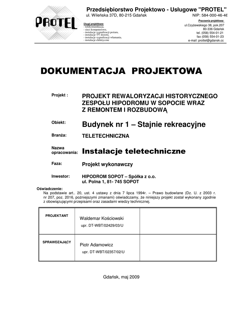 Przedsiębiorstwo Projektowo - Usługowe "PROTEL" ul. Wileńska 37D, 80-215 Gdańsk NIP: 584-000-46-46 Pracownia projektowa: Usugi projektowe: - telekomunikacja, - sieci komputerowe, - instalacje sygnalizacji pożaru, - instalacje TV dozoru, - instalacje sygnalizacji włamania, - instalacje elektryczne ul.Czyżewskiego 38, pok.207 80-336 Gdańsk tel. (058) 554-01-21 fax (058) 554-01-23 e-mail: [email protected] DOKUMENTACJA PROJEKTOWA Projekt : PROJEKT REWALORYZACJI HISTORYCZNEGO ZESPOŁU HIPODROMU W SOPOCIE WRAZ Z REMONTEM I ROZBUDOWĄ Obiekt: Budynek nr 1 – Stajnie rekreacyjne Branża: TELETECHNICZNA Nazwa opracowania: Instalacje teletechniczne Faza: Projekt wykonawczy Inwestor: HIPODROM SOPOT – Spółka z o.o. ul. Polna 1, 81- 745 SOPOT Oświadczenie: Na podstawie art.. 20, ust. 4 ustawy z dnia 7 lipca 1994r. – Prawo budowlane (Dz. U. z 2003 r. nr 207, poz. 2016, pożniejszymi zmanami) oświadczamy, że niniejszy projekt został wykonany zgodnie z obowiązującymi przepisami oraz zasadami wiedzy technicznej. PROJEKTANT Waldemar Kościowski upr. DT-WBT/02429/03/U SPRAWDZAJĄCY Piotr Adamowicz upr. DT-WBT/02357/02/U Gdańsk, maj 2009 Spis treści 1. 2. DANE OGÓLNE ......................................................................................................................................... 3 1.1. INFORMACJE OGÓLNE O INSTALACJACH TELETECHNICZNYCH NA TERENIE ZESPOŁU HIPODROMU ........ 3 1.2. PRZEDMIOT I ZAKRES OPRACOWANIA ................................................................................................... 4 1.3. PODSTAWA OPRACOWANIA ................................................................................................................... 4 1.4. PROJEKTY ZWIĄZANE............................................................................................................................ 5 1.5. UWAGI INSTALACYJNO – MONTAŻOWE:................................................................................................ 5 DANE OGÓLNE O BUDYNKU NR 1 – STAJNIE REKREACYJNE .................................................. 6 2.1. 3. ZAKRES RZECZOWY .............................................................................................................................. 6 INSTALACJE TELETECHNICZNE........................................................................................................ 7 3.1. ZESTAWIENIE PRZEŁĄCZNIC ................................................................................................................. 7 3.2. ZESTAWIENIE MATERIAŁÓW ................................................................................................................. 7 4. SYSTEM KONTROLI OBCHODU OBSŁUGI ....................................................................................... 8 5. SYSTEM SYGNALIZACJI POŻARU...................................................................................................... 8 5.1. CHARAKTERYSTYKA OBIEKTU .............................................................................................................. 8 5.2. PODSTAWA OPRACOWANIA PROJEKTU .................................................................................................. 9 5.3. ZAKRES ZABEZPIECZENIA INSTALACJĄ SAP ......................................................................................... 9 5.4. OPIS SYSTEMU SYGNALIZACJI POŻARU ................................................................................................10 5.5. STEROWANIE URZĄDZENIAMI ZEWNĘTRZNYMI ....................................................................................16 5.5.1. Sygnalizacja o zagrożeniu pożarem. ..............................................................................................18 5.5.2. Sterowanie systemem wentylacji bytowej .......................................................................................18 5.5.3. Monitoring do PSP.........................................................................................................................19 5.5.4. System wizualizacji.........................................................................................................................19 5.6. 5.6.1. Technologia wykonania..................................................................................................................19 5.6.2. Odbiór robót...................................................................................................................................21 5.6.3. Zalecenia dla użytkownika .............................................................................................................22 5.7. 6. MONTAŻ URZĄDZEŃ I INSTALACJI........................................................................................................19 URZĄDZENIA I MATERIAŁY ..................................................................................................................22 UWAGI O ZASTOSOWANYCH MATERIAŁACH..............................................................................23 Spis rysunków TT1/1 Instalacje teletechniczne. Schemat okablowania w budynku nr 1. TT2/2 Instalacje teletechniczne. Plan instalacji teletechnicznych. TP1/3 Instalacja systemu sygnalizacji pożaru. Schemat blokowy. TP2/4 Instalacja systemu sygnalizacji pożaru. Schemat rzut poziomu parteru. TP3/5 Instalacja systemu sygnalizacji pożaru. Schemat rzut poziomu antresoli. 2 OPIS TECHNICZNY PROJEKT WYKONAWCZY Rewitalizacja historycznego zespołu hipodromu w Sopocie wraz z remontem i rozbudową Budynek nr 1. Stajnie rekreacyjne Instalacje teletechniczne 1. Dane ogólne 1.1. Informacje ogólne o instalacjach teletechnicznych na terenie zespołu hipodromu Projektuje się rewaloryzację historycznego zespołu hipodromu w Sopocie wraz z remontem i rozbudową. Projektuje się wykonanie w poszczególnych obiektach zespołu hipodromu instalacji teletechnicznych według potrzeb technologicznych danego obiektu oraz zgodnie z obowiązującymi przepi
