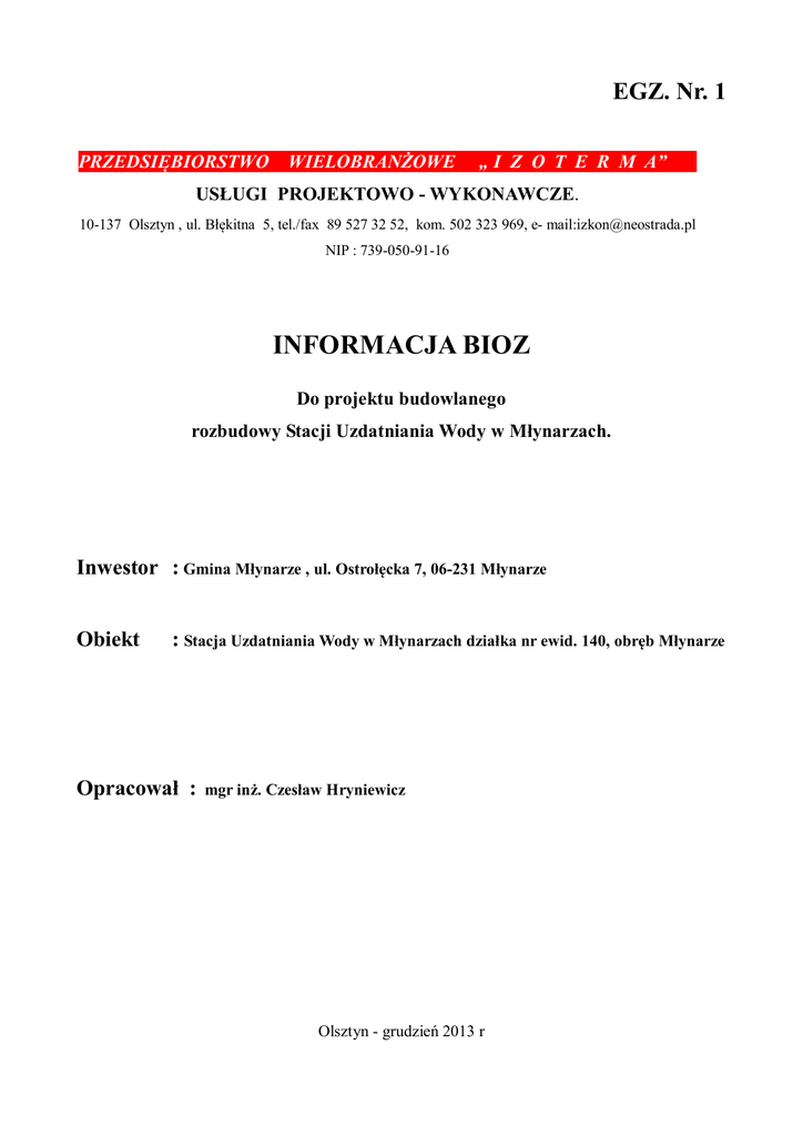 EGZ. Nr. 1 PRZEDSIĘBIORSTWO WIELOBRANŻOWE „ I Z O T E R M A” USŁUGI PROJEKTOWO - WYKONAWCZE. 10-137 Olsztyn , ul. Błękitna 5, tel./fax 89 527 32 52, kom. 502 323 969, e- mail:[email protected] NIP : 739-050-91-16 N INFORMACJA BIOZ Do projektu budowlanego rozbudowy Stacji Uzdatniania Wody w Młynarzach. Inwestor : Gmina Młynarze , ul. Ostrołęcka 7, 06-231 Młynarze Obiekt : Stacja Uzdatniania Wody w Młynarzach działka nr ewid. 140, obręb Młynarze Opracował : mgr inż. Czesław Hryniewicz Olsztyn - grudzień 2013 r Informacja dotycząca bezpieczeństwa i ochrony zdrowia na placu budowy przy realizacji rozbudowy Stacji Uzdatniania Wody w Młynarzach Informację opracowano na podstawie ROZPORZĄDZENIA MINISTRA INFRASTRUKTURY z dnia 23czerwca 2003r. w sprawie informacji dotyczącej bezpieczeństwa i ochrony zdrowia oraz planu bezpieczeństwa i ochrony zdrowia (Dz. U. 2003 Nr. 120, poz. 1126) 1. Zakres robót Projektuje się modernizację i rozbudowę SUW w Młynarzach. Podczas realizacji inwestycji wykonywane będą: Roboty ziemne Roboty fundamentowe Roboty betoniarskie Roboty zbrojarskie Roboty ciesielskie i dekarskie Roboty transportowe i rozładunkowe Roboty instalacyjne i montażowe Roboty elektryczne 2. Wykaz istniejących obiektów budowlanych Planowana inwestycja znajduje się na terenie zamkniętym SUW w Młynarzach. 3. Elementy zagospodarowania działki lub terenu, które mogą stwarzać zagrożenie bezpieczeństwa i zdrowia ludzi - Istniejące, aktualnie SUW - Istniejące przyłącza i instalacje Należy zachować szczególną ostrożność podczas prowadzenie robót. 4. Zagrożenia występujące podczas realizacji robót budowlanych - prowadzenia prac budowlanych w terenie dostępnym dla osób postronnych – konieczność zorganizowania placu budowy - wygrodzenie terenu budowy, urządzenie składowisk materiałów i wyrobów, utrzymywanie porządku na placu budowy, urządzenie pomieszczenia higieniczno – sanitarnego i socjalnego dla pracowników; roboty budowlane – wygrodzenia i zabezpieczenia miejsc niebezpiecznych oraz napisy ostrzegawcze, zabezpieczenie przed upadkiem z wysokości, zabezpieczenie przed upadkiem narzędzi z wysokości, drabiny zabezpieczyć przed poślizgiem i rozsunięciem się oraz zapewnić ich stabilność, stanowiska pracy powinny umożliwiać swobodę ruchu niezbędną do wykonywania pracy, maszyny i inne urządzenia techniczne oraz narzędzia zmechanizowane powinny być montowane, eksploatowane i obsługiwane zgodnie z instrukcją producenta oraz spełniać wymagania określone w przepisach dotyczących systemu oceny zgodności. - 4.1.Zabezpieczenie placu budowy: - - - teren budowy lub robót powinien być w miarę potrzeby zabezpieczony ogrodzeniem; ogrodzenie placu budowy powinno być tak wykonane, aby nie stwarzało zagrożenia dla ludzi; strefę niebezpieczną (miejsca niebezpieczne), w której istnieje źródło zagrożenia, np. z powodu możliwości spadania z góry przedmiotów lub materiałów, należy oznakować i ogrodzić poręczami bądź zabezpieczyć daszkami ochronnymi, strefa niebezpieczna nie może wynosić mniej niż 1/10 wysokości, z której mogą spadać przedmioty lub materiały – jednak nie mniej niż 6 m; daszki ochronne powinny znajdować się na wysokości nie mniejszej niż 2,4 m od terenu i ze spadkiem 45° w kierunku źródła zagrożenia, pokrycie daszków powinno być szczelne i dostatecznie wytrzymałe na przebicie przez spadające przedmioty, używanie daszków ochronnych jako rusztowań lub miejsc składowania narzędzi, sprzętu, materiałów itp. jest zabronione, w miejscach przejść i przejazdów szerokość daszka ochronnego powinna wynosić, co najmniej o 1 m więcej niż szerokość przejścia lub przejazdu; przejścia i miejsca niebezpieczne powinny być oznakowane znakami ostrzegawczymi lub znakami zakazu oraz dobrze oświetlone; na placu budowy powinny być wyznaczone miejsca do składowania materiałów. 4.2. Prace na wysokości: - - - - rusztowania powinny: posiadać pomost o powierzchni roboczej wystarczającej dla zatrudnionych oraz składowania narzędzi i niezbędnej ilości materiałów, posiadać konstrukcję dostosowana do przeniesienia działających obciążeń, zapewniać bezpieczną komunikację pionową i swobodny dostęp do stanowisk pracy, stwarzać możliwość wykonywania pracy w pozycji niepowodującej nadmiernego wysiłku; rusztowania typowe powinny być wykonane zgodnie z wymaganiami norm, rusztowania nietypowe powinny być wykonane zgodnie z projektem, rusztowania inwentaryzowane powinny być zaopatrzone w atest wytwórni, a ich montaż powinien być dokonywany zgodnie z instrukcją producenta; pracownicy zatrudnieni przy ustawianiu i rozbiórce rusztowań powinni być przeszkoleni w zakresie wykonywania danego rodzaju rusztowań; przy wykonywaniu robót na wysokości pracownicy powinni być zabezpieczeni pasami ochronnymi i linką umocowana do stałych elementów konstrukcji budowli lub wznoszonych (rozbieranych) rusztowań; przy wznoszeniu lub rozbiórce rusztowań należy wyznaczyć strefę niebezpieczną i zabezpieczyć ją; użytkowanie rusztowania dopuszczalne jest po dokonaniu jego odbioru przez nadzór techniczny, potwierdzonego zapisem w dzienniku budowy; wchodzenie i schodzenie z rusztowań powinno odbywać się w miejscach do tego przeznaczonych; pozostawianie narzędzi przy krawędziach pomostów rusztowań jest zabronione; rusztowanie z rur stalowych powinno być uziemione i posiadać instalacje odgromową. 4.3. Zalecenia ogólne: - przy pracach budowlanych może być zatrudniony wyłącznie pracownik, który: posiada kwalifikacje przewidziane odrębnymi przepisami dla danego stanowiska, uzyskał - - - - - 5. orzeczenie lekarskie o dopuszczeniu do określonej pracy, nie wolno zatrudniać pracownika na danym stanowisku pracy w razie przeciwwskazań lekarskich oraz bez wstępnego przeszkolenia w zakresie bezpieczeństwa i higieny pracy; użytkowanie i posł