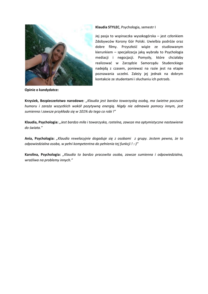 Klaudia STYLEC, Psychologia, semestr I Jej pasja to wspinaczka wysokogórska – jest członkiem Zdobywców Korony Gór Polski. Uwielbia podróże oraz dobre filmy. Przyszłość wiąże ze studiowanym kierunkiem – specjalizacja jaką wybrała to Psychologia mediacji i negocjacji. Pomysły, które chciałaby realizować w Zarządzie Samorządu Studenckiego nadejdą z czasem, ponieważ na razie jest na etapie poznawania uczelni. Zależy jej jednak na dobrym kontakcie ze studentami i słuchaniu ich potrzeb. Opinie o kandydatce: Krzysiek, Bezpieczeństwo narodowe: „Klaudia jest bardzo towarzyską osobą, ma świetne poczucie humoru i zaraża wszystkich wokół pozytywną energią. Nigdy nie odmawia pomocy innym, jest sumienna i zawsze przykłada się w 101% do tego co robi !” Klaudia, Psychologia: „Jest bardzo miła i towarzyska, rzetelna, zawsze ma optymistyczne nastawienie do świata.” Ania, Psychologia: „Klaudia rewelacyjnie dogaduje się z osobami z grupy. Jestem pewna, że to odpowiedzialna osoba, w pełni kompetentna do pełnienia tej funkcji ! :-)” Karolina, Psychologia: „Klaudia to bardzo pracowita osoba, zawsze sumienna i odpowiedzialna, wrażliwa na problemy innych.”