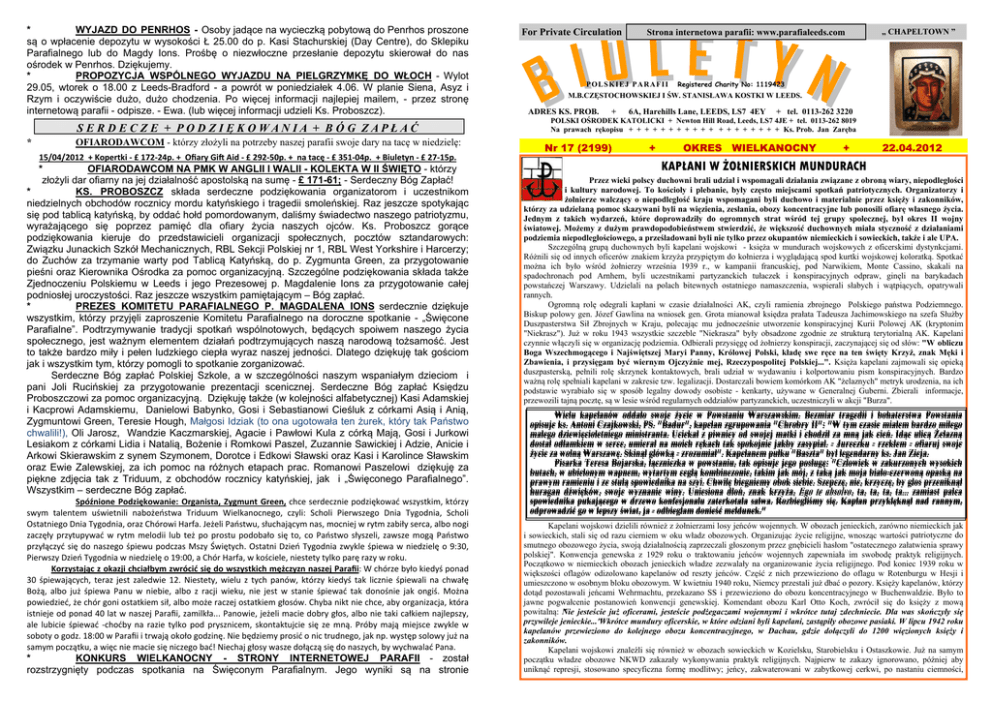 * WYJAZD DO PENRHOS - Osoby jadące na wycieczką pobytową do Penrhos proszone są o wpłacenie depozytu w wysokości Ł 25.00 do p. Kasi Stachurskiej (Day Centre), do Sklepiku Parafialnego lub do Magdy Ions. Prośbę o niezwłoczne przesłanie depozytu skierował do nas ośrodek w Penrhos. Dziękujemy. * PROPOZYCJA WSPÓLNEGO WYJAZDU NA PIELGRZYMKĘ DO WŁOCH - Wylot 29.05, wtorek o 18.00 z Leeds-Bradford - a powrót w poniedziałek 4.06. W planie Siena, Asyz i Rzym i oczywiście dużo, dużo chodzenia. Po więcej informacji najlepiej mailem, - przez stronę internetową parafii - odpisze. - Ewa. (lub więcej informacji udzieli Ks. Proboszcz). SERDECZE + PODZI ĘKOWANIA + BÓG ZAPŁAĆ * OFIARODAWCOM - którzy złożyli na potrzeby naszej parafii swoje dary na tacę w niedzielę: 15/04/2012 + Kopertki ‐ £ 172‐24p. + Ofiary Gi Aid ‐ £ 292‐50p. + na tacę ‐ £ 351‐04p. + Biuletyn ‐ £ 27‐15p. * OFIARODAWCOM NA PMK W ANGLII I WALII - KOLEKTA W II ŚWIĘTO - którzy złożyli dar ofiarny na jej działalność apostolską na sumę - £ 171-61; - Serdeczny Bóg Zapłać! * KS. PROBOSZCZ składa serdeczne podziękowania organizatorom i uczestnikom niedzielnych obchodów rocznicy mordu katyńskiego i tragedii smoleńskiej. Raz jeszcze spotykając się pod tablicą katyńską, by oddać hołd pomordowanym, daliśmy świadectwo naszego patriotyzmu, wyrażającego się poprzez pamięć dla ofiary życia naszych ojców. Ks. Proboszcz gorące podziękowania kieruje do przedstawicieli organizacji społecznych, pocztów sztandarowych: Związku Junackich Szkół Mechanicznych, RBL Sekcji Polskiej nr 1, RBL West Yorkshire i Harcerzy; do Zuchów za trzymanie warty pod Tablicą Katyńską, do p. Zygmunta Green, za przygotowanie pieśni oraz Kierownika Ośrodka za pomoc organizacyjną. Szczególne podziękowania składa także Zjednoczeniu Polskiemu w Leeds i jego Prezesowej p. Magdalenie Ions za przygotowanie całej podniosłej uroczystości. Raz jeszcze wszystkim pamiętającym – Bóg zapłać. * PREZES KOMITETU PARAFIALNEGO P. MAGDALENA IONS serdecznie dziękuje wszystkim, którzy przyjęli zaproszenie Komitetu Parafialnego na doroczne spotkanie - „Święcone Parafialne”. Podtrzymywanie tradycji spotkań wspólnotowych, będących spoiwem naszego życia społecznego, jest ważnym elementem działań podtrzymujących naszą narodową tożsamość. Jest to także bardzo miły i pełen ludzkiego ciepła wyraz naszej jedności. Dlatego dziękuję tak gościom jak i wszystkim tym, którzy pomogli to spotkanie zorganizować. Serdeczne Bóg zapłać Polskiej Szkole, a w szczególności naszym wspaniałym dzieciom i pani Joli Rucińskiej za przygotowanie prezentacji scenicznej. Serdeczne Bóg zapłać Księdzu Proboszczowi za pomoc organizacyjną. Dziękuję także (w kolejności alfabetycznej) Kasi Adamskiej i Kacprowi Adamskiemu, Danielowi Babynko, Gosi i Sebastianowi Cieśluk z córkami Asią i Anią, Zygmuntowi Green, Teresie Hough, Małgosi Idziak (to ona ugotowała ten żurek, który tak Państwo chwalili!), Oli Jarosz, Wandzie Kaczmarskiej, Agacie i Pawłowi Kula z córką Mają, Gosi i Jurkowi Lesiakom z córkami Lidia i Natalią, Bożenie i Romkowi Paszel, Zuzannie Sawickiej i Adzie, Anicie i Arkowi Skierawskim z synem Szymonem, Dorotce i Edkowi Sławski oraz Kasi i Karolince Sławskim oraz Ewie Zalewskiej, za ich pomoc na różnych etapach prac. Romanowi Paszelowi dziękuję za piękne zdjęcia tak z Triduum, z obchodów rocznicy katyńskiej, jak i „Święconego Parafialnego”. Wszystkim – serdeczne Bóg zapłać. Spóźnione Podziękowanie: Organista, Zygmunt Green, chce serdecznie podziękować wszystkim, którzy swym talentem uświetnili nabożeństwa Triduum Wielkanocnego, czyli: Scholi Pierwszego Dnia Tygodnia, Scholi Ostatniego Dnia Tygodnia, oraz Chórowi Harfa. Jeżeli Państwu, słuchającym nas, mocniej w rytm zabiły serca, albo nogi zaczęły przytupywać w rytm melodii lub też po prostu podobało się to, co Państwo słyszeli, zawsze mogą Państwo przyłączyć się do naszego śpiewu podczas Mszy Świętych. Ostatni Dzień Tygodnia zwykle śpiewa w niedzielę o 9:30, Pierwszy Dzień Tygodnia w niedzielę o 19:00, a Chór Harfa, w kościele, niestety tylko parę razy w roku. Korzystając z okazji chciałbym zwrócić się do wszystkich mężczyzn naszej Parafii: W chórze było kiedyś ponad 30 śpiewających, teraz jest zaledwie 12. Niestety, wielu z tych panów, którzy kiedyś tak licznie śpiewali na chwałę Bożą, albo już śpiewa Panu w niebie, albo z racji wieku, nie jest w stanie śpiewać tak donośnie jak ongiś. Można powiedzieć, że chór goni ostatkiem sił, albo może raczej ostatkiem głosów. Chyba nikt nie chce, aby organizacja, która istnieje od ponad 40 lat w naszej Parafii, zamilkła... Panowie, jeżeli macie dobry głos, albo nie taki całkiem najlepszy, ale lubicie śpiewać ‐choćby na razie tylko pod prysznicem, skontaktujcie się ze mną. Próby mają miejsce zwykle w soboty o godz. 18:00 w Parafii i trwają około godzinę. Nie będziemy prosić o nic trudnego, jak np. występ solowy już na samym początku, a więc nie macie się niczego bać! Niechaj głosy wasze dołączą się do naszych, by wychwalać Pana. * KONKURS WIELKANOCNY - STRONY INTERNETOWEJ PARAFII - został rozstrzygnięty podczas spotkania na Święconym Parafialnym. Jego wyniki są na stronie For Private Circulation Strona internetowa parafii: www.parafialeeds.com „ CHAPELTOWN ” P O L S K I E J P A R A F I I Registered Charity No: 1119423 M.B.CZĘSTOCHOWSKIEJ I ŚW. STANISŁAWA KOSTKI W LEEDS. ADRES KS. PROB. + 6A, Harehills Lane, LEEDS, LS7 4EY + tel. 0113-262 3220 POLSKI OŚRODEK KATOLICKI + Newton Hill Road, Leeds, LS7 4JE + tel. 0113-262 8019 Na prawach rękopisu + + + + + + + + + + + + + + + + + + + Ks. Prob. Jan Zaręba Nr 17 (2199) + OKRES WIELKANOCNY + 22.04.2012 KAPŁANI W ŻOŁNIERSKICH MUNDURACH Przez wieki polscy duchowni brali udział i w