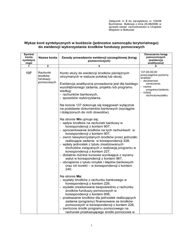 Załącznik nr 5 do zarządzenia nr 104/08 Burmistrza Bolkowa z dnia 25.082008r w sprawie zasad rachunkowości w Urzędzie Miejskim w Bolkowie Wykaz kont syntetycznych w budżecie (jednostce samorządu terytorialnego) do ewidencji wykorzystania środków funduszy pomocowych Symbol konta syntetycz nego 1 137 Nazwa konta Zasady prowadzenia ewidencji szczegółowej (ksiąg pomocniczych) 2 3 Rachunki środków funduszy pomocowych Konto służy do ewidencji środków pieniężnych otrzymanych w walucie polskiej lub obcej. Ewidencja analityczna prowadzona jest dla każdego wyodrębnionego zadania, projektu lub programu według: - rachunków bankowych, - sposobów wykorzystania. Na koncie 137 dokonuje się księgowań wyłącznie na podstawie dokumentów bankowych (wyciągów i dołączonych do nich dowodów). Na stronie Wn ujmuje się: - wpływ środków na rachunek bankowy w korespondencji z kontem 907, - oprocentowanie środków na tych rachunkach w korespondencji z kontem 907, - zwrot niewykorzystanych środków przez jednostki realizujące zadania w korespondencji 228, - wpłaty jednostek z tytułu zrealizowanych dochodów związanych z realizacją programu w korespondencji z kontem 227, - dodatnie różnice kursowe wynikające z wyceny walut w korespondencji z kontem 967, - obciążenia z tytułu omyłek i błędów bankowych oraz ich korekt – w korespondencji z kontem 240. Na stronie Ma: - wypłaty środków z rachunku bankowego w korespondencji z kontem 228, - wydatki zrealizowane bezpośrednio z rachunku środków funduszy pomocowych w korespondencji z kontem 908, - przekazanie środków dla jednostek realizujących zadania (programy) finansowane ze środków pomocowych w korespondencji z kontem 228, - zwrócone środki programu pomocowego na rachunek przekazującego środki pomocowe w 1 Oznaczenia ksiąg pomocniczych (ewidencja analityczna) 4 137-00-00-00 poszczególne poziomy analityki : - dwuliterowe oznaczenie, - nazwa programu/zadania, - rodzaj dochodu/wydatku korespondencji z kontem 907, - ujemne różnice kursowe wynikające z wyceny walut w korespondencji z kontem 967, - uznania z tytułu omyłek i błędów bankowych oraz ich korekt w korespondencji z kontem 240. 138 Rachunki Ewidencja szczegółowa jest prowadzona według: środków na - stanu środków dla każdego wyodrębnionego prefinansowarachunku bankowego dla danej umowy nie pożyczki, - sposobu wykorzystania. Typowe zapisy na stronie Wn: - wpływy środków z pożyczek zaciągniętych z budżetu państwa w korespondencji z kontem 268, - wpływy środków na spłatę pożyczek z budżetu UE (refundacja) w korespondencji z kontem 907, - wpływ środków z budżetu jst (wstrzymanie refundacji) w korespondencji z kontem 133. 138-00-00-00 poszczególne poziomy analityki : - dwuliterowe oznaczenie, - nazwa programu/zadania, - cel prowadzenia rachunku Zapisy strony Ma: - wykorzystanie pożyczek (wypłaty) na cele określone w przepisach/umowie pożyczek – konto przeciwstawne 228 lub 908, - spłata pożyczek z budżetu państwa w korespondencji z kontem 268. Na koncie 138 dokonuje się księgowań wyłącznie na podstawie dokumentów bankowych (wyciągów i dołączonych do nich dowodów). 227 Rozliczenie dochodów ze środków funduszy pomocowych Ewidencję szczegółową prowadzi się według poszczególnych programów pomocowych. Na konie 227 po stronie Wn ujmuje się: - dochody budżetowe pobrane przez jednostki realizujące programy finansowe ze środków fundusz pomocowych – konto przeciwstawne 907, - zwroty wydatków zaliczane do dochodów programu zwiększające środki pomocowe objęte sprawozdaniami o dochodach – konto przeciwstawne 907, - odsetki od rachunku bankowego – konto przeciwstawne 907, - odsetki podlegające przekazaniu na rachunek przekazującego – konto przeciwstawne 240, Na stronie Ma ujmuje się: - wpływy z tytułu dochodów zrealizowanych w trakcie realizacji programu pomocowego 2 227-00–00-00 wg poszczególnych programów zwiększające środki pomocowe do wykorzystania przez jednostkę (zapis przenoszący zrealizowane dochody: Wn 227, Ma 907) w korespondencji z kontem 137, - wpływy z tytułu zwrotów wydatków zaliczane do dochodów programu zwiększające środki pomocowe do wykorzystania przez jednostkę w korespondencji z kontem 137. 228 Rozliczenie wydatków ze środków funduszy pomocowych Zasady prowadzenia ewidencji analitycznej jak w przypadku konta 227. 228-00–00-00 wg poszczególnych programów Na stronie Wn konta 228 ujmuje się: - zapłata za zrealizowane zadanie w ramach programów (zapis przenoszący zrealizowane wydatki na podstawie sprawozdania o zrealizowanych wydatkach: Wn 908, Ma 228) – w korespondencji z kontem 137, - środki pomocowe przekazane do jednostek realizujących programy pomocowe na opłacenie zadań realizowanych w ramach programu (przelewy na wydatki) w korespondencji z kontem 137. Na stronie Ma ujmuje się: - wpływy z tytułu zwrotów wydatków nieuzasadnionych do sfinansowania ze środków programu podlegające przekazaniu na r-k przekazującego (zapis równoległy: Wn 223, Ma 240), - wpływy z tytułu zwrotów środków pomocowych przekazanych uprzednio jednostkom na realizację programów pomocowych – strona Wn konto 137. 240 Pozostałe rozrachunki 257 Należności z Ewidencję szczegółową prowadzi się według: tytułu - poszczególnych tytułów należności, prefinansowa- - poszczególnych kontrahentów. nia Ewidencję szczegółową prowadzi się według poszczególnych tytułów rozrachunków i roszczeń. Na koncie ewidencjonuje się w szczególności: - mylne obciążenia i uznania rachunków bankowych, - dochody podlegające odprowadzeniu podmiotowi finansującemu program, Na koncie ujmuje się: Wn – powstanie i zwiększenie należności finansowych z tytułu udzielonych pożyczek w ramach prefinansowania- odsetki od pożyczek. 3 Wykaz kont wg należności i zobowiązań dla kontrahenta, stanu niedoborów i szkód oraz roszczeń