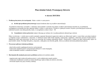 Plan działań Szkoły Promującej Zdrowie w okresie 2015/2016 1. Problem priorytetowy do rozwiązania: Hałas w szkole w czasie przerw. a) Krótki opis problemu priorytetowego (wpisać konkretne dane wg wyników autoewaluacji): Na podstawie obserwacji, wywiadów z rodzicami, nauczycielami i uczniami oraz analizy wyników autoewaluacji stwierdza się, że problemem wymagającym rozwiązania jest duże natężenie hałasu w szkole w czasie przerw. Wynika to z głośnych rozmów, krzyków, prowokacyjnych zachowań niektórych uczniów oraz dużej potrzeby ruchu, w szczególności u dzieci z klas I – III. b) Uzasadnienie wyboru priorytetu (wpisać: dlaczego go wybrano, kto i na jakiej podstawie dokonał tego wyboru): Hałas wywoływany w szkole przez uczniów pomiędzy zajęciami lekcyjnymi negatywnie wpływa na efektywność nauki w czasie lekcji, powoduje trudności w skupieniu uwagi, rozdrażnienie i zmęczenie. U młodszych dzieci hałas budzi niepokój, rozproszenie, zagubienie, zaburzenie poczucia bezpieczeństwa. Długotrwały hałas może przyczynić się nawet do czasowego lub trwałego uszkodzenia słuchu. Przebywanie w hałasie ma także niekorzystny wpływ na pracowników szkoły. Powoduje bóle głowy, zmęczenie, utratę głosu oraz choroby gardła, które są wynikiem mówienia podniesionym głosem. 2. Przyczyna/y główna/e istnienia problemu: - duża liczba uczniów spędzających przerwy na korytarzach, - konieczność spędzania przerw na korytarzach szkolnych w czasie niepogody, - niska świadomość uczniów o szkodliwości hałasu. 3. Rozwiązania dla usunięcia przyczyn/y problemu (podstawa do ustalenia zadań): - organizowanie zajęć ruchowych podczas przerw w celu rozładowania energii uczniów, - zwiększenie świadomości uczniów na temat szkodliwego wpływu hałasu na zdrowie człowieka, - stworzenie kącika ciszy przy świetlicy szkolnej. I. CEL: Przyjemna cisza wokół mnie – lubię to! Kryterium sukcesu: Zmniejszenie poziomu hałasu o 10% Sposób sprawdzenia czy osiągnięto cel (sukces): a) Co wskaże, że osiągnięto cel? - odczuwalnie niższy poziom hałasu i wyniki pomiaru, - wyniki badań ankietowych. b) Jak sprawdzimy, czy osiągnięto cel? - przeprowadzenie ankiety ewaluacyjnej, - obserwacja, - pomiar poziomu hałasu. c) Kto i kiedy sprawdzi, czy osiągnięto cel? - dyrektor szkoły, - koordynatorki SzPZ, - nauczyciele, - specjalista - pracownik Państwowej Inspekcji Sanitarnej. II. ZADANIA Nazwa zadania Sposób realizacji Sonometr Kwestionariusz Wyniki ankiety Ankiety, burza mózgów Wpis do dziennika 80% uczniów z klas II-VI udziela prawidłowych odpowiedzi Ankiety skierowane do uczniów, nauczycieli, pracowników niepedagogicznych IX 2015 r. V 2016 r. 97% obecnych uczniów uczestniczy w zajęciach Przedstawienie wyników ankiet, burza mózgów na temat zmniejszenia hałasu w szkole X 2015 r. 4.Zajęcia ruchowe podczas przerw 30 % uczniów przebywających na korytarzu- I piętro, uczestniczy w proponowanych zabawach Zabawy przy muzyce, harcerskie pląsy Od jesieni do wiosny z uwzględnieniem warunków pogodowych 5. Pogadanka na temat szkodliwego wpływu hałasu na zdrowie człowieka 95% obecnych uczniów uczestniczy w zajęciach Przekaz ustny, werbalny pogadanka X/XI 2015 r. Pielęgniarka szkolna Tablice multimedialne, plakaty Wyniki ankiety ewaluacyjnej przeprowadzonej w maju 2016r. 6. „Hałasowi STOP”: znaki graficzne, hasła Wykonanie przez każdą klasę jednego znaku graficznych i Znaki graficzne, hasła XI 2015 r. Kl. I-VI, nauczyciele kl. I-III oraz plastyki, techniki Środki plastyczne 20 znaków graficznych, 20 haseł rozmieszczonych na korytarzach szkolnych 2. Ankiety dotyczące hałasu 3. Zajęcia informacyjno edukacyjne dotyczące szkodliwości hałasu Wykonawcy/osoba odpowiedzialna Specjalista - pracownik Państwowej Inspekcji Sanitarnej Kl. II - VI (po jednej klasie z każdego poziomu). Osoba odpowiedzialna: n-l przyrody i edukacji wczesnoszkolnej, koordynator SzPZ Wychowawcy klas na naradzie wychowawczej Sposób sprawdzenia wykonania zadania Poziom hałasu - wynik pomiaru Pomiar za pomocą urządzenia 1. Pomiar natężenia hałasu Okres/termin realizacji IX 2015 r. Środki/zasoby Kryterium sukcesu Zmniejszenie hałasu o 10% Nauczyciel, Magnetofon, płyty Obserwacja prowadzona przez Drużynowa 131 dyżurujących nauczycieli Drużyny Harcerskiej, harcerze 7. "Kodeks ciszy w szkole" 8. „Kącik ciszy” przy świetlicy szkolnej 9. Dzień Bezpiecznego Internetu - prezentacja multimedialna nt."Hałas i jego skutki" 10. Transparenty na temat "Walka z hałasem" - konkurs 11. Happening z okazji Międzynarodowego Dnia Świadomego Zagrożenia Hałasem 12. Kontrolny pomiar natężenia hałasu opracowanie jednego hasła 100% uczniów zna Uczniowie klas III i VI z kodeks ciszy w wychowawcami opracowują szkole w wyniku dyskusji projekt kodeksu ciszy 10% dzieci Wykorzystanie korzysta pomieszczenia na relaks i codziennie z wypoczynek pomieszczenia 97% obecnych Prezentacja multimedialna uczniów uczestniczy w zajęciach XII 2015 r. Rok szkolny 2015/2016 Zespół Szkoły Promującej Zdrowie, klasowi koordynatorzy zdrowia Uczniowie, wychowawcy świetlicy Wypracowany kodeks ciszy Plansze z kodeksem dla każdej klasy Stoliki, krzesła, pufy, materac Lista obecności dzieci korzystających z pomieszczenia II 2016 r. Kl. V/VI, nauczyciel informatyki Komputer, programy komputerowe, Internet Przedstawienie przygotowanych prezentacji uczniom klas I-IV Wykonanie jednego transparentu z każdej klasy Uczestnicy marszu- 95% uczniów klas I-VI Prace plastyczno techniczne, technologia informacyjna III 2016 r. Kl. I-VI, wychowawcy Artykuły plastycznotechniczne Wystawa transparentów i ocena Marsz 25.04.2016 r. Cała społeczność szkolna Transparenty Fotorelacja, frekwencja w dzienniku elektronicznym Zmniejszenie poziomu natężenia hałasu Pomiar za pomocą urządzenia V 2016 r. Specjalista- pracownik Państwowej Inspekcji Sanitarnej Sonometr Mniejszy 