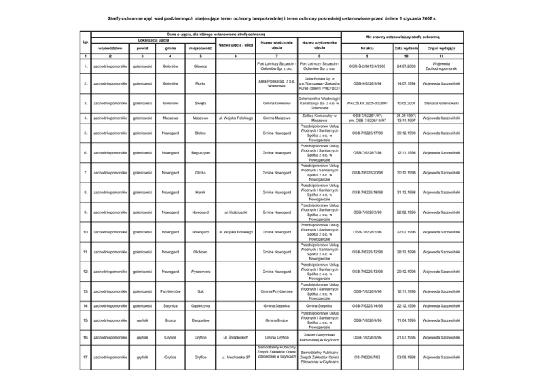 Strefy ochronne ujęć wód podziemnych obejmujące teren ochrony bezpośredniej i teren ochrony pośredniej ustanowione przed dniem 1 stycznia 2002 r. Dane o ujęciu, dla którego ustanowiono strefę ochronną Lokalizacja ujęcia Lp. Nazwa ujęcia / ulica Akt prawny ustanawiający strefę ochronną Nazwa właściciela ujęcia Nazwa użytkownika ujęcia Nr aktu Data wydania Organ wydający 7 8 9 10 11 OSR-Ś-2/6813/4/2000 24.07.2000 Wojewoda Zachodniopomorski województwo powiat gmina miejscowość 1 2 3 4 5 1. zachodniopomorskie goleniowski Goleniów Glewice 2. zachodniopomorskie goleniowski Goleniów Rurka Xella Polska Sp. z o.o. Warszawa Xella Polska Sp. z o.o.Warszawa - Zakład w Rurce /dawny PREFBET/ OSB-9/6226/9/94 14.07.1994 Wojewoda Szczeciński 3. zachodniopomorskie goleniowski Goleniów Święta Gmina Goleniów Goleniowskie Wodociągi i Kanalizacja Sp. z o.o. w Goleniowie WAiOŚ.KK.6225-02/2001 10.05.2001 Starosta Goleniowski 4. zachodniopomorskie goleniowski Maszewo Maszewo Gmina Maszewo Zakład Komunalny w Maszewie OSB-7/6226/1/97; zm. OSB-7/6226/10/97 21.01.1997; 13.11.1997 Wojewoda Szczeciński 5. zachodniopomorskie goleniowski Nowogard Błotno Gmina Nowogard Przedsiębiorstwo Usług Wodnych i Sanitarnych Spółka z o.o. w Nowogardzie OSB-7/6226/17/98 30.12.1998 Wojewoda Szczeciński Gmina Nowogard Przedsiębiorstwo Usług Wodnych i Sanitarnych Spółka z o.o. w Nowogardzie OSB-7/6226/7/98 12.11.1998 Wojewoda Szczeciński Gmina Nowogard Przedsiębiorstwo Usług Wodnych i Sanitarnych Spółka z o.o. w Nowogardzie OSB-7/6226/20/98 30.12.1998 Wojewoda Szczeciński Gmina Nowogard Przedsiębiorstwo Usług Wodnych i Sanitarnych Spółka z o.o. w Nowogardzie OSB-7/6226/18/98 31.12.1998 Wojewoda Szczeciński Gmina Nowogard Przedsiębiorstwo Usług Wodnych i Sanitarnych Spółka z o.o. w Nowogardzie OSB-7/6226/2/96 22.02.1996 Wojewoda Szczeciński Gmina Nowogard Przedsiębiorstwo Usług Wodnych i Sanitarnych Spółka z o.o. w Nowogardzie OSB-7/6226/2/96 22.02.1996 Wojewoda Szczeciński Gmina Nowogard Przedsiębiorstwo Usług Wodnych i Sanitarnych Spółka z o.o. w Nowogardzie OSB-7/6226/12/98 28.12.1998 Wojewoda Szczeciński Gmina Nowogard Przedsiębiorstwo Usług Wodnych i Sanitarnych Spółka z o.o. w Nowogardzie OSB-7/6226/13/98 29.12.1998 Wojewoda Szczeciński OSB-7/6226/6/98 12.11.1998 Wojewoda Szczeciński 6. 7. 8. 9. 10. 11. 12. zachodniopomorskie zachodniopomorskie zachodniopomorskie zachodniopomorskie zachodniopomorskie zachodniopomorskie zachodniopomorskie goleniowski goleniowski goleniowski goleniowski goleniowski goleniowski goleniowski Nowogard Nowogard Nowogard Nowogard Nowogard Nowogard Nowogard 6 Port Lotniczy Szczecin - Port Lotniczy Szczecin Goleniów Sp. z o.o. Goleniów Sp. z o.o. ul. Wojska Polskiego Boguszyce Glicko Karsk Nowogard Nowogard ul. Kościuszki ul. Wojska Polskiego Olchowo Wyszomierz 13. zachodniopomorskie goleniowski Przybiernów Buk Gmina Przybiernów Przedsiębiorstwo Usług Wodnych i Sanitarnych Spółka z o.o. w Nowogardzie 14. zachodniopomorskie goleniowski Stepnica Gąsierzyno Gmina Stepnica Gmina Stepnica OSB-7/6226/14/98 22.12.1998 Wojewoda Szczeciński Gmina Brojce Przedsiębiorstwo Usług Wodnych i Sanitarnych Spółka z o.o. w Nowogardzie OSB-7/6226/4/95 11.04.1995 Wojewoda Szczeciński ul. Śniadeckich Gmina Gryfice Zakład Gospodarki Komunalnej w Gryficach OSB-7/6226/8/95 21.07.1995 Wojewoda Szczeciński ul. Niechorska 27 Samodzielny Publiczny Zespół Zakładów Opieki Zdrowotnej w Gryficach Samodzielny Publiczny Zespół Zakładów Opieki Zdrowotnej w Gryficach OS-7/6226/7/93 03.08.1993 Wojewoda Szczeciński 15. zachodniopomorskie gryficki Brojce Dargosław 16. zachodniopomorskie gryficki Gryfice Gryfice 17. zachodniopomorskie gryficki Gryfice Gryfice Dane o ujęciu, dla którego ustanowiono strefę ochronną Lokalizacja ujęcia Lp. Nazwa ujęcia / ulica województwo powiat gmina miejscowość 1 2 3 4 5 18. zachodniopomorskie gryficki Gryfice Prusinowo 19. zachodniopomorskie gryficki Płoty Płoty 6 ul. Ogrodowa Akt prawny ustanawiający strefę ochronną Nazwa właściciela ujęcia Nazwa użytkownika ujęcia Nr aktu Data wydania Organ wydający 7 8 9 10 11 Gmina Gryfice Zakład Gospodarki Komunalnej w Gryficach OSB-7/6226/9/98 04.12.1998 Wojewoda Szczeciński Gmina Płoty Zakład Gospodarki Komunalnej i Mieszkaniowej w Płotach OSB-7/6226/5/97; zm. RLiOŚ 6220/10/00 05.05.1997; 26.10.2000 Wojewoda Szczeciński; Starosta Gryficki RLiOŚ.6220/5/00 13.03.2000 Starosta Gryficki 20. zachodniopomorskie gryficki Rewal Rewal; Śliwin Gmina Rewal Wodociągi Rewal Sp. z o.o. Ul. Poznańska 31 72-346 Pobierowo 21. zachodniopomorskie gryficki Rewal Trzęsacz Gmina Rewal Zakład Wodociągów i Kanalizacji w Pobierowie RLiOŚ-6223/15/99 14.05.1999 Starosta Gryficki 22. zachodniopomorskie gryficki Trzebiatów Gorzysław osoba prywatna osoba prywatna OSB-7/6226/4/94 08.03.1994 Wojewoda Szczeciński 23. zachodniopomorskie gryficki Trzebiatów Trzebiatów Gmina Trzebiatów Zakład Wodociągów i Kanalizacji w Trzebiatowie OSB-7/6226/15/95 23.10.1995 Wojewoda Szczeciński 24. zachodniopomorskie gryficki Trzebiatów Trzebiatów Polski Koncern Naftowy ORLEN S.A. w Płocku Polski Koncern Naftowy ORLEN S.A. w Płocku OS-7/6226/5/93 19.07.1993 Wojewoda Szczeciński 25. zachodniopomorskie gryfiński Cedynia Osinów Dolny Gmina Cedynia Wodociągi Zachodniopomorskie Sp. z o.o. w Goleniowie OSB-9/6226/5/95 30.06.1995 Wojewoda Szczeciński TEXAS RANCH COMPANY Sp. z o.o. Koszewko 13 73-102 Stargard Szcz. TEXAS RANCH COMPANY Sp. z o.o. Koszewko 13 73102 Stargard Szcz. OSB-9/6226/5/94 07.03.1994 Wojewoda Szczeciński ul. Pietruszkowa 1 26. zachodniopomorskie gryfiński Chojna Chojna Elewator Zbożowy, ul. Kopernika 27. zachodniopomorskie gryfiński Gryfino Dębce Dębce-Żabnica Gmina Gryfino Przedsiębiorstwo Usług Komunalnych Spółka z o.o. w Gryfinie Uchwała Nr XXVII/313/2001 21.12.2001 Rada Powiatu w Gryfinie 28. zachodniopomorskie gryfiński Gryfino Gryfino
