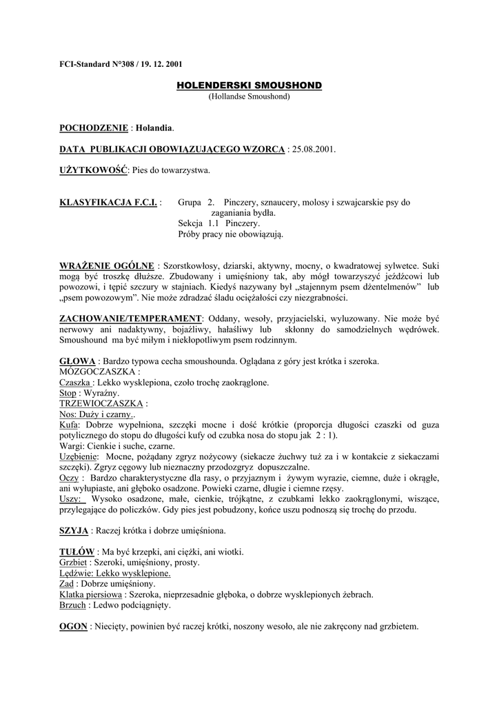 FCI-Standard N°308 / 19. 12. 2001 HOLENDERSKI SMOUSHOND (Hollandse Smoushond) POCHODZENIE : Holandia. DATA PUBLIKACJI OBOWIĄZUJĄCEGO WZORCA : 25.08.2001. UŻYTKOWOŚĆ: Pies do towarzystwa. KLASYFIKACJA F.C.I. : Grupa 2. Pinczery, sznaucery, molosy i szwajcarskie psy do zaganiania bydła. Sekcja 1.1 Pinczery. Próby pracy nie obowiązują. WRAŻENIE OGÓLNE : Szorstkowłosy, dziarski, aktywny, mocny, o kwadratowej sylwetce. Suki mogą być troszkę dłuższe. Zbudowany i umięśniony tak, aby mógł towarzyszyć jeźdźcowi lub powozowi, i tępić szczury w stajniach. Kiedyś nazywany był „stajennym psem dżentelmenów” lub „psem powozowym”. Nie może zdradzać śladu ociężałości czy niezgrabności. ZACHOWANIE/TEMPERAMENT: Oddany, wesoły, przyjacielski, wyluzowany. Nie może być nerwowy ani nadaktywny, bojaźliwy, hałaśliwy lub skłonny do samodzielnych wędrówek. Smoushound ma być miłym i niekłopotliwym psem rodzinnym. GŁOWA : Bardzo typowa cecha smoushounda. Oglądana z góry jest krótka i szeroka. MÓZGOCZASZKA : Czaszka : Lekko wysklepiona, czoło trochę zaokrąglone. Stop : Wyraźny. TRZEWIOCZASZKA : Nos: Duży i czarny.. Kufa: Dobrze wypełniona, szczęki mocne i dość krótkie (proporcja długości czaszki od guza potylicznego do stopu do długości kufy od czubka nosa do stopu jak 2 : 1). Wargi: Cienkie i suche, czarne. Uzębienie: Mocne, pożądany zgryz nożycowy (siekacze żuchwy tuż za i w kontakcie z siekaczami szczęki). Zgryz cęgowy lub nieznaczny przodozgryz dopuszczalne. Oczy : Bardzo charakterystyczne dla rasy, o przyjaznym i żywym wyrazie, ciemne, duże i okrągłe, ani wyłupiaste, ani głęboko osadzone. Powieki czarne, długie i ciemne rzęsy. Uszy: Wysoko osadzone, małe, cienkie, trójkątne, z czubkami lekko zaokrąglonymi, wiszące, przylegające do policzków. Gdy pies jest pobudzony, końce uszu podnoszą się trochę do przodu. SZYJA : Raczej krótka i dobrze umięśniona. TUŁÓW : Ma być krzepki, ani ciężki, ani wiotki. Grzbiet : Szeroki, umięśniony, prosty. Lędźwie: Lekko wysklepione. Zad : Dobrze umięśniony. Klatka piersiowa : Szeroka, nieprzesadnie głęboka, o dobrze wysklepionych żebrach. Brzuch : Ledwo podciągnięty. OGON : Niecięty, powinien być raczej krótki, noszony wesoło, ale nie zakręcony nad grzbietem. KOŃCZYNY KOŃCZYNY PRZEDNIE : Proste, nie za wąsko ustawione, ale jednocześnie dobrze pod tułowiem. Kościec mocny, owalny. Łopatka: Umiarkowanie ukośnie ułożona, stosownie do umiarkowanego kątowania kończyn. KOŃCZYNY TYLNE: Umiarkowanie kątowane, mocne i dobrze umięśnione. Staw skokowy: Niski. Łapy : Okrągle, zwarte, małe, z mocnymi palcami i czarnymi pazurami. SZATA SIERŚĆ: Bardzo ważna cecha: Na tułowiu: Gruba, szorstka, twarda, prosta o nieporządnym wyglądzie, długości około 4 – 7 cm. Nie może być kędzierzawa, falista ani wełnista; skłonność do kołtunienia jest poważną wadą. Podszerstek na tyle obfity, by chronił przed niepogodą. Przedziałek na grzbiecie wskazuje, że włos jest zbyt długi, miękki, a podszerstek nie dość obfity. Na kończynach : Średniej długości, niezbyt gęsta, włos układa się ku tyłowi, dając wrażenie niewielkich piór. Wada: sierść na kończynach gęsta i wełnista, zacierająca ich kształt. Na ogonie : Kraczasta, nie tworzy pióra. Na głowie: Równie twarda, jak na tułowiu, ale krótsza, przynajmniej na czaszce. Dłuższe wąsy, broda, brwi i sierść na policzkach. Brwi mogą trochę opadać na oczy, ale nie mogą ich przykrywać ani utrudniać. Wadą jest czub na głowie i włos, rozdzielający się kufie na boki. Sierść na uszach krótsza, niż na tułowiu. MAŚĆ : Jednolita żółta w różnych odcieniach, preferowany odcień ciemnej słomy. Uszy, wąsy, broad i brwi mogą byc w ciemniejszym odcieniu żółtego. Jakakolwiek inna maść jest niedopuszczalna. WIELKOŚĆ I WAGA: Wysokość w kłębie między 35 a 42 cm; psy około 37 – 42 cm, suki około 35 – 42 cm. Waga : 9-10 kg. WADY : Wszelkie odchylenia od podanego wzorca powinny być uznane za wady i oceniane w zależności od stopnia nasilenia i wpływu na zdrowie i sprawność psa. Każdy pies o nienormalnej budowie i/lub przejawiający zaburzenia zachowania powinien być zdyskwalifikowany. N.B. : Samce muszą mieć dwa normalnie wykształcone jądra, w pełni wyczuwalne w mosznie.