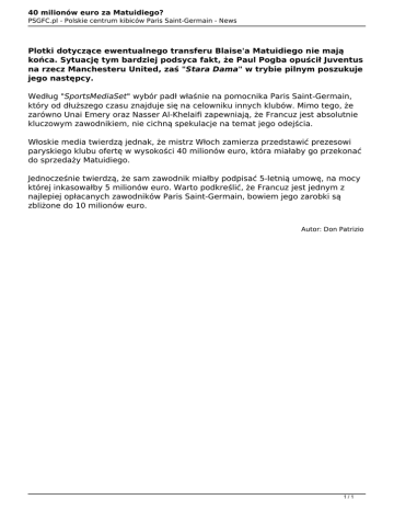 40 milionów euro za Matuidiego? PSGFC.pl - Polskie centrum kibiców Paris Saint-Germain - News Plotki dotyczące ewentualnego transferu Blaise'a Matuidiego nie mają końca. Sytuację tym bardziej podsyca fakt, że Paul Pogba opuścił Juventus na rzecz Manchesteru United, zaś "Stara Dama" w trybie pilnym poszukuje jego następcy. Według "SportsMediaSet" wybór padł właśnie na pomocnika Paris Saint-Germain, który od dłuższego czasu znajduje się na celowniku innych klubów. Mimo tego, że zarówno Unai Emery oraz Nasser Al-Khelaifi zapewniają, że Francuz jest absolutnie kluczowym zawodnikiem, nie cichną spekulacje na temat jego odejścia. Włoskie media twierdzą jednak, że mistrz Włoch zamierza przedstawić prezesowi paryskiego klubu ofertę w wysokości 40 milionów euro, która miałaby go przekonać do sprzedaży Matuidiego. Jednocześnie twierdzą, że sam zawodnik miałby podpisać 5-letnią umowę, na mocy której inkasowałby 5 milionów euro. Warto podkreślić, że Francuz jest jednym z najlepiej opłacanych zawodników Paris Saint-Germain, bowiem jego zarobki są zbliżone do 10 milionów euro. Autor: Don Patrizio 1/1 Powered by TCPDF (www.tcpdf.org)