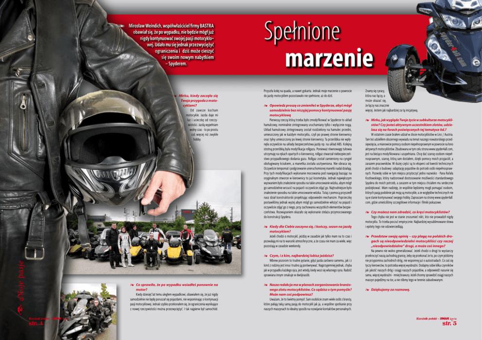 Mirosław Weindich, współwłaściciel firmy BASTRA obawiał się, że po wypadku, nie będzie mógł już nigdy kontynuować swojej pasji motocyklowej. Udało mu się jednak przezwyciężyć ograniczenia i dziś może cieszyć się swoim nowym nabytkiem – Spyderem. Mirku, kiedy zaczęła się Twoja przygoda z motocyklami? Od zawsze kocham motocykle. Jazda daje mi luz i ucieczkę od rzeczywistości. Jazdą wypełniam wolny czas - to po prostu coś więcej niż zwykłe hobby. Spełnione marzenie Przyszła kolej na quada, a nawet gokarta. Jednak moje marzenie o powrocie do jazdy motocyklem pozostawało nie spełnione, aż do dziś. Opowiedz proszę co zmieniłeś w Spyderze, abyś mógł samodzielnie bez niczyjej pomocy kontynuować pasję motocyklową Pierwszą rzeczą którą trzeba było zmodyfikować w Spyderze to układ hamulcowy, nominalnie zintegrowany uruchamiany tylko i wyłącznie nogą. Układ hamulcowy zintegrowany został rozdzielony na hamulec przedni, umieszczony jak w każdym motocyklu, czyli po prawej stronie kierownicy oraz tylny umieszczony po lewej stronie kierownicy. Ta przeróbka nie wpłynęła oczywiście na układy bezpieczeństwa jazdy np. na układ ABS. Kolejną istotną przeróbką była modyfikacja rollgazu. Ponieważ równowagę tułowia utrzymuję na rękach opartych o kierownicę, rollgaz stwarzał niebezpieczeństwo przypadkowego dodania gazu. Rollgaz został zamieniony na cyngiel obsługiwany kciukiem, a manetka została usztywniona. Nie obraca się. Oczywiście tempomat i podgrzewanie unieruchomionej manetki nadal działają. Przy tych modyfikacjach wykonanie mocowania pod nawigację bazując na oryginalnym otworze w kierownicy to już kosmetyka. Jednak największym wyzwaniem było znalezienie sposobu na takie umocowanie wózka, abym mógł go samodzielnie wrzucić na pojazd i oczywiście zdjąć go. Najtrudniejsze było znalezienie sposobu na takie umocowanie wózka. Tutaj z pomocą przyszedł nasz dział konstruktorski projektując odpowiedni mechanizm. Poprzeczkę postawiliśmy jednak wyżej abym mógł go samodzielnie włożyć na pojazd i oczywiście zdjąć go z niego, przy zachowaniu wszystkich elementów bezpieczeństwa. Rozwiązaniem okazało się wykonanie stelażu przymocowanego do konstrukcji Spydera. Kiedy dla Ciebie zaczyna się, i kończy, sezon na jazdę motocyklem? Jeżeli chodzi o motocykl, jeżdżę w zasadzie jak tylko mam na to czas i pozwalają mi na to warunki atmosferyczne, a że czasu nie mam za wiele, więc pozostają w zasadzie weekendy. s Moje pasje Czym, i z kim, najbardziej lubisz jeździsz? Wbrew pozorom to trudne pytanie, gdyż jazda zarówno samemu, jak i z kimś z rodziny jest inna i trudno ją porównywać. Najprzyjemniej jednak, chyba jak w przypadku każdego ojca, jest wtedy, kiedy wozi się własnego syna. Radość sprawiana innym smakuje w dwójnasób. Co sprawiło, że po wypadku wsiadłeś ponownie na motor? Kiedy dziesięć lat temu uległem wypadkowi, obawiałem się, że już nigdy samodzielnie nie będę poruszał się pojazdami, nie wspominając o kontynuacji pasji motocyklowej. Jednak szybko przekonałem się, że ograniczenia wynikające z nowej rzeczywistości można przezwyciężyć. I tak najpierw był samochód. Rzeźnik polski – SMAK str. życia Nasza redakcja ma w planach zorganizowanie branżowego zlotu motocyklistów. Co sądzisz o tym pomyśle? Może nam coś podpowiesz? Uważam, że to świetny pomysł. Sam osobiście znam wiele osób z branży, które pałają taką samą pasją do motocykli jak ja, a wspólne spotkanie przy naszych maszynach to idealny sposób na rozwijanie kontaktów personalnych. Znamy się z pracy, która nas łączy, a może okazać się, że łączy nas znacznie więcej. Jestem jak najbardziej za tą inicjatywą. Mirku, jak wygląda Twoje życie w subkulturze motocyklistów? Czy jesteś aktywnym uczestnikiem zlotów, udzielasz się na forach poświęconych tej tematyce itd.? W ostatnim czasie brałem udział w zlocie motocyklistów w Linz / Austria. Tam też udzieliłem obszernego wywiadu na temat naszego nowatorskiego przedsięwzięcia, a mianowicie pomocy osobom niepełnosprawnym w powrocie na łono aktywnych motocyklistów. Zbudowana w tym celu strona www.spyder4all.com, jest na bieżąco modyfikowana i uzupełniana. Chcę dać szansę osobom niepełnosprawnym, szansę, którą sam dostałem, dzięki pomocy moich przyjaciół, a zarazem pracowników. W dużej części są to eksperci od kwestii technicznych jeżeli chodzi o budowę i adaptację pojazdów do potrzeb osób niepełnosprawnych. Pozwolę sobie w tym miejscu przytoczyć jedno nazwisko - Pana Rafała Kozłowskiego, który nadzorował dostosowanie możliwości standardowego Spydera do moich potrzeb, a zarazem w tym miejscu chciałem mu serdecznie podziękować. Mam nadzieję, że wspólnie będziemy mogli pomagać osobom, których pasją podobnie jak moją są motocykle, a ze względów technicznych nie są w stanie kontynuować swojego hobby. Zapraszam na stronę www.spyder4all. com, gdzie umieściliśmy szczegółowe informacje i filmiki pokazowe. Czy możesz nam zdradzić, co kręci motocyklistów? Tego chyba nie jest w stanie zrozumieć nikt, kto nie prowadził nigdy motocyklu. To trzeba poczuć empirycznie. Najbardziej wysublimowane słowa i epitety tego nie odzwierciedlają. Przedstaw swoją opinię – czy plagą na polskich drogach są nieodpowiedzialni motocykliści czy raczej „nieodpowiedzialne” drogi, a może coś innego? Na pewno nie wolno generalizować. Jeżeli chodzi o drogi to wystarczy przekroczyć naszą zachodnią granicę, żeby się przekonać że to, po czym jeździmy nie przypomina zachodnich dróg, nie wspomnę już o autostradach. Co zaś się tyczy kierowców, to potrzeba więcej wyobraźni. Dodajmy sobie kilka czynników jak jakość naszych dróg i osiągi naszych pojazdów, a odpowiedź nasunie się sama, więcej wyobraźni - mniej brawury. Jeżeli chcemy sprawdzić osiągi n