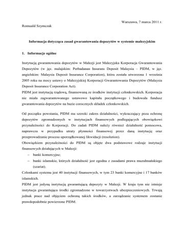 Warszawa, 7 marca 2011 r. Romuald Szymczak Informacja dotycząca zasad gwarantowania depozytów w systemie malezyjskim 1. Informacje ogólne Instytucją gwarantowania depozytów w Malezji jest Malezyjska Korporacja Gwarantowania Depozytów (w jęz. malajskim: Perbadanan Insurans Deposit Malaysia – PIDM, w jęz. angielskim: Malaysia Deposit Insurance Corporation), która została utworzona 1 września 2005 roku na mocy ustawy o Malezyjskiej Korporacji Gwarantowania Depozytów (Malaysia Deposit Insurance Corporation Act). PIDM jest instytucją rządową, finansowaną ze środków instytucji członkowskich. Korporacja nie miała zagwarantowanego ustawowo kapitału początkowego i budowała fundusz gwarantowania depozytów na bazie corocznych składek członkowskich. Od początku powstania, PIDM ma szeroki zakres działalności, wykraczający poza ochronę depozytów zgromadzonych w instytucjach finansowych podlegających obowiązkowi przynaleŜności do Korporacji. Do zadań PIDM naleŜy równieŜ działalność pomocowa, naprawcza w przypadku utraty płynności finansowej przez daną instytucję oraz przeprowadzanie procesu uporządkowanej likwidacji (resolution). Obowiązkiem przynaleŜności do PIDM są objęte dwa podstawowe rodzaje instytucji finansowych działających w Malezji: − banki komercyjne; − banki islamskie, których działalność jest zgodna z zasadami prawa muzułmańskiego (szariat). Członkami systemu jest 40 instytucji finansowych, w tym 23 banki komercyjne i 17 banków islamskich. PIDM jest jedyną instytucją gwarantującą depozyty w Malezji. W kraju tym nie istnieje instytucja gwarantująca środki zgromadzone w towarzystwach ubezpieczeniowych. Trwają jednak prace nad objęciem ochroną takich środków, a zarządzanie systemem zostanie prawdopodobnie powierzone PIDM. Malezyjska Korporacja Gwarantowania Depozytów zatrudnia około 80 pracowników. Biuro PIDM składa się z sześciu departamentów: • gwarantowania, oceny ryzyka i monitoringu, • komunikacji, • finansów i administracji, • kadr, • strategii i współpracy zagranicznej oraz • prawnego. PIDM jest członkiem Międzynarodowego Stowarzyszenia Gwarantów Depozytów (IADI). Korporacja była w 2007 roku organizatorem Walnego Zgromadzenia Członków Stowarzyszenia i dorocznej konferencji międzynarodowej w Kuala Lumpur. 2. Organy decyzyjne Na mocy ustawy o Malezyjskiej Korporacji Gwarantowania Depozytów organami PIDM jest Rada Dyrektorów i Komitet Dyrektorów Wykonawczych, pełniący rolę zarządu. Organem decyzyjno-nadzorczym Korporacji, zatwierdzającym wszystkie istotne dla funkcjonowania i działalności PIDM uchwały jest Rada Dyrektorów. W jej skład wchodzi Przewodniczący PIDM, powoływany przez Ministra Finansów spośród osób o uznanym doświadczeniu w pracy w sektorze prywatnym, Gubernator banku centralnego Malezji (Bank Negara Malaysia), sekretarz generalny Ministerstwa Skarbu, dyrektor będący przedstawicielem sektora publicznego, mianowany przez Ministra Finansów oraz nie więcej, niŜ trzech mianowanych przez Ministra Finansów dyrektorów legitymujących się doświadczeniem w pracy w sektorze prywatnym, przy czym co najmniej jeden z nich musi mieć doświadczenie nabyte w bankowości i sektorze finansowym. Kadencja dyrektorów w Radzie trwa trzy lata i moŜe być odnowiona. Gubernator banku centralnego i sekretarz generalny Ministerstwa Skarbu zasiadają w Radzie Dyrektorów do czasu pełnienia swoich funkcji w instytucjach macierzystych. Rada Dyrektorów zatwierdza między innymi: zmiany statutu, regulaminów wewnętrznych, roczny budŜet i program finansowy, rachunek zysków i strat oraz zmiany stawek opłaty rocznej wnoszonej do funduszu przez banki członkowskie. Podejmuje równieŜ decyzje dotyczące pomocy finansowej, wyboru metody postępowania likwidacyjnego oraz wypłaty środków gwarantowanych. 2 Obecnie stanowisko przewodniczącego Rady Dyrektorów i Przewodniczącego PIDM pełni Tan Sri Dato’ Abdul Aziz Haji Taha. Jego druga kadencja upływa 14 sierpnia 2011 r. W skład Komitetu Dyrektorów Wykonawczych, odpowiedzialnego za sprawne funkcjonowanie i ciągłość pracy Korporacji wchodzi Dyrektor Generalny (CEO), sześciu dyrektorów departamentów oraz sekretarz generalny i audytor wewnętrzny. Od początku istnienia PDIM, jej Dyrektorem Generalnym jest Jean Pierre Sabourin, były Prezes Kanadyjskiej Korporacji Gwarantowania Depozytów (CDIC). 3. Zakres gwarancji depozytów Gwarancjami PIDM objęte są: środki na rachunkach bieŜących i oszczędnościowych, depozyty, przekazy bankowe oraz czeki bankierskie. Gwarancje te odnoszą się zarówno do środków zgromadzonych na rachunkach konwencjonalnych, jak i zgodnych z prawem islamskim. Gwarantowane są zarówno depozyty osób fizycznych, jak i przedsiębiorstw, w tym podmiotów zagranicznych. Od 1 stycznia 2011 r. gwarancjami objęte są juŜ nie tylko środki zdeponowane w walucie krajowej, ale takŜe w walutach obcych. Wyłączone z gwarancji są: depozyty, których wypłata następuje poza granicami Malezji, depozyty rynku pienięŜnego, depozyty na okaziciela, banku centralnego Japonii i instytucji finansowych, depozyty na hasło lub fikcyjne nazwisko. PIDM gwarantuje deponentom wkłady w kwocie do 250.000 MYR (ringgitów malezyjskich) z odsetkami. Jest to równowartość ok. 60.000 EUR. Do tej wysokości gwarancje obejmują 100% przedmiotowej kwoty. Limit gwarancyjny stosuje się niezaleŜnie dla bankowości konwencjonalnej i islamskiej. Limit w wysokości 250.000 MYR obowiązuje od 1 stycznia 2011 r. Do końca 2010 roku obowiązywała przejściowo (od 16 października 2008 roku) pełna, rządowa gwarancja depozytów. Przed wybuchem ostatniego kryzysu finansowego gwarancjami objęte były środki do wysokości 60.000 MYR. PIDM nie dokonuje kompensaty zgromadzonych depozytów z zobowiązaniami. Suma depozytów gwarantowanych przez Korporację na początku 2011 r. wynosiła ponad 900 mld MYR (ok. 240
