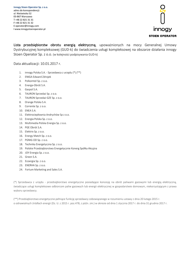 innogy Stoen Operator Sp. z o.o. adres do korespondencji: ul. Nieświeska 52 03-867 Warszawa T +48 22 821 31 31 F +48 22 821 31 32 E [email protected] I www.innogystoenoperator.pl Lista przedsiębiorstw obrotu energią elektryczną, elektryczną upoważnionych na mocy Generalnej Umowy Dystrybucyjnej kompleksowej (GUD-k) do świadczenia usługi kompleksowej na obszarze działania innogy Stoen Operator Sp. z o.o. (w kolejności podpisywania GUD-k) Data aktualizacji: 10.01.2017 r. 1. 2. 3. 4. 5. 6. 7. 8. 9. 10. 11. 12. 13. 14. 15. 16. 17. 18. 19. 20. 21. 22. 23. 24. innogy Polska S.A. - Sprzedawca z urzędu (*) (**) ENIGA Edward Zdrojek Polkomtel Sp. z o.o. Energa-Obrót S.A. Gaspol S.A. TAURON Sprzedaż Sp. z o.o. TAURON Sprzedaż GZE Sp. z o.o. Orange Polska S.A. Corrente Sp. z o.o. ENEA S.A. Elektrociepłownia Andrychów Sp z o.o. Energia Polska Sp. z o.o. Multimedia Polska Energia Sp. z o.o. PGE Obrót S.A. Elektrix Sp. z o.o. Energy Match Sp. z o.o. PGNIG OD Sp. z o.o. Technika Energetyczna Sp. z o.o. Polskie Przedsiębiorstwo Energetycznie Konerg Spółka Akcyjna JOY Energia Sp. z o.o. Green S.A. Ecoergia Sp. z o.o. ENERHA Sp. z o.o. Fortum Marketing and Sales S.A. (*) Sprzedawca z urzędu - przedsiębiorstwo energetyczne posiadające koncesję na obrót paliwami gazowymi lub energią elektryczną, świadczące usługi kompleksowe odbiorcom paliw gazowych lub energii elektrycznej w gospodarstwie domowym, niekorzystającym z prawa wyboru sprzedawcy. (**) Przedsiębiorstwo energetyczne pełniące funkcję sprzedawcy zobowiązanego w rozumieniu ustawy z dnia 20 lutego 2015 r. o odnawialnych źródłach energii (Dz. U. z 2015 r. poz.478, z późn. zm.) w okresie od dnia 1 stycznia 2017 r. do dnia 31 grudnia 2017 r. innogy Stoen Operator Sp. z o.o. adres do korespondencji: ul. Nieświeska 52 03-867 Warszawa T +48 22 821 31 31 F +48 22 821 31 32 E [email protected] I www.innogystoenoperator.pl Lista przedsiębiorstw obrotu energią elektryczną, upoważnionych na mocy Generalnej Umowy Dystrybucyjnej kompleksowej (GUD-k) do pełnienia roli sprzedawcy rezerwowego dla usługi kompleksowej na obszarze działania innogy Stoen Operator Sp. z o.o. (w kolejności podpisywania GUD-k) Data aktualizacji: 10.01.2017 r. 1. 2. 3. 4. 5. 6. 7. 8. 9. innogy Polska S.A. - Sprzedawca z urzędu (*) (**) ENIGA Edward Zdrojek Polkomtel Sp. z o.o. Corrente Sp. z o.o. Elektrociepłownia Andrychów Sp z o.o. Energia Polska Sp. z o.o. Multimedia Polska Energia Sp. z o.o. PGE Obrót S.A. Elektrix Sp. z o.o. (*) Sprzedawca z urzędu - przedsiębiorstwo energetyczne posiadające koncesję na obrót paliwami gazowymi lub energią elektryczną, świadczące usługi kompleksowe odbiorcom paliw gazowych lub energii elektrycznej w gospodarstwie domowym, niekorzystającym z prawa wyboru sprzedawcy. (**) Przedsiębiorstwo energetyczne pełniące funkcję sprzedawcy zobowiązanego w rozumieniu ustawy z dnia 20 lutego 2015 r. o odnawialnych źródłach energii (Dz. U. z 2015 r. poz.478, z późn. zm.) w okresie od dnia 1 stycznia 2017 r. do dnia 31 grudnia 2017 r.