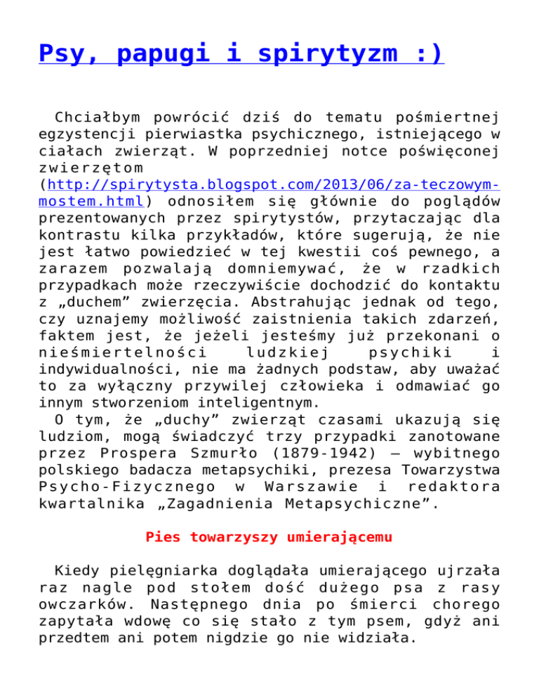 Psy, papugi i spirytyzm :) Chciałbym powrócić dziś do tematu pośmiertnej egzystencji pierwiastka psychicznego, istniejącego w ciałach zwierząt. W poprzedniej notce poświęconej zwierzętom (http://spirytysta.blogspot.com/2013/06/za-teczowymmostem.html) odnosiłem się głównie do poglądów prezentowanych przez spirytystów, przytaczając dla kontrastu kilka przykładów, które sugerują, że nie jest łatwo powiedzieć w tej kwestii coś pewnego, a zarazem pozwalają domniemywać, że w rzadkich przypadkach może rzeczywiście dochodzić do kontaktu z „duchem” zwierzęcia. Abstrahując jednak od tego, czy uznajemy możliwość zaistnienia takich zdarzeń, faktem jest, że jeżeli jesteśmy już przekonani o nieśmiertelności ludzkiej psychiki i indywidualności, nie ma żadnych podstaw, aby uważać to za wyłączny przywilej człowieka i odmawiać go innym stworzeniom inteligentnym. O tym, że „duchy” zwierząt czasami ukazują się ludziom, mogą świadczyć trzy przypadki zanotowane przez Prospera Szmurło (1879-1942) – wybitnego polskiego badacza metapsychiki, prezesa Towarzystwa Psycho-Fizycznego w Warszawie i redaktora kwartalnika „Zagadnienia Metapsychiczne”. Pies towarzyszy umierającemu Kiedy pielęgniarka doglądała umierającego ujrzała raz nagle pod stołem dość dużego psa z rasy owczarków. Następnego dnia po śmierci chorego zapytała wdowę co się stało z tym psem, gdyż ani przedtem ani potem nigdzie go nie widziała. – Z jakim psem, w całym domu nie ma ani jednego? – odrzekła wdowa. Gdy jednak pielęgniarka uporczywie twierdziła, że na pewno na własne oczy go oglądała i dokładnie opisała jego wygląd, dopiero wtedy zdumiona wdowa przyznała, że istotnie mieli kiedyś właśnie takiego psa, ale zginął już przed dziesięciu laty. Creola Drugi przypadek, na który powołuje się Szmurło, opisał Ernesto Bozzano w czasopiśmie „Luce et Ombra”. Otóż prof. Emil Maguin posiadał psa imieniem Creola, którego na kilkanaście dni wysłał do Paryża na tresurę do leśniczego w Rambouillet. Pewnego ranka profesor usłyszał wyraźne drapanie psa do drzwi wejściowych. Natychmiast wstał, otworzył drzwi, ale nikogo nie zobaczył i nie umiał sobie wytłumaczyć, co mogło być tego powodem. W dwie godziny potem otrzymał depeszę z zawiadomieniem, że jego pies Creola został przypadkiem zastrzelony na polowaniu przez jakiegoś niezręcznego myśliwego. Odczucie śmierci… papugi! Pewna kobieta opisała taki oto niezwykły przypadek: „Przed kilkunastu laty mój dziadek zachorował i leżał w szpitalu na Malcie. U siebie w domu, w Anglii, miał dziadek papugę, która była doń niezwykle przywiązana i nauczyła się wołać go po imieniu. Pewnego wieczora w szpitalu dziadek wyraźnie posłyszał głos swojej papugi, trzykrotnie głośno wymawiający jego imię i jakby wzywający na pomoc. Zaniepokojony tym staruszek napisał do domu, zapytując co dzieje się z ptakiem, ale jego list rozminął się w drodze z naszym, w którym zawiadamialiśmy go o śmierci skrzydlatego przyjaciela dokładnie tego samego dnia i godziny, kiedy dziadek słyszał jego wołanie. Należy dodać, że papuga istotnie w chwili zgonu trzykrotnie głośno powtarzała imię dziadka”[1]. [1] P. Szmurło, Ze [b.r.w.], s. 53-54. świata tajemnic, Warszawa
