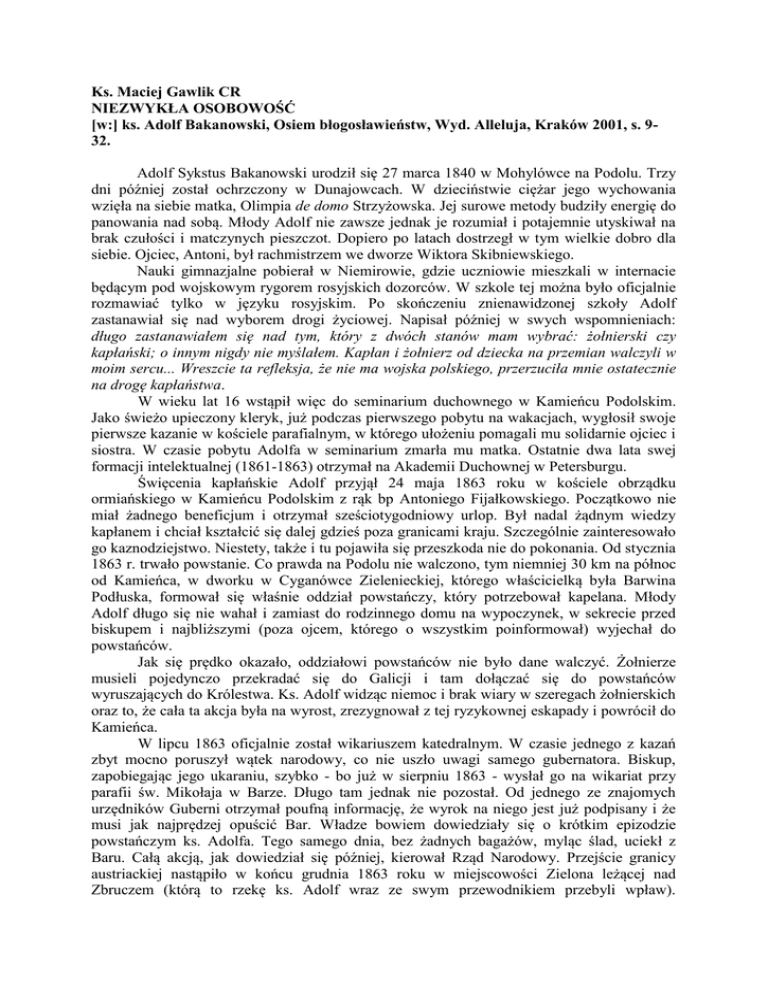 Ks. Maciej Gawlik CR NIEZWYKŁA OSOBOWOŚĆ [w:] ks. Adolf Bakanowski, Osiem błogosławieństw, Wyd. Alleluja, Kraków 2001, s. 932. Adolf Sykstus Bakanowski urodził się 27 marca 1840 w Mohylówce na Podolu. Trzy dni później został ochrzczony w Dunajowcach. W dzieciństwie ciężar jego wychowania wzięła na siebie matka, Olimpia de domo Strzyżowska. Jej surowe metody budziły energię do panowania nad sobą. Młody Adolf nie zawsze jednak je rozumiał i potajemnie utyskiwał na brak czułości i matczynych pieszczot. Dopiero po latach dostrzegł w tym wielkie dobro dla siebie. Ojciec, Antoni, był rachmistrzem we dworze Wiktora Skibniewskiego. Nauki gimnazjalne pobierał w Niemirowie, gdzie uczniowie mieszkali w internacie będącym pod wojskowym rygorem rosyjskich dozorców. W szkole tej można było oficjalnie rozmawiać tylko w języku rosyjskim. Po skończeniu znienawidzonej szkoły Adolf zastanawiał się nad wyborem drogi życiowej. Napisał później w swych wspomnieniach: długo zastanawiałem się nad tym, który z dwóch stanów mam wybrać: żołnierski czy kapłański; o innym nigdy nie myślałem. Kapłan i żołnierz od dziecka na przemian walczyli w moim sercu... Wreszcie ta refleksja, że nie ma wojska polskiego, przerzuciła mnie ostatecznie na drogę kapłaństwa. W wieku lat 16 wstąpił więc do seminarium duchownego w Kamieńcu Podolskim. Jako świeżo upieczony kleryk, już podczas pierwszego pobytu na wakacjach, wygłosił swoje pierwsze kazanie w kościele parafialnym, w którego ułożeniu pomagali mu solidarnie ojciec i siostra. W czasie pobytu Adolfa w seminarium zmarła mu matka. Ostatnie dwa lata swej formacji intelektualnej (1861-1863) otrzymał na Akademii Duchownej w Petersburgu. Święcenia kapłańskie Adolf przyjął 24 maja 1863 roku w kościele obrządku ormiańskiego w Kamieńcu Podolskim z rąk bp Antoniego Fijałkowskiego. Początkowo nie miał żadnego beneficjum i otrzymał sześciotygodniowy urlop. Był nadal żądnym wiedzy kapłanem i chciał kształcić się dalej gdzieś poza granicami kraju. Szczególnie zainteresowało go kaznodziejstwo. Niestety, także i tu pojawiła się przeszkoda nie do pokonania. Od stycznia 1863 r. trwało powstanie. Co prawda na Podolu nie walczono, tym niemniej 30 km na północ od Kamieńca, w dworku w Cyganówce Zielenieckiej, którego właścicielką była Barwina Podłuska, formował się właśnie oddział powstańczy, który potrzebował kapelana. Młody Adolf długo się nie wahał i zamiast do rodzinnego domu na wypoczynek, w sekrecie przed biskupem i najbliższymi (poza ojcem, którego o wszystkim poinformował) wyjechał do powstańców. Jak się prędko okazało, oddziałowi powstańców nie było dane walczyć. Żołnierze musieli pojedynczo przekradać się do Galicji i tam dołączać się do powstańców wyruszających do Królestwa. Ks. Adolf widząc niemoc i brak wiary w szeregach żołnierskich oraz to, że cała ta akcja była na wyrost, zrezygnował z tej ryzykownej eskapady i powrócił do Kamieńca. W lipcu 1863 oficjalnie został wikariuszem katedralnym. W czasie jednego z kazań zbyt mocno poruszył wątek narodowy, co nie uszło uwagi samego gubernatora. Biskup, zapobiegając jego ukaraniu, szybko - bo już w sierpniu 1863 - wysłał go na wikariat przy parafii św. Mikołaja w Barze. Długo tam jednak nie pozostał. Od jednego ze znajomych urzędników Guberni otrzymał poufną informację, że wyrok na niego jest już podpisany i że musi jak najprędzej opuścić Bar. Władze bowiem dowiedziały się o krótkim epizodzie powstańczym ks. Adolfa. Tego samego dnia, bez żadnych bagażów, myląc ślad, uciekł z Baru. Całą akcją, jak dowiedział się później, kierował Rząd Narodowy. Przejście granicy austriackiej nastąpiło w końcu grudnia 1863 roku w miejscowości Zielona leżącej nad Zbruczem (którą to rzekę ks. Adolf wraz ze swym przewodnikiem przebyli wpław). Zamieszkał w Sidorówce u Adama Paygerta, tłumacza i poety, członka komitetu Rządu Narodowego; bardzo szybko zameldował się u proboszcza w pobliskim Husiatynie, ks. Michała Kłossowskiego. Do archidiecezji lwowskiej przyjął go w styczniu 1864 abp Franciszek Wierzchlejski i zamianował wikariuszem w Trembowli (urzędowa nominacja 29 I 1864). Było to konieczne, gdyż władze austriackie chciały wszystkich emigrantów z zaboru rosyjskiego internować aż do zakończenia powstania. Bakanowski, nie wierząc zresztą w powodzenie powstania, także podlegał temu zarządzeniu. Mimo pracy w Trembowli nie opuszczała go myśl o podróży do Rzymu i wstąpieniu do jakiegoś zakonu. Tymczasem władze austriackie otrzymywały od „życzliwych” donosy na ks. Adolfa, mówiące o jego kazaniach, które jakoby nawoływały do powstania, co było nieprawdą. Jednak, po którymś z nich, został (w Wielką Sobotę 1864) odesłany pod eskortą do Tarnopola, gdzie mieszkał przez cztery wielkanocne dni u jezuitów, a później do Lwowa, gdzie z kolei przesiedział dwa dni w więzieniu „karmelickim” przy ul. Batorego. Uwolniono go na skutek wstawiennictwa u namiestnika samego arcybiskupa. U niego więc spędził cały tydzień. Poczucie powołania do zakonu (mieli to być albo jezuici albo dominikanie) rozbijało się o braki pieniędzy i paszportu, niezbędnych do odbycia podróży do Rzymu. Wszystko się dobrze się skończyło, gdyż pieniądze otrzymał niespodzianie od anonimowego działacza Rządu Narodowego, a paszport otrzymał w kwietniu 1864, na skutek kolejnej interwencji abpa Wierzchlejskiego. Dnia 8 IV przez Wiedeń, Triest, Ankonę i Loretto wyjechał do Rzymu. Tam, po audiencji u papieża Piusa IX, razem z innymi kapłanami-emigrantami zamieszkał w domu gościnnym, zwanym Trinita dei Pellegrini, leżącym przy kościele o tej samej nazwie. Dla ks. Adolfa była to oczywiście okoliczność przejściowa. Nie ustawał w myśleniu nad wyborem nowej drogi, jaką było dla niego życie zakonne. Zmar