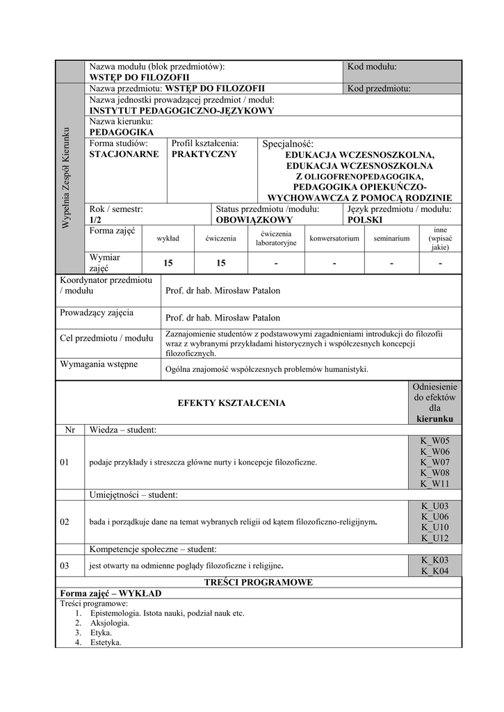 Wypełnia Zespół Kierunku Nazwa modułu (blok przedmiotów): Kod modułu: WSTĘP DO FILOZOFII Nazwa przedmiotu: WSTĘP DO FILOZOFII Kod przedmiotu: Nazwa jednostki prowadzącej przedmiot / moduł: INSTYTUT PEDAGOGICZNO-JĘZYKOWY Nazwa kierunku: PEDAGOGIKA Forma studiów: Profil kształcenia: Specjalność: STACJONARNE PRAKTYCZNY EDUKACJA WCZESNOSZKOLNA, EDUKACJA WCZESNOSZKOLNA Z OLIGOFRENOPEDAGOGIKA, PEDAGOGIKA OPIEKUŃCZOWYCHOWAWCZA Z POMOCĄ RODZINIE Rok / semestr: Status przedmiotu /modułu: Język przedmiotu / modułu: 1/2 OBOWIĄZKOWY POLSKI inne Forma zajęć ćwiczenia wykład ćwiczenia 15 15 Wymiar zajęć Koordynator przedmiotu / modułu Prowadzący zajęcia Cel przedmiotu / modułu Wymagania wstępne laboratoryjne konwersatorium seminarium (wpisać jakie) - - - - Prof. dr hab. Mirosław Patalon Prof. dr hab. Mirosław Patalon Zaznajomienie studentów z podstawowymi zagadnieniami introdukcji do filozofii wraz z wybranymi przykładami historycznych i współczesnych koncepcji filozoficznych. Ogólna znajomość współczesnych problemów humanistyki. EFEKTY KSZTAŁCENIA Nr 01 Odniesienie do efektów dla kierunku Wiedza – student: podaje przykłady i streszcza główne nurty i koncepcje filozoficzne. K_W05 K_W06 K_W07 K_W08 K_W11 Umiejętności – student: 02 bada i porządkuje dane na temat wybranych religii od kątem filozoficzno-religijnym. K_U03 K_U06 K_U10 K_U12 Kompetencje społeczne – student: 03 jest otwarty na odmienne poglądy filozoficzne i religijne. TREŚCI PROGRAMOWE Forma zajęć – WYKŁAD Treści programowe: 1. Epistemologia. Istota nauki, podział nauk etc. 2. Aksjologia. 3. Etyka. 4. Estetyka. K_K03 K_K04 5. 6. Polityka. Prawo natury. Forma zajęć – ĆWICZENIA Przegląd i analiza filozoficzna wybranych wyznań i religii świata oraz koncepcji parareligijnych (katolicyzm, protestantyzm, prawosławie, judaizm, islam, hinduizm, buddyzm, taoizm, konfucjanizm, nowe ruchy religijne, sekty, magia, satanizm). Wykład konwersatoryjny. Ćwiczenia audytoryjne: metoda projektów (prezentacja projektu wraz z Metody kształcenia dyskusją) Nr efektu kształcenia z sylabusa Metody weryfikacji efektów kształcenia Ocena cząstkowa: na podstawie indywidualnego przygotowania projektu i jego 02 prezentacji. Ocena formująca: na podstawie aktywnego uczestnictwa w dyskusji po prezentacji projektu. 03 Ocena podsumowująca: Ustna odpowiedź (do zaliczenia przedmiotu konieczna jest znajomość omówionej na zajęciach problematyki oraz treści podanych lektur). 01 Forma i warunki zaliczenia ZALICZENIE Z OCENĄ Literatura podstawowa Arno Anzenbacher, Wprowadzenie do filozofii, Kraków 2003. Janusz A. Majcherek, Kultura, osoba, tożsamość. Z zagadnień filozofii i socjologii kultury, Kraków 2009. Antoni Stępień, Wstęp do filozofii, Lublin 1995. Peter K. McInerney, Wstęp do filozofii, Poznań 1998. Jan Hartman, Wstęp do filozofii, Warszawa 2005. Zenon Kawecki, Witold Tyloch, Wybrane problemy religioznawstwa, Warszawa 1987. Literatura uzupełniająca Wykład – zaliczenie ustne ze znajomości zagadnień poruszanych na wykładach. Ćwiczenia – przygotowanie projektu i jego prezentacja. NAKŁAD PRACY STUDENTA: Udział w wykładach Samodzielne studiowanie tematyki wykładów Udział w ćwiczeniach audytoryjnych i laboratoryjnych* Samodzielne przygotowywanie się do ćwiczeń* Przygotowanie projektu / eseju / itp. * Przygotowanie się do egzaminu / zaliczenia Udział w konsultacjach Inne ŁĄCZNY nakład pracy studenta w godz. Liczba punktów ECTS za przedmiot Obciążenie studenta związane z zajęciami praktycznymi* Obciążenie studenta na zajęciach wymagających bezpośredniego udziału nauczycieli akademickich Liczba godzin 15 5 15 5 10 5 5 60 2 (15+5+10=30) 1,2 (30+5=35 ) 1,4
