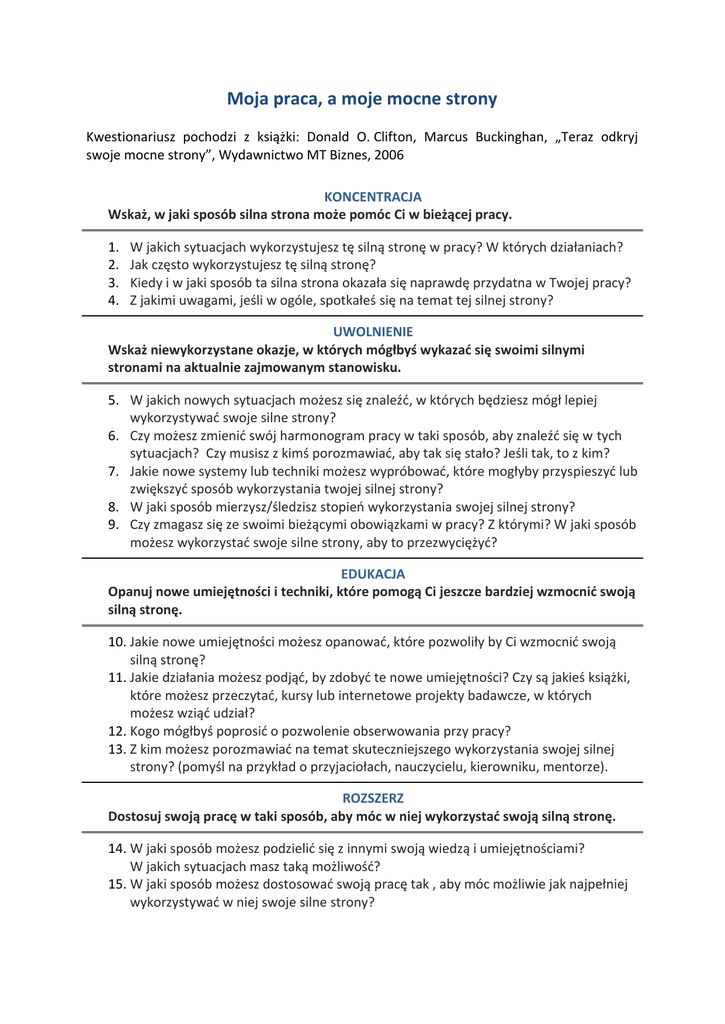 Moja praca, a moje mocne strony Kwestionariusz pochodzi z książki: Donald O. Clifton, Marcus Buckinghan, „Teraz odkryj swoje mocne strony”, Wydawnictwo MT Biznes, 2006 KONCENTRACJA Wskaż, w jaki sposób silna strona może pomóc Ci w bieżącej pracy. 1. 2. 3. 4. W jakich sytuacjach wykorzystujesz tę silną stronę w pracy? W których działaniach? Jak często wykorzystujesz tę silną stronę? Kiedy i w jaki sposób ta silna strona okazała się naprawdę przydatna w Twojej pracy? Z jakimi uwagami, jeśli w ogóle, spotkałeś się na temat tej silnej strony? UWOLNIENIE Wskaż niewykorzystane okazje, w których mógłbyś wykazać się swoimi silnymi stronami na aktualnie zajmowanym stanowisku. 5. W jakich nowych sytuacjach możesz się znaleźć, w których będziesz mógł lepiej wykorzystywać swoje silne strony? 6. Czy możesz zmienić swój harmonogram pracy w taki sposób, aby znaleźć się w tych sytuacjach? Czy musisz z kimś porozmawiać, aby tak się stało? Jeśli tak, to z kim? 7. Jakie nowe systemy lub techniki możesz wypróbować, które mogłyby przyspieszyć lub zwiększyć sposób wykorzystania twojej silnej strony? 8. W jaki sposób mierzysz/śledzisz stopień wykorzystania swojej silnej strony? 9. Czy zmagasz się ze swoimi bieżącymi obowiązkami w pracy? Z którymi? W jaki sposób możesz wykorzystać swoje silne strony, aby to przezwyciężyć? EDUKACJA Opanuj nowe umiejętności i techniki, które pomogą Ci jeszcze bardziej wzmocnić swoją silną stronę. 10. Jakie nowe umiejętności możesz opanować, które pozwoliły by Ci wzmocnić swoją silną stronę? 11. Jakie działania możesz podjąć, by zdobyć te nowe umiejętności? Czy są jakieś książki, które możesz przeczytać, kursy lub internetowe projekty badawcze, w których możesz wziąć udział? 12. Kogo mógłbyś poprosić o pozwolenie obserwowania przy pracy? 13. Z kim możesz porozmawiać na temat skuteczniejszego wykorzystania swojej silnej strony? (pomyśl na przykład o przyjaciołach, nauczycielu, kierowniku, mentorze). ROZSZERZ Dostosuj swoją pracę w taki sposób, aby móc w niej wykorzystać swoją silną stronę. 14. W jaki sposób możesz podzielić się z innymi swoją wiedzą i umiejętnościami? W jakich sytuacjach masz taką możliwość? 15. W jaki sposób możesz dostosować swoją pracę tak , aby móc możliwie jak najpełniej wykorzystywać w niej swoje silne strony?
