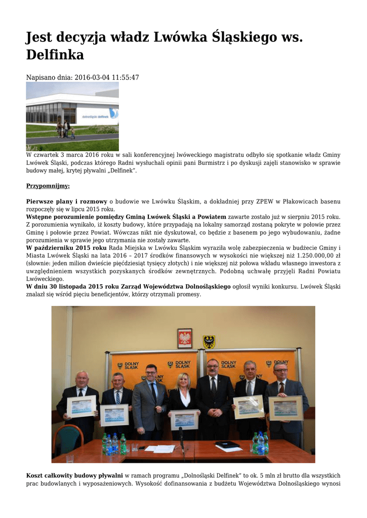 Jest decyzja władz Lwówka Śląskiego ws. Delfinka Napisano dnia: 2016-03-04 11:55:47 W czwartek 3 marca 2016 roku w sali konferencyjnej lwóweckiego magistratu odbyło się spotkanie władz Gminy Lwówek Śląski, podczas którego Radni wysłuchali opinii pani Burmistrz i po dyskusji zajęli stanowisko w sprawie budowy małej, krytej pływalni „Delfinek”. Przypomnijmy: Pierwsze plany i rozmowy o budowie we Lwówku Śląskim, a dokładniej przy ZPEW w Płakowicach basenu rozpoczęły się w lipcu 2015 roku. Wstępne porozumienie pomiędzy Gminą Lwówek Śląski a Powiatem zawarte zostało już w sierpniu 2015 roku. Z porozumienia wynikało, iż koszty budowy, które przypadają na lokalny samorząd zostaną pokryte w połowie przez Gminę i połowie przez Powiat. Wówczas nikt nie dyskutował, co będzie z basenem po jego wybudowaniu, żadne porozumienia w sprawie jego utrzymania nie zostały zawarte. W październiku 2015 roku Rada Miejska w Lwówku Śląskim wyraziła wolę zabezpieczenia w budżecie Gminy i Miasta Lwówek Śląski na lata 2016 – 2017 środków finansowych w wysokości nie większej niż 1.250.000,00 zł (słownie: jeden milion dwieście pięćdziesiąt tysięcy złotych) i nie większej niż połowa wkładu własnego inwestora z uwzględnieniem wszystkich pozyskanych środków zewnętrznych. Podobną uchwałę przyjęli Radni Powiatu Lwóweckiego. W dniu 30 listopada 2015 roku Zarząd Województwa Dolnośląskiego ogłosił wyniki konkursu. Lwówek Śląski znalazł się wśród pięciu beneficjentów, którzy otrzymali promesy. Koszt całkowity budowy pływalni w ramach programu „Dolnośląski Delfinek” to ok. 5 mln zł brutto dla wszystkich prac budowlanych i wyposażeniowych. Wysokość dofinansowania z budżetu Województwa Dolnośląskiego wynosi 1,25 mln zł. Dofinansowanie ze środków Funduszu Rozwoju Kultury Fizycznej (w gestii Ministerstwa Sportu i Turystyki) wyniesie 1- 1,65 mln zł. Pozostałą część stanowią środki własne samorządu (ok 44%), które zostaną podzielone po połowie, pomiędzy Gminę Lwówek Śląski a Powiat Lwówecki. Główną funkcją obiektu jest realizacja nauki pływania dla dzieci i młodzieży, która będzie realizowana na czterotorowej niecce pływackiej o wymiarach 16,67 x 8,5 m i głębokości 0,9 do 1,35. Głębokość i profil dna umożliwiają prowadzenie profesjonalnej nauki pływania dla dzieci w klasach 1-6, a także nauczanie takich elementów sportu pływackiego jak skok startowy czy nawrót. Po trzech miesiącach od otrzymania promesy, zapał do budowy basenu we Lwówku Śląskim zdecydowanie opadł. Kością niezgody pomiędzy władzami Gminy a Powiatu stało się finansowanie utrzymania basenu już po jego wybudowaniu. Do dnia dzisiejszego porozumienie takowe nie zostało zawarte. Okazało się także, o czym w ubiegłym tygodniu na wspólnym posiedzeniu Rady Gminy i Rady Powiatu poinformował Starosta Fluder, iż trwają prace nad wpisaniem terenu ZPEW w Płakowicach do rejestru zabytków i taka konstrukcja przy tym kształcie, jaki zakłada wstępnie ten projekt nie ma szansy na pozytywną ocenę Konserwatora. Ponadto Starosta wskazał, iż przy planach tej inwestycji należy także wziąć pod uwagę dodatkowo budowę nowej kotłowni, gdyż ta przy ZPEW nie poradzi sobie z obsłużeniem szkoły i basenu. Podczas wspólnego spotkania władz Gminy i Powiatu, które odbyło się we wtorek, 23 lutego 2016 roku część zebranych otwarcie mówiła, iż należy odstąpić od budowy krytej pływalni, argumentując to jej wielkością, nieprzewidzianymi trudnościami i kosztami przekraczającymi możliwości Gminy i Powiatu. Część przypominała, iż nie można odstąpić od budowy, bo zawiedzione zostaną oczekiwania mieszkańców. Głównym przedmiotem sporu było finansowanie inwestycji już po jej wybudowaniu. Wstępna deklaracja ze strony władz Gminy Lwówek Śląski była, aby utrzymanie basenu finansować po połowie (50/50). Część władz Powiatu stała na stanowisku, iż ze względu na fakt, że z basenu w znacznej części będą korzystać dzieci ze szkół podstawowych i gimnazjów, to koszty powinny zostać rozłożone nieproporcjonalnie np. 70% po stronie Gminy i 30% po stronie Powiatu. Ubiegłotygodniowe spotkanie nie zakończyło się żadną decyzją. W czwartek 3 marca 2016 roku w Sali konferencyjnej lwóweckiego magistratu odbyło się spotkanie władz Gminy Lwówek Śląski, podczas którego radni wysłuchali opinii pani Burmistrz i po dyskusji zajęli stanowisko w sprawie tej budzącej coraz więcej złych emocji inwestycji. Jak poinformowali nas radni, Gmina Lwówek Śląski, zgodnie z zawartym wcześniej porozumieniem dołoży kwotę nie większą niż 1.250.000 zł do budowy pływalni. Jednak nie weźmie na siebie ciężaru utrzymywania basenu w przyszłości. Zdaniem władz Gminy, skoro basen będzie inwestycją, której inwestorem wiodącym jest Powiat, to niech Powiat sam zatroszczy się o utrzymanie tego obiektu. Jednocześnie padła deklaracja, że Gmina Lwówek Śląski będzie wykupywała wejściówki dla dzieci na lekcje w-f na basenie, jednak bez żadnych wyliczeń i konkretnych kwot. Ponadto jak wyjaśniają radni, podczas wczorajszego spotkania zostali poinformowani, że w środę Pani Burmistrz i Pan Starosta byli w Urzędzie Marszałkowskim, gdzie Pan Starosta powiedział żeby nasza gmina utrzymywała inwestycje, na co Pan Marszałek powiedział, że Starosta ma zrobić wszystko, aby na naszego Delfinka przyjeżdżały wszystkie szkoły, a nie z góry zakładać, że nikt z tego obiektu nie będzie korzystał. Na 13 obecnych Radnych 12 głosowało za dołożeniem 50% do budowy i niedokładaniem do utrzymania (poza deklaracją wykupu wejściówek na lekcje w-f) a 1 Radny głosował przeciw takim ustaleniom. Do 10 marca 2016 roku decyzję muszą podjąć władze Powiatu. To znakomite posunięcie ze strony władz Gminy Lwówek Śląski. Skoro na początku Powiat ni