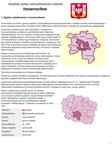 Analiza rynku nieruchomości miasta Inowrocław I. Ogólne wiadomości o Inowrocławiu Inowrocław to miasto i gmina miejska w województwie kujawsko-pomorskim, siedziba powiatu inowrocławskiego i gminy wiejskiej Inowrocław. W latach 1975-1998 miasto administracyjnie należało do województwa bydgoskiego. Inowrocław położony jest nad rzeką Noteć, na Równinie Inowrocławskiej, w północno-wschodniej części Pojezierza Wielkopolskiego. Jest 49. miastem w Polsce pod względem liczby ludności. Według danych z 30 czerwca 2012 roku miasto miało 75 719 mieszkańców. Istotny węzeł kolejowy i drogowy. Inowrocław jest wielobranżowym ośrodkiem przemysłowym i usługowym. Od 2013 roku w granicach miasta znajdują się miejsca pod inwestycje Pomorskiej Specjalnej Strefy Ekonomicznej. Zrzeszony w Związku Miast Polskich. Miasto uznawane jest za stolicę Kujaw Zachodnich. W Inowrocławiu funkcjonują sanatoria, domy uzdrowiskowe i tężnie solankowe, przez co jest on uważany za miejscowość uzdrowiskową. Posiada bogate złoża soli kamiennej, które wydobywane są tutaj od czasów starożytnych. Znajdują się tu tężnie solankowe. W kraju miasto jest uznawane za jeden z najlepszych ośrodków leczenia chorób dróg oddechowych. Patronką Inowrocławia jest Królowa Jadwiga. Miasto jest dużym ośrodkiem wojskowym. W skład garnizonu wchodzi Wojskowy Port Lotniczy (stacjonują tu śmigłowce bojowe), brygada lotnictwa oraz pułk inżynieryjny. Inowrocław pełni funkcje ponadregionalnego ośrodka kultury. Odbywają się tu m. in.: Ogólnopolski Przegląd Młodzieżowych Orkiestr Dętych, Arlekinada (Ogólnopolski Festiwal Małych Form Teatralnych) oraz Coroczny Wojewódzki Profilaktyczny Festiwal Teatralny poPaTrz. Działają tu teatr, kina, muzea, galerie. Jedno z najstarszych polskich miast. W czasach starożytnych przebiegał tędy Bursztynowy Szlak. Odbywały się tu procesy polsko-krzyżackie. Stąd pochodzili Królowie Polski: Władysław I Łokietek i Kazimierz Wielki. Z inowrocławskiego zamku król Władysław Jagiełło prowadził "Wielką Wojnę" z Zakonem Krzyżackim w 1410 roku Państwo Polska Województwo kujawsko-pomorskie Powiat inowrocławski Gmina gmina miejska Data założenia ok. 1120 Prawa miejskie 1237/1238 Prezydent Ryszard Brejza Powierzchnia 30,42 km² 1 Wysokość 85-100 m n.p.m. Populacja (2012) • liczba ludności • gęstość 75 719[1] 2 491,8 os./km² Strefa numeracyjna (+48) 52 Kod pocztowy 88-100 do 88-110 i 88-115 Tablice rejestracyjne CIN II. Zaludnienie Inowrocław jest najważniejszym ośrodkiem gospodarczym na Kujawach Zachodnich. Obecnie miasto liczy ponad 75 tysięcy mieszkańców i zajmuje obszar 30,42 km. 2 Liczba ludności w latach 2004-2011: Wykres liczby ludności Inowrocławia na przestrzeni ostatnich 110 lat. 3 III. Zatrudnienie Na dzień 31 grudnia 2012 r. w Powiatowym Urzędzie Pracy w Inowrocławiu zarejestrowanych było 15.269 bezrobotnych, w tym 7.098 z terenu Inowrocławia (z tego 3.932 to kobiety). 20,4 % bezrobotnych z Inowrocławia posiadało prawo do zasiłku. Natomiast struktura bezrobotnych zarejestrowanych w PUP w Inowrocławiu na koniec grudnia 2012 r. przedstawiała się następująco: - bezrobotne kobiety - 8.523 - bezrobotni z prawem do zasiłku - 3.122 - bezrobotni zamieszkali na wsi - 5.391 - bezrobotni do 25-roku życia - 3.011 - długotrwale bezrobotni - 8.788 - bezrobotni powyżej 50-roku życia - 3.103 - bezrobotni niepełnosprawni - 558 4 IV. Rynek nieruchomości w mieście Inowrocław 5 6 7 Mapa miasta Inowrocław. 8