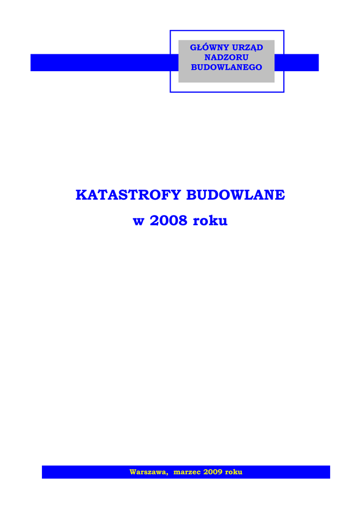GŁÓWNY URZĄD NADZORU BUDOWLANEGO KATASTROFY BUDOWLANE w 2008 roku Warszawa, marzec 2009 roku Wstęp (art. 73 ust.1 ustawy - Prawo budowlane). ( ) ! " (art. 76 ust.1 pkt 1 w związku z art. 74 ustawy % " " $ & ! ' (art. 77 ustawy - Prawo budowlane). # Prawo budowlane ) % $ (robót), $ $ ! + $ ' $ , & * ' ( 2 ustawy - Prawo budowlane. - $ ) . / / 0 $ 1 & * ' ( $ Katastrofy budowlane w 2008 roku. 1113 lutego 2009 r.), 8 2 . / / 0 19 23 • • 4 1067 $ (stan na koniec 3 4 • • $ Katastrofy obiektów budowlanych w 2008 r. 1200 1000 800 600 400 200 0 1067 23 19 budowa 5 $ (ankiety zgłoszone). (ankiety zamknięte), rozbiórka roboty w istn. obiekcie 4 709 utrzymanie 404 W YKAZ KATASTROF BUDOW LANYCH ZARE JE STROW ANYCH W 2008 ROKU Z PODZIAŁEM NA W OJEW ÓDZTW A 549 240 119 88 17 15 6 23 7 2 16 4 4 19 4 1 # ( # % $ " " " " ! " ) & ' % , * + # ) kategorię I • - 1 4 $ wiatry, $ 2 silne (powodzie, kategorię II • 1 obfity śnieg, uderzenia pioruna), $ $ . / / 0 1113 (niewynikających ze zdarzeń losowych), (zaistniałych z przyczyn losowych). 4 $ 49 1064 • • * 4,4%. ! ! ! ! $ Katastrofy kat. I – nie wynikające ze zdarzeń losowych wg województw Lp. . Województwo / 0 / > < / G ? H I / G ? H : / J / O A / O A / U / D 1 L 7 / D 1 L 2 / D 1 E / W W = N 1 2 ? 3 1 @ K A 4 B 2 8 C 9 : D 1 E 1 F 6 7 8 9 1 9 2 ; . 9 Q . . 9 8 8 1 8 7 7 7 1 7 6 M 6 7 6 ? P 5 6 9 L 2 Zły stan Wadliwe techniczny wykonawstwo 6 7 8 9 . Błędy w Zawalenia Wadliwa Ogółem trakcie Inne rusztowań eksploatacja w woj. rozbiórki ; < ; ; ; ; . 2 ; ; 2 ; ; . ; ; ; . ; ; ; . ; . . = ; . 10 ; . 1 . 3 4 ; R T V . ; . . . = M Q 2 1 < / . I / [ A . : / [ 8 N / ] 8 6 7 F A 6 8 X F 9 S 2 ^ . S 7 8 9 9 7 8 F 9 M \ 1 1 8 7 8 7 9 9 1 E 8 ; A 6 8 7 9 7 F Y S Q 6 7 9 8 A 1 B A B 2 5 . . 1 6 Q L Z 7 1 3 6 1 2 8 8 C 6 1 7 O 7 Q 8 1 ? F 6 7 8 E 1 F 6 7 8 9 Łącznie ze względu na przyczynę . ; ; ; ; 1 0 ; ; ; ; ; ; ; ; ; ; ; ; ; ; ; < < ; ; ; ; 6 ; ; ; ; ; 1 ; ; ; ; 3 ; 10 ; 1 9 9 ; ; . M ; ; 9 A . 4 . . = < : ; ; ; ; ; ; 18 16 1 0 0 . = . 10 4 1 49 - ! ! $ , / / 0 " - $ $ 113 . / / 0 - 1 $ - " 4 - (powiat Radomsko, Piotrków Trybunalski i Wieluń) 541 (powiat Strzelce Opolskie) 236 (powiat Zambrów i Wysokie Mazowieckie) . . / / 0 , $ ) 2 - 3 - . / / 0 , 73 " $ # Katastrofy kat. II - wynikające ze zdarzeń losowych wg województw Lp. . / 0 1 > = Silny wiatr Województwo 2 ? 3 1 @ 1 A D E < / G ? H I / G ? H : / J / O A / O A / U / D 1 L 7 / D 1 L 2 / D 1 E / W W 5 6 1 2 M 8 8 7 7 9 ; 9 . . 9 8 8 8 Wyładowania atmosferycz ne Osuwiska Wybuchy gazu Uderzenia samochodu = 5 ; ; ; ; ; ; ; ; ; ; ; ; ; ; ; I ; ; < ; ; ; ; . ; ; 239 ; ; ; . ; ; 2 ; ; ; ; < ; ; ; . = 9 9 : = = I P 1 Q 1 2 6 7 8 9 . R R T V . ; . . = . . < / . I / . : / N . 1 1 2 8 A 7 A X F 8 9 = = ; = . 15 . 4 ; ; 4 ; < 546 < I S ^ 9 . . I 9 ; F M \ 6 6 1 8 8 . / ; . ; ; ; ; . 6 7 8 Q 1 / 9 ; ; ; . ; : E 1 0 F 6 7 8 9 . ; ; 1000 % 3 ; 11 ; ; 3 ; ; . ; ; ; ; ; 13 . ; ; 3 2 . ; 20 ) , $ . / / 0 90 $ ; 8 18 1 . - + 84 119 . . $ 19 . C ; 1 = . = 9 9 2 3 7 1 8 Q 6 7 7 L Z Łącznie ze względu na przyczynę 2 . . 8 7 1 1 8 9 7 8 7 7 I R < V F 2 8 S N 9 9 1 E 8 = A 6 8 7 9 7 F ? S Q 6 Y 9 8 F 7 M A 6 A 6 A ] 8 1 B [ B 2 5 O / M Q [ = . Ogółem w woj. R N Inne C 7 7 6 7 1 6 6 ? 6 7 F 9 L 2 B / K 4 Pożary 9 0 1064 ' (577) (409). ' % $ - (1), (21), (2) (27), (44). (32), Struktura katastrof według rodzajów obiektów budowlanych 44 409 577 32 2 27 ' bud.zam.zb. bud.rekr.ind. ob. przem. ob. użyt. publ. bud. mag. bud. gosp. inne budowle 1 (787), 0 (154) (105). Konstrukcje obiektów budowlanych, które uległy katastrofie w 2008 r. 900 800 700 600 500 400 300 200 100 0 murowana $ , / - - 1 bud. mieszk. 21 drewniana mieszana stalowa żelbetowa inne ' • • ! / / / / - 4 (521 obiektów), (360 obiektów). + $ Czas eksploatacji obiektów budowlanych, które uległy katastrofie w 2008 r. 81; 7% 123; 11% 360; 33% 521; 49% < 10 lat - 10 - 30 lat % 30 - 70 lat > 70 lat . / / 0 $ terenu (807) (do 12 m wysokości nad poziomem # / / / - (587 obiektów). Katastrofy budowlane według kryterium wysokości obiektu 900 800 700 600 500 400 300 200 100 0 807 295 8 < 12 m 12 - 25 m 2 25 - 55 m 1 > 55 m nie dotyczy Podsumowanie i wnioski . / " / 2 . / / 0 $ + 2 $ 2 . / / $ (16% wszystkich katastrof), w roku 2008 ich liczba wyniosła już (77% wszystkich katastrof), 1000 (89,8% wszystkich katastrof). - / / 1 + , / . % $ % $ 2 & ! ' ( - / $ ) ' ' ) ( + 1 + 1 / . / - - $ . / / 0 ! 2 $ $ ! . - w sprawie warunków technicznych, jakim powinny odpowiadać budynki i ich usytuowanie. . / / . $ % ' 1 + Opracowanie: Departament Prawno-Organizacyjny GUNB ( + $