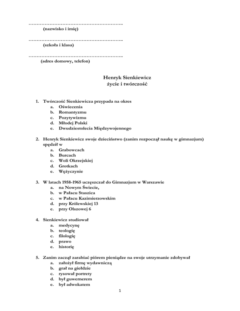 ………………………………………………….. (nazwisko i imię) ………………………………………………….. (szkoła i klasa) ………………………………………………….. (adres domowy, telefon) Henryk Sienkiewicz życie i twórczość 1. Twórczość Sienkiewicza przypada na okres a. Oświecenia b. Romantyzmu c. Pozytywizmu d. Młodej Polski e. Dwudziestolecia Międzywojennego 2. Henryk Sienkiewicz swoje dzieciństwo (zanim rozpoczął naukę w gimnazjum) spędził w a. Grabowcach b. Burcach c. Woli Okrzejskiej d. Grotkach e. Wężyczynie 3. W latach 1958-1965 uczęszczał do Gimnazjum w Warszawie a. na Nowym Świecie, b. w Pałacu Staszica c. w Pałacu Kazimierzowskim d. przy Królewskiej 13 e. przy Olszowej 6 4. Sienkiewicz studiował a. medycynę b. teologię c. filologię d. prawo e. historię 5. Zanim zaczął zarabiać piórem pieniądze na swoje utrzymanie zdobywał a. założył firmę wydawniczą b. grał na giełdzie c. rysował portrety d. był guwernerem e. był adwokatem 1 6. Żoną Henryka Sienkiewicza była a. Maria Kellerówna b. Maria Szetkiewiczówna c. Maria Wołodkiewiczówna d. Maria Radziejewska e. Maria Babska 7. Jego pierwsza opublikowana powieść to a. Bez tytułu b. Na marne c. Ofiara d. Humoreski z teki Worszyłły e. Ogniem i mieczem 8. W skład małej trylogii weszły a. Sielanka b. Hania c. Stary sługa d. Selim Mirza e. Na jedną kartę 9. Utwory o tematyce amerykańskiej (westernowej) to a. Janko Muzykant b. Orso c. Sachem d. Przez stepy e. W krainie złota 10. Nowele obrazujące życie polskiej wsi to a. Z pamiętnika poznańskiego nauczyciela b. Bartek Zwycięzca c. Ta trzecia d. Szkice węglem e. Jamioł 11. Problemy amerykańskiej polonii znajdują odzwierciedlenie w noweli a. Za chlebem b. Wspomnienia z Maripozy c. Bartek Zwycięzca d. Organista z Ponikły e. Latarnik 12. Henryk Sienkiewicz jest autorem a. Listów z Afryki b. Listów z podróży c. Listów do Marysieńki d. Listów z podróży do Ameryki e. Listów z podróży do Australii 2 13. Sienkiewicz współpracował z czasopismem a. Gazeta Polska b. Słowo c. Niwa d. Przegląd Tygodniowy e. Czas 14. W skład trylogii napisanej „ku pokrzepieniu serc” wchodzą następujące tytuły a. Niewola tatarska b. Ogniem i mieczem c. Potop d. Pan Wołodyjowski e. Na polu chwał 15. Postacią, która występuje we wszystkich częściach trylogii jest a. Longinus Podbipięta b. Jan Skrzetuski c. Hassling Ketling of Elgin d. Onufry Zagłoba e. Andrzej Kmicic 16. Tłem historycznym Trylogii są wojny Polaków z a. z zakonem krzyżackim b. z moskalami c. z Turkami d. ze Szwedami e. z Kozakami 17. Powieść o tematyce współczesnej to a. Legiony b. Bez dogmatu c. Rodzina Połanieckich d. Wiry e. Komedia omyłek (=Komedia z pomyłek) 18. Antymarksistowską i antyrewolucyjną wymowę ma powieść a. Ogniem i mieczem b. Bez dogmatu c. Wiry d. Stary sługa e. Z teki Woroszyłły 19. Sinkiewicz pisał także bajki. Jego autorstwa są następujące utwory a. Prawdziwy przyjaciel b. Sabałowa bajka c. Wyrok Zeus d. Lotos e. Dwie łąki 3 20. W 1905 r. otrzymał Literacką Nagrodę Nobla za a. Trylogię b. W pustyni i w puszczy c. Rodzinę Połanieckich d. Quo vadis e. Krzyżaków 21. Głównym polskim konkurentem do Literackiej Nagrody Nobla był a. Bolesław Prus b. Maria Konopnicka c. Maria Skłodowska-Curie d. Władysław Stanisław Reymont e. Eliza Orzeszkowa 22. Sinkiewicz używał pseudonimu literackiego a. Sawa b. Litwos c. El…y d. Józef Dumanowski e. Maurycy Zych 23. Sinkiewicz wiele podróżował, nigdy jednak nie był w a. Paryżu b. Konstantynopolu c. Nowym Jorku d. Moskwie e. Lwowie f. Rzymie g. Londynie h. Wenecji i. na Capri j. Warszawie 24. Ulubioną rozrywką pisarza było a. malowanie b. gra w karty c. polowania d. jazda na rowerze e. wspinaczka górska 25. Pisarz objął patronat nad uroczystościami związanymi z uczczeniem 100-tnej rocznicy urodzin wielkiego Polaka (w tym uroczyste odsłonięcie pomnika) a. Tadeusza Kościuszki b. Juliusza Słowackiego c. Adama Mickiewicza d. Jana Kochanowskiego e. Fryderyka Chopina 4 26. Przejawem walki w obronie polskości Sienkiewicza (poza działalnością literacką) było a. organizacja ankiety wśród intelektualnej elity Europy przeciw wywłaszczaniu Polaków w zaborze pruskim b. odezwa w obronie dzieci wrzesińskich c. list otwarty do cesarza Wilhelma II Króla Pruskiego wyrażających sprzeciw wobec polityki względem Polaków d. wspieranie tajnej Macierzy Szkolnej e. wspieranie Komitetu Generalnego Pomocy Ofiarom Wojny w Szwajcarii w czasie I wojny światowej 27. Z okazji jubileuszu 25-lecia swej twórczości otrzymał a. doktorat honoris causa UJ b. francuską Legię Honorową c. majątek ziemski w Oblęgorku d. Nagrodę Nobla e. Odznaczenie Legionów Piłsudskiego tzw. „parasol” Strzelca 28. Jak Sienkiewicz wykorzystał ofiarowany mu anonimowo dar 15 tys. rubli a. wyjechał w podróż do Aryki b. zabezpieczył przyszłość swoim dzieciom c. oddał ofiarodawcy d. wydał na swoje potrzeby e. utworzył stypendium dla zagrożonych gruźlicą pisarzy i artystów 29. Przyjacielem Sienkiewicza był a. Aleksander Świętochowski b. Stanisław Witkiewicz c. Bolesław Prus d. Maria Konopnicka e. Mścisław Godlewski 30. Sienkiewicz poznał osobiście a. Ignacego Paderewskiego b. Helenę Modrzejewską c. Adama Chmielowskiego d. Józefa Chełmońskiego e. Adama Asnyka f. Tadeusz Boya-Żeleńskiego g. Henryka Siemiradzkiego h. Jadwigę Łuszczewską (Deotymę) i. Zygmunta Krasińskiego j. Ignacego Kraszewskiego 31. Ostatni utwór Sinkiewicza wydrukowany już po jego śmierci to a. W pustyni i w puszczy b. Legiony c. Wspomnienie 5 d. Zagłoba swatem e. Bez tytułu 32. Henryk Sienkiewicz został pochowany a. na Powązkach w Warszawie b. w podziemiach katedry św. Jana w Warszawie c. na cmentarzu Vevey pod Lozanną d. w Paryżu na cmentarzu Père-Lachaise e. na Podlasiu w Woli Okrzejskiej oprac. GBP Jedlicze