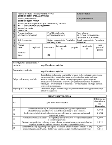 Nazwa modułu (bloku przedmiotów): Kod modułu: Nazwa przedmiotu: Kod przedmiotu: NIEMIECKI JĘZYK SPECJALISTYCZNY Wypełnia Zespół Kierunku NIEMIECKI JĘZYK PRAWA Nazwa jednostki prowadzącej przedmiot / moduł: INSTYTUT PEDAGOGICZNO-JĘZYKOWY Nazwa kierunku: FILOLOGIA Forma studiów: Profil kształcenia: Specjalność: Rok / semestr: Status przedmiotu /modułu: Język przedmiotu / modułu: STUDIA STACJONARNE 2/3 Forma zajęć OGÓLNOAKADEMICKI FILOLOGIA GERMAŃSKA – JĘZYKI OBCE W BIZNESIE OBOWIĄZKOWY wykład Wymiar zajęć ćwiczenia laboratoriu m NIEMIECKI projekt seminariu m inne (wpisać jakie) 30 Koordynator przedmiotu / modułu mgr Ewa Leszczyńska Prowadzący zajęcia Cel przedmiotu / modułu Wymagania wstępne mgr Ewa Leszczyńska Kurs służy przekazaniu elementów wiedzy fachowej oraz poszerzaniu kompetencji językowej słuchaczy w zakresie słownictwa z kręgu tematycznego prawa. Celem nadrzędnym pozostaje rozwijanie umiejętności rozumienia tekstów specjalistycznych oraz tworzenia własnych - precyzyjnych w przekazie - wypowiedzi z objętego kursem zakresu tematycznego. Znajomość języka niemieckiego na poziomie umożliwiającym aktywny udział w zajęciach. EFEKTY KSZTAŁCENIA Nr 01 02 03 04 05 Opis efektu kształcenia Student orientuje się w specyfice wybranych zagadnień prawnych, charakteryzuje podstawowe zasady komunikacji w tym obszarze. Student wyjaśnia i stosuje słownictwo specjalistyczne z zakresu wybranych zagadnień prawa. Student klasyfikuje, analizuje i interpretuje teksty fachowe w języku niemieckim o tematyce prawnej. Student samodzielnie redaguje teksty z kręgu tematyki prawnej, uwzględniając aspekty formalne, stylistyczne oraz idiomatykę specjalistyczną. Student tłumaczy z języka polskiego na niemiecki oraz odwrotnie krótkie teksty specjalistyczne, adekwatnie dobierając terminologię i struktury gramatyczne. Odniesienie do efektów dla kierunku K_W12 K_W04 K_U08 K_U12 K_U06 K_U14 06 07 Student posługuje się podstawowymi pojęciami, umożliwiającymi analizowanie i rozumienie zjawisk prawnych, a tym samym realizowanie działań profesjonalnych w tym obszarze. Student komunikuje wykorzystując nomenklaturę specjalistyczną, a także identyfikuje oraz projektuje rozwiązania problemów związanych z wybranymi aspektami komunikacji prawnej w języku niemieckim. K_U06 K_U07 K_U11 K_K05 TREŚCI PROGRAMOWE Wykład nie dotyczy Ćwiczenia Podstawowe wyrażenia i terminy prawne – specyfika nomenklatury juryslingwistycznej. Podstawy prawa cywilnego – umowy prawa cywilnego: - umowa najmu/ Mietvertrag - umowa pośrednia franchise/ Vermittlungsvertrag Franchisenehmer - umowa spółki cywilnej/ - umowa pożyczki/ Darlehensvertrag - umowa najmu/ Mietvertrag - klauzule w umowach prawa cywilnego/ Klauseln in den zivilrechtlichen Verträgen - klauzula pisemności/ Standardschriftformklausel - klauzula salwatoryjna/ salvatorische Klausel Laboratorium nie dotyczy Projekt nie dotyczy Literatura podstawowa Literatura uzupełniająca Metody kształcenia Malicka, A./ Schwierskott-Matheson E.: Polski i niemiecki język prawniczy w cwiczeniach. Warszawa: Ch. Beck 2012. Schwierskott, E.: Niemiecki język prawniczy w 40 lekcjach. Warszawa: Ch. Beck 2009. Białek, E./ Kos, J.: Z umową po sukces. Wzory umów dla Polaków i Niemców. Wrocław: DWU 1998. Schwierskott, E.: Deutsche juristische Begriffe in Übungen. Warszawa: Ch. Beck 2004. Schlüter-Ellner C.: Juristendeutsch verständlich gemacht und treffende Verben in der deutsche Rechtssprache. Essen: BDÜ Fachverlag 2011. Daum, U.: Gerichts- und Behördenterminologie – eine gedrängte Darstellung des Gerichtswesens und des Verwaltungsverfahrens in der Bundesrepublik Deutschland. Essen: BDÜ Fachverlag 2007. prezentacja multimedialna, analiza tekstów wraz z dyskusją, praca w grupach, analiza przypadków, rozwiązywanie zadań, burza mózgów, ćwiczenia przedmiotowe Metody weryfikacji efektów kształcenia Analiza tekstów oraz przypadków wraz z dyskusją na zajęciach Prace pisemne (redagowanie tekstów z kręgu problematyki prawnoadministracyjnej, tłumaczenie krótkich tekstów specjalistycznych) Nr efektu kształcenia 02, 03, 05 02, 04, 05 Prezentacje na zajęciach 02, 06, 07 2 testy zawierające pytania otwarte i zamknięte 01, 05, 06 Forma i warunki Zaliczenie na ocenę – ocena ustalana jest w oparciu o następujące proporcje: zaliczenia Przygotowanie do zajęć oraz aktywny udział w dyskusji – 20% Prace pisemne – 20% Prezentacje na zajęciach – 20% Testy – 40% NAKŁAD PRACY STUDENTA Udział w wykładach Samodzielne studiowanie tematyki wykładów Udział w ćwiczeniach audytoryjnych i laboratoryjnych* Samodzielne przygotowywanie się do ćwiczeń* Przygotowanie prac pisemnych Przygotowanie się do egzaminu / zaliczenia Udział w konsultacjach Inne ŁĄCZNY nakład pracy studenta w godz. Liczba punktów ECTS za przedmiot Liczba p. ECTS związana z zajęciami praktycznymi* Liczba p. ECTS za zajęciach wymagające bezpośredniego udziału nauczycieli akademickich Liczba godzin 30 18 2 50 2 48 (30+18) 1,9 32 (30+2) 1,3