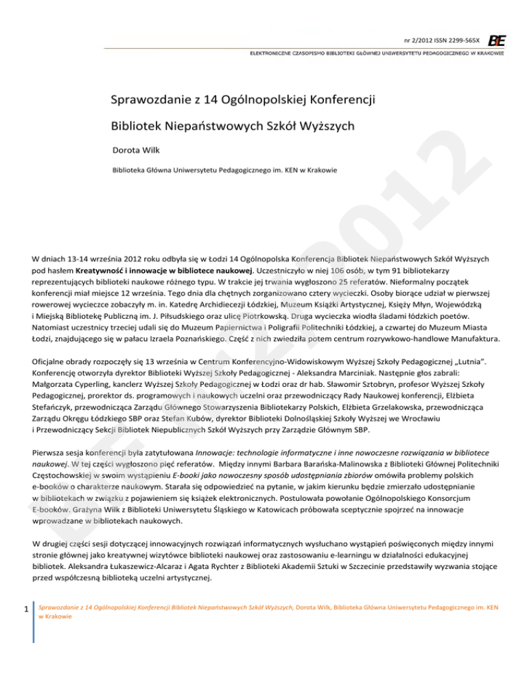 nr 2/2012 ISSN 2299‐565X Sprawozdanie z 14 Ogólnopolskiej Konferencji Bibliotek Niepaństwowych Szkół Wyższych 01 Biblioteka Główna Uniwersytetu Pedagogicznego im. KEN w Krakowie 2 Dorota Wilk nr 2/ 2 W dniach 13‐14 września 2012 roku odbyła się w Łodzi 14 Ogólnopolska Konferencja Bibliotek Niepaństwowych Szkół Wyższych pod hasłem Kreatywność i innowacje w bibliotece naukowej. Uczestniczyło w niej 106 osób, w tym 91 bibliotekarzy reprezentujących biblioteki naukowe różnego typu. W trakcie jej trwania wygłoszono 25 referatów. Nieformalny początek konferencji miał miejsce 12 września. Tego dnia dla chętnych zorganizowano cztery wycieczki. Osoby biorące udział w pierwszej rowerowej wycieczce zobaczyły m. in. Katedrę Archidiecezji Łódzkiej, Muzeum Książki Artystycznej, Księży Młyn, Wojewódzką i Miejską Bibliotekę Publiczną im. J. Piłsudskiego oraz ulicę Piotrkowską. Druga wycieczka wiodła śladami łódzkich poetów. Natomiast uczestnicy trzeciej udali się do Muzeum Papiernictwa i Poligrafii Politechniki Łódzkiej, a czwartej do Muzeum Miasta Łodzi, znajdującego się w pałacu Izraela Poznańskiego. Część z nich zwiedziła potem centrum rozrywkowo‐handlowe Manufaktura. Bi E Oficjalne obrady rozpoczęły się 13 września w Centrum Konferencyjno‐Widowiskowym Wyższej Szkoły Pedagogicznej „Lutnia”. Konferencję otworzyła dyrektor Biblioteki Wyższej Szkoły Pedagogicznej ‐ Aleksandra Marciniak. Następnie głos zabrali: Małgorzata Cyperling, kanclerz Wyższej Szkoły Pedagogicznej w Łodzi oraz dr hab. Sławomir Sztobryn, profesor Wyższej Szkoły Pedagogicznej, prorektor ds. programowych i naukowych uczelni oraz przewodniczący Rady Naukowej konferencji, Elżbieta Stefańczyk, przewodnicząca Zarządu Głównego Stowarzyszenia Bibliotekarzy Polskich, Elżbieta Grzelakowska, przewodnicząca Zarządu Okręgu Łódzkiego SBP oraz Stefan Kubów, dyrektor Biblioteki Dolnośląskiej Szkoły Wyższej we Wrocławiu i Przewodniczący Sekcji Bibliotek Niepublicznych Szkół Wyższych przy Zarządzie Głównym SBP. Pierwsza sesja konferencji była zatytułowana Innowacje: technologie informatyczne i inne nowoczesne rozwiązania w bibliotece naukowej. W tej części wygłoszono pięć referatów. Między innymi Barbara Barańska‐Malinowska z Biblioteki Głównej Politechniki Częstochowskiej w swoim wystąpieniu E‐booki jako nowoczesny sposób udostępniania zbiorów omówiła problemy polskich e‐booków o charakterze naukowym. Starała się odpowiedzieć na pytanie, w jakim kierunku będzie zmierzało udostępnianie w bibliotekach w związku z pojawieniem się książek elektronicznych. Postulowała powołanie Ogólnopolskiego Konsorcjum E‐booków. Grażyna Wilk z Biblioteki Uniwersytetu Śląskiego w Katowicach próbowała sceptycznie spojrzeć na innowacje wprowadzane w bibliotekach naukowych. W drugiej części sesji dotyczącej innowacyjnych rozwiązań informatycznych wysłuchano wystąpień poświęconych między innymi stronie głównej jako kreatywnej wizytówce biblioteki naukowej oraz zastosowaniu e‐learningu w działalności edukacyjnej bibliotek. Aleksandra Łukaszewicz‐Alcaraz i Agata Rychter z Biblioteki Akademii Sztuki w Szczecinie przedstawiły wyzwania stojące przed współczesną biblioteką uczelni artystycznej. 1 Sprawozdanie z 14 Ogólnopolskiej Konferencji Bibliotek Niepaństwowych Szkół Wyższych, Dorota Wilk, Biblioteka Główna Uniwersytetu Pedagogicznego im. KEN w Krakowie nr 2/2012 ISSN 2299‐565X 01 2 W części konferencji zatytułowanej Kreatywne działania promocyjne w bibliotekach naukowych głos zabrało pięciu referentów. W ankiecie ewaluacyjnej na zakończenie konferencji za najciekawsze wygłoszone w tej części obrad uznano referaty: Aleksandry Fajfer i Karoliny Imiołek z Biblioteki Akademii im. Frycza Modrzewskiego Wszystko sprowadza się do pomysłu. Skuteczny marketing instytucji non profit oraz Magdaleny Kokosińskiej z Biblioteki Wyższej Szkoły Pedagogicznej w Łodzi pt. Działalność kulturalno‐popularyzatorska bibliotek naukowych. Przejaw kreatywności czy walka o klienta? Tego samego dnia wydano uroczystą kolację dla osób obecnych na konferencji, podczas której organizatorzy przygotowali liczne atrakcje. Około godziny 22 chętnych zaproszono do zwiedzania znajdującego się w pobliżu Muzeum Książki Artystycznej, po którym oprowadzali ich właściciele ‐ państwo Jadwiga i Paweł Tryzno. Uczestnicy mogli podziwiać zgromadzone przez gospodarzy eksponaty, wziąć je do ręki i dokładnie obejrzeć. Drugi dzień obrad rozpoczął się panelem Kreatywność w zarządzaniu biblioteką naukową. W czasie jego trwania wygłoszono sześć referatów. Małgorzata Wiśniewska z Biblioteki Uniwersytetu Warmińsko‐Mazurskiego zaznajomiła słuchaczy z regułami i zasadami zarządzania czasem pracy. Stefan Kubów, dyrektor Biblioteki Dolnośląskiej Szkoły Wyższej, omówił istotę innowacyjności i różne sposoby jej klasyfikacji, po czym wskazał na czynniki wpływające pozytywnie na twórczą postawę pracowników oraz pola dla kreatywnych działań w bibliotece. Bi E nr 2/ 2 W ostatniej sesji konferencji zaprezentowało się czterech prelegentów. Aneta Kowalska z Biblioteki Głównej Politechniki Krakowskiej przedstawiła różnorodne formy komunikacji z czytelnikami. Janina Przybysz i Paweł Pioterek opisali wyniki badań ankietowych dotyczących zadowolenia z pracy, przeprowadzonych wśród pracowników bibliotek niepaństwowych szkół wyższych. Dużym zainteresowaniem wśród uczestników spotkało się wystąpienie Agnieszki Folgi i Joanny Kołakowskiej zatytułowane Zarządzanie projektem „Bibliotekarka nowoczesną kobietą” jako przykład nowych możliwości dla bibliotek, w którym autorki omówiły organizację i przebieg warsztatów w Bibliotece Głównej Uniwersytetu Pedagogicznego, przeznaczonych dla pań pracujących w bibliotekach. Pro