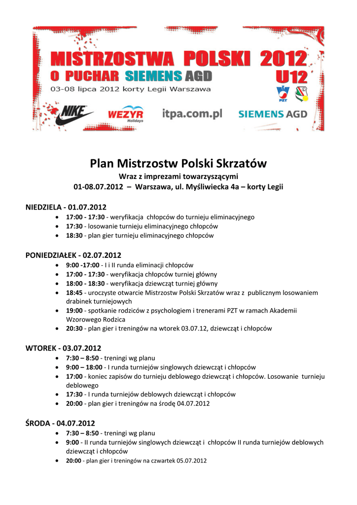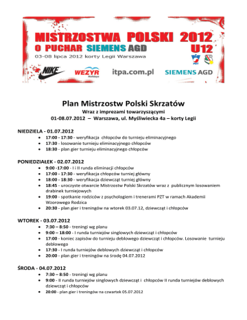 Plan Mistrzostw Polski Skrzatów Wraz z imprezami towarzyszącymi 01‐08.07.2012 – Warszawa, ul. Myśliwiecka 4a – korty Legii NIEDZIELA ‐ 01.07.2012 • • • 17:00 ‐ 17:30 ‐ weryfikacja chłopców do turnieju eliminacyjnego 17:30 ‐ losowanie turnieju eliminacyjnego chłopców 18:30 ‐ plan gier turnieju eliminacyjnego chłopców PONIEDZIAŁEK ‐ 02.07.2012 • • • • • • 9:00 ‐17:00 ‐ I i II runda eliminacji chłopców 17:00 ‐ 17:30 ‐ weryfikacja chłopców turniej główny 18:00 ‐ 18:30 ‐ weryfikacja dziewcząt turniej główny 18:45 ‐ uroczyste otwarcie Mistrzostw Polski Skrzatów wraz z publicznym losowaniem drabinek turniejowych 19:00 ‐ spotkanie rodziców z psychologiem i trenerami PZT w ramach Akademii Wzorowego Rodzica 20:30 ‐ plan gier i treningów na wtorek 03.07.12, dziewcząt i chłopców WTOREK ‐ 03.07.2012 • • • • • 7:30 – 8:50 ‐ treningi wg planu 9:00 – 18:00 ‐ I runda turniejów singlowych dziewcząt i chłopców 17:00 ‐ koniec zapisów do turnieju deblowego dziewcząt i chłopców. Losowanie turnieju deblowego 17:30 ‐ I runda turniejów deblowych dziewcząt i chłopców 20:00 ‐ plan gier i treningów na środę 04.07.2012 ŚRODA ‐ 04.07.2012 • • • 7:30 – 8:50 ‐ treningi wg planu 9:00 ‐ II runda turniejów singlowych dziewcząt i chłopców II runda turniejów deblowych dziewcząt i chłopców 20:00 ‐ plan gier i treningów na czwartek 05.07.2012 CZWARTEK ‐ 05.07.2012 • • 7.30 – 8:50 ‐ treningi wg planu 9.00 ‐ III runda turniejów singlowych dziewcząt i chłopców, ćwierćfinały turniejów deblowych dziewcząt i chłopców Siemens AGD Tennis Day • • • • • • • • 13:00 – 15:00 ‐ miniturniej dla dzieci‐ podopiecznych Stowarzyszenia SOS Wioski Dziecięce, zaproszonych przez Fundacje Oriflame. 14:00 ‐ spotkanie uczestników Mistrzostw Polski Skrzatów z seniorami Legii w kawiarni klubowej na temat 90 ‐ letniej historii tenisa na kortach Legii 15:30 – 16:00 ‐ warsztaty z Pawłem Habratem, psychologiem sportu. 16:00 – 17:00 ‐ pokazowy mecz mikstowy z udziałem zawodników Siemens AGD Tennis Team oraz zaproszonych młodych zawodniczek. 17:00 – 17:45 ‐ pokazowy mecz Marcina Matkowskiego i Mariusza Fyrstenberga z VIPami 17:45 – 18:00 ‐ sesja zdjęciowa Marcina i Mariusza oraz VIPów z dziećmi i z zawodnikami Siemens AGD Tennis Team 18:15 – 19:15 ‐ miniturniej Siemens AGD Tennis Team: Szymon Walków, Kamil Majchrzak, Philip Gresk, Kamil Gajewski 20:00 ‐ plan gier na piątek 06.07.2012 PIĄTEK ‐ 06.07.2012 • • 7.30 ‐ 8.50 ‐ treningi wg planu 9.00 ‐ ćwierćfinały turniejów singlowych dziewcząt i chłopców, półfinały turniejów deblowych dziewcząt i chłopców SOBOTA ‐ 07.07.2012 • • • Półfinały turniejów singlowych dziewcząt i chłopców Finał turnieju deblowego dziewcząt Finał turnieju deblowego chłopców NIEDZIELA ‐ 08.07.2012 • • Finał turnieju singlowego dziewcząt Finał turnieju singlowego chłopców Po meczach finałowych odbędzie się uroczyste wręczenie nagród. Dla zwycięzców, finalistów i półfinalistów Mistrzostw Polski Skrzatów przewidziano : 1) Puchary i medale 2) Bony wartościowe umożliwiające zakupy w naszym sklepie Nike. Łączna pula wyniesie 9600 zł. wg następującego klucza : a) Gra singlowa dziewcząt i chłopców: • ‐ Mistrzowie Polski: talon o wartości 1600 zł. • ‐ Wicemistrzowie Polski: talon o wartości 800 zł. • ‐ III miejsce: talony o wartości 400 zł. b) Gra deblowa dziewcząt i chłopców: • ‐ Mistrzowie Polski: talony o wartości 800 zł. na parę. • ‐ Wicemistrzowie Polski: talony o wartości 400 zł. na parę. • ‐ III miejsce: talony o wartości 200 zł. na parę. 3) Dla zwycięzców, finalistów, półfinalistów i ćwierć finalistów turniejów singlowych i deblowych przewidziano nagrody od firmy Oriflame o łącznej wartości 9200 zł. 4) Nagrody biura podróży Wezyr Holidays: a) Dla Mistrza Polski w singlu chłopców przewidziano bon na 7 dni pobytu all inclusive w czterogwiazdkowym Hotelu Eftalia Village w Turcji w opcji 2 +1 z terminem odlotu do wyboru między 20 września a 20 października. b) Dla Mistrzyni Polski w turnieju singlowym dziewcząt przewidziano bon na 7 dni pobytu all inclusive w Hotelu Eftalia Aqua w Turcji w opcji 2 +1 z terminem odlotu do wyboru miedzy 20 września a 20 października. c) Dla wicemistrzów Polski w turniejach singlowych dziewcząt i chłopców przewidziano rabat 20% rabatu na wybrany przez Wezyr Holidays czterogwiazdkowy hotel w okresie od 20 września do 20 października dla opcji 2 +1 na 7 dni all inclusive. d) Dla brązowych medalistów turniejów singlowych dziewcząt i chłopców przewidziano 15 % rabatu na wybrany przez Wezyr Holidays czterogwiazdkowy hotel w okresie od 20 września do 20 października dla opcji 2 +1 na 7 dni all inclusive. 5) Dla wszystkich uczestników Turniejów Głównych Mistrzostw Polski Skrzatów przewidziano koszulki z logo turnieju oraz inne atrakcyjne gadżety. 6) W czasie turniejów Mistrzostw Polski Skrzatów dla osób utrzymujących się w drabinkach turniejów singlowych przewidziano darmowe posiłki (II śniadanie, lunch).