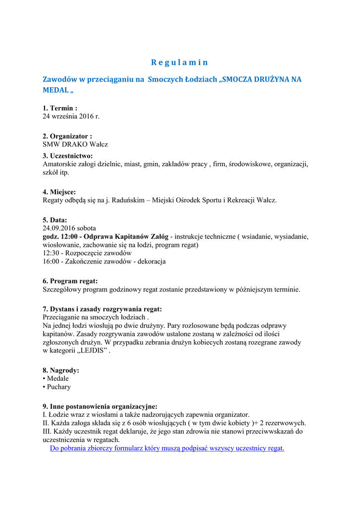 Regulamin Zawodów w przeciąganiu na Smoczych Łodziach „SMOCZA DRUŻYNA NA MEDAL „ 1. Termin : 24 września 2016 r. 2. Organizator : SMW DRAKO Wałcz 3. Uczestnictwo: Amatorskie załogi dzielnic, miast, gmin, zakładów pracy , firm, środowiskowe, organizacji, szkół itp. 4. Miejsce: Regaty odbędą się na j. Raduńskim – Miejski Ośrodek Sportu i Rekreacji Wałcz. 5. Data: 24.09.2016 sobota godz. 12:00 - Odprawa Kapitanów Załóg - instrukcje techniczne ( wsiadanie, wysiadanie, wiosłowanie, zachowanie się na łodzi, program regat) 12:30 - Rozpoczęcie zawodów 16:00 - Zakończenie zawodów - dekoracja 6. Program regat: Szczegółowy program godzinowy regat zostanie przedstawiony w późniejszym terminie. 7. Dystans i zasady rozgrywania regat: Przeciąganie na smoczych łodziach . Na jednej łodzi wiosłują po dwie drużyny. Pary rozlosowane będą podczas odprawy kapitanów. Zasady rozgrywania zawodów ustalone zostaną w zależności od ilości zgłoszonych drużyn. W przypadku zebrania drużyn kobiecych zostaną rozegrane zawody w kategorii „LEJDIS” . 8. Nagrody: • Medale • Puchary 9. Inne postanowienia organizacyjne: I. Łodzie wraz z wiosłami a także nadzorujących zapewnia organizator. II. Każda załoga składa się z 6 osób wiosłujących ( w tym dwie kobiety )+ 2 rezerwowych. III. Każdy uczestnik regat deklaruje, że jego stan zdrowia nie stanowi przeciwwskazań do uczestniczenia w regatach. Do pobrania zbiorczy formularz który muszą podpisać wszyscy uczestnicy regat. Formularz z podpisami wszystkich uczestników kierownicy ekip mają obowiązek złożyć w biurze regat podczas odprawy technicznej, co jest warunkiem dopuszczenia do zawodów. IV. Wszystkie załogi muszą startować w kamizelkach asekuracyjnych , które zabezpieczy organizator. V. W regatach może brać udział młodzież od 15 roku życia za zgodą prawnych opiekunów. VI. Prawo startu mają załogi które wpłacą do dnia 22.09.2016 r. opłatę zgłoszeniową w wysokości 120 zł na konto Stowarzyszenia Miłośników Wody Drako Wałcz NR KONTA: DEUTSCHE BANK 79 1910 1048 2663 9539 0685 0001 VII. Opłata startowa nie podlega zwrotowi. 10. Zgłoszenia: Zgłoszenia przez formularz zgłoszeniowy na stronie www.drakowalcz.pl Kontakt do organizatora: Biuro regat: Anna Freimut tel: 503 339 554 Paweł Łakomy tel: 600 033 212