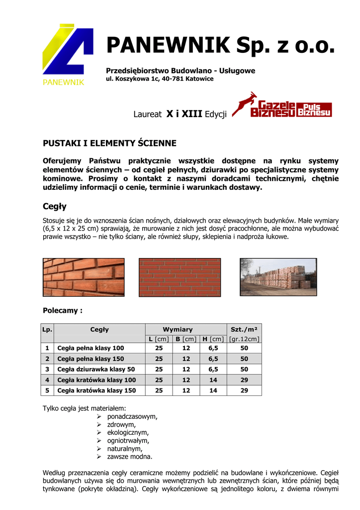 PANEWNIK Sp. z o.o. Przedsiębiorstwo Budowlano - Usługowe ul. Koszykowa 1c, 40-781 Katowice Laureat X i XIII Edycji PUSTAKI I ELEMENTY ŚCIENNE Oferujemy Państwu praktycznie wszystkie dostępne na rynku systemy elementów ściennych – od cegieł pełnych, dziurawki po specjalistyczne systemy kominowe. Prosimy o kontakt z naszymi doradcami technicznymi, chętnie udzielimy informacji o cenie, terminie i warunkach dostawy. Cegły Stosuje się je do wznoszenia ścian nośnych, działowych oraz elewacyjnych budynków. Małe wymiary (6,5 x 12 x 25 cm) sprawiają, Ŝe murowanie z nich jest dosyć pracochłonne, ale moŜna wybudować prawie wszystko – nie tylko ściany, ale równieŜ słupy, sklepienia i nadproŜa łukowe. Polecamy : Lp. Cegły Wymiary L [cm] Szt./m² B [cm] H [cm] [gr.12cm] 1 Cegła pełna klasy 100 25 12 6,5 50 2 Cegła pełna klasy 150 25 12 6,5 50 3 Cegła dziurawka klasy 50 25 12 6,5 50 4 Cegła kratówka klasy 100 25 12 14 29 5 Cegła kratówka klasy 150 25 12 14 29 Tylko cegła jest materiałem: ponadczasowym, zdrowym, ekologicznym, ogniotrwałym, naturalnym, zawsze modna. Według przeznaczenia cegły ceramiczne moŜemy podzielić na budowlane i wykończeniowe. Cegieł budowlanych uŜywa się do murowania wewnętrznych lub zewnętrznych ścian, które później będą tynkowane (pokryte okładziną). Cegły wykończeniowe są jednolitego koloru, z dwiema równymi powierzchniami fasadowymi. Wewnątrz są one najczęściej puste, dlatego ściany z takich cegieł są cieplejsze. Do wykończenia uŜywa się cegieł fakturowych (z rysunkiem reliefowym) i figurowych. Do palenisk, np. budowy kominków lub grilli ogrodowych, stosuje się cegły szamotowe, wyprodukowane z gliny odpornej na ogień. Wytrzymują one temperaturę wyŜszą niŜ 10000C. Cegły szamotowe są o Ŝółtawym kolorze i ziarnistej strukturze. Kolor cegły zaleŜy najczęściej od składu gliny. Większość gatunków gliny po wypaleniu uzyskuje klasyczny kolor cegieł - czerwony. W zaleŜności od ilości pustych miejsc w cegle, dzielimy je na pustakowe i pełne. Czym więcej jest pustych miejsc (mogą one stanowić ponad 50%), tym mur z cegły jest cieplejszy. JeŜeli uŜywamy cegieł pustakowych, ściany moŜna robić cieńsze, poniewaŜ izolacja cieplna obiektu budowlanego na tym nie ucierpi. Zaletą cegieł pustakowych jest to, Ŝe ich masa jest mniejsza, co sprawia mniejsze obciąŜenie fundamentów. Są jednak równieŜ pewne wady: podczas murowania pęknięcia w takich cegłach mogą się napełnić zaprawą, co sprawi, Ŝe pojawią się mostki termiczne i ściany staną się one chłodniejsze. Chcą temu zapobiec, najlepiej jest wybierać cegły o mniejszej średnicy pustych miejsc, a zaprawę bardziej lepką. Pustaki Z pustaków moŜna budować wszystkie murowane warstwy ścian. To elementy z otworami. DuŜa powierzchnia otworów sprawia, Ŝe pustaki nawet przy dość duŜych wymiarach nie są zbyt cięŜkie – nie waŜą więcej niŜ 20 kg. Pustak ŜuŜlowy składa się z wielu kawałków ŜuŜla piecowego połączonego w jedną całość za pomocą zaprawy cementowej. Ze względu na niską cenę produkcji największym odbiorcą ŜuŜla dzisiaj jest gałąź budownictwa. Jest on tańszy od innych rodzajów pustaków i w stosunku do swojej ceny ma dobra jakość. Wykorzystywany jest szczególnie przy budowie ścian i konstrukcji, na które nie wpływają zbyt wielkie naciski. Z pustaka ŜuŜlowego lub ŜuŜlobetonowego budujemy ścianki garaŜów, budynków gospodarczych gdzie nie trzeba odpowiedniej grubości ścian zewnętrznych dla utrzymania ciepła. Wykorzystywane są przede wszystkim jako wypełnianie szkieletów róŜnego rodzaju budynków. Stosowane są do wykańczania luk okiennych i dzięki temu, Ŝe pasują do większości odmian innych pustaków moŜna je łączyć i przycinać na odpowiednią wielkość. Ich budowa pozwala na lŜejsze i prostsze przycięcie niŜ ciecie zwykłych pustaków dlatego stosuje się je równieŜ przy budowie stropów, progów czy tez jakichkolwiek skomplikowanych wykończeniach. A przecieŜ kaŜdy wie, iŜ bez pustaków nie ma mowy o budowaniu wymarzonego domku. Polecamy : Lp. Pustaki z betonu 1 komórkowego GAZOBETON – 160 szt./pal L [cm] 6 B [cm] 24 C [cm] 59 [kg] 6,75 2 GAZOBETON – 120 szt./pal 8 24 59 9,00 3 GAZOBETON – 80 szt./pal 12 24 59 11,5 4 GAZOBETON – 50 szt./pal 18 24 59 17,25 5 GAZOBETON – 48 szt./pal 24 24 59 23,00 6 GAZOBETON – 24 szt./pal 36 24 59 34,50 Lp. Wymiary Masa Pustaki ścienne Wymiary L [mm] B [mm] C [mm] 1 PUSTAK ŚCIENNY AM klasa 150 288 88 188 2 PUSTAK ŚCIENNY AM klasa 150 288 120 188 3 PUSTAK ŚCIENNY AM klasa 150 288 138 188 4 PUSTAK ŚCIENNY AM klasa 150 250 188 188 5 PUSTAK ŚCIENNY AM klasa 150 288 188 188 6 PUSTAK śUśLOWY 9 19 39 7 PUSTAK śUśLOWY 12 19 39 8 PUSTAK śUśLOWY 19 19 39 9 PUSTAK śUśLOWY 29 19 39 Biuro: e-mail: [email protected] tel./fax 32 206 34 93; 32 252 93 59 Dział Handlowy - Kierownik e-mail: [email protected] tel. kom. 501 188 739, 501 188 735