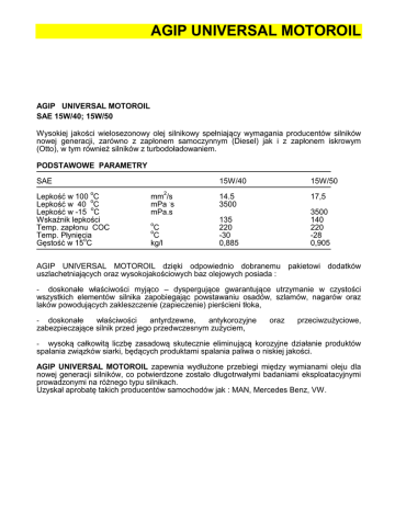 AGIP UNIVERSAL MOTOROIL AGIP UNIVERSAL MOTOROIL SAE 15W/40; 15W/50 Wysokiej jakości wielosezonowy olej silnikowy spełniający wymagania producentów silników nowej generacji, zarówno z zapłonem samoczynnym (Diesel) jak i z zapłonem iskrowym (Otto), w tym również silników z turbodoładowaniem. PODSTAWOWE PARAMETRY SAE Lepkość w 100 ooC Lepkość w 40 oC Lepkość w -15 C Wskaźnik lepkości Temp. zapłonu COC Temp. Płynięcia Gęstość w 15oC mm2/s. mPa s mPa.s o C o C kg/l 15W/40 15W/50 14.5 3500 17,5 135 220 -30 0,885 3500 140 220 -28 0,905 AGIP UNIVERSAL MOTOROIL dzięki odpowiednio dobranemu pakietowi dodatków uszlachetniających oraz wysokojakościowych baz olejowych posiada : - doskonałe właściwości myjąco – dyspergujące gwarantujące utrzymanie w czystości wszystkich elementów silnika zapobiegając powstawaniu osadów, szlamów, nagarów oraz laków powodujących zakleszczenie (zapieczenie) pierścieni tłoka, - doskonałe właściwości antyrdzewne, antykorozyjne zabezpieczające silnik przed jego przedwczesnym zużyciem, oraz przeciwzużyciowe, - wysoką całkowitą liczbę zasadową skutecznie eliminującą korozyjne działanie produktów spalania związków siarki, będących produktami spalania paliwa o niskiej jakości. AGIP UNIVERSAL MOTOROIL zapewnia wydłużone przebiegi między wymianami oleju dla nowej generacji silników, co potwierdzone zostało długotrwałymi badaniami eksploatacyjnymi prowadzonymi na różnego typu silnikach. Uzyskał aprobatę takich producentów samochodów jak : MAN, Mercedes Benz, VW. SPECYFIKACJE AGIP UNIVERSAL MOTOROIL spełnia następujące klasyfikacje i specyfikacje: API CF-4/SG CCMC (ACEA) D-4, G-4, PD-2 MIL-L-2104 E MIL-L-46152 E Detroit Diesel Allison Type C-4 CATERPILLAR TO-2 MAN 271 Mercedes Benz 227.1 ZASTOSOWANIE AGIP UNIVERSAL MOTOROIL przeznaczony jest do smarowania różnorodnych silników, głównie Diesla samochodów osobowych i dostawczych, silników montowanych w ciężkich maszynach budowlanych, drogowych, traktorach, pojazdach terenowych, ciężarówkach i autobusach. AGIP UNIVERSAL MOTOROIL jest przydatny w obsłudze mieszanego parku samochodowego, eksploatowanego nawet w najcięższych warunkach oraz gwałtownych zmianach temperatury.