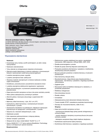 Oferta ilość miejsc:: 5 ładowność [kg] ~ 781 Amarok podwójna kabina, Highline 2.0 BiTDI 4MOTION 180 KM (132 kW), skrzynia biegów: automatyczna, 8-stopniowa [model bazowy: [S1BC3A/WF9/STH] Kolor nadwozia: czarny "Deep" perłowy [2T2T] tapicerka skórzana "Vienna" siedzenia: antracytowe deska rozdzielcza: antracytowa podłoga: czarna [N0K/HV] Wyposażenie standardowe Nadwozie Konstrukcja ramy nośnej z profili zamkniętych, ze stali o dużej wytrzymałości Elektroniczny system stabilizacji toru jazdy z asystentem hamowania, ABS (włącznie z offroad ABS), ASR i EDS Światła przeciwmgielne z przodu Nadwozie czterodrzwiowe Światła do jazdy dziennej włączane automatycznie Tylny zderzak ze zintegrowanym stopniem,chromowany Poduszka powietrzna dla kierowcy i pasażera z możliwością dezaktywacji poduszki pasażera Zderzak przedni lakierowany w kolorze nadwozia z chromowanymi listwami i pierścieniami wokół lamp przeciwmgielnych Lusterka zewnętrzne prawe: wypukłe Lusterko zewnętrzne lewe: asferyczne Obudowy lusterek zewnętrznych w kolorze nadwozia w dolnej części chromowane Dodatkowe, przeciwkurzowe uszczelnienie zewnętrzne drzwi Lusterka zewnętrzne elektrycznie regulowane i ogrzewane Szyby termoizolacyjne, w przestrzeni pasażerskiej dodatkowo przyciemniane Klapa tylna komfort zamykana na klucz (nie przez centralny zamek) Wlew paliwa zabezpieczony centralnym zamkiem Zbiornik paliwa z tworzywa sztucznego o pojemności 80 l Podwozie Bębnowy układ hamulcowy, z tyłu, 38,1 cm (15") Hydrauliczny układ hamulcowy z wentylowanymi tarczami hamulcowymi, z przodu Zawieszenie niezależne na podwójnych, trójkątnych wahaczach poprzecznych ze sprężynami i amortyzatorami, z przodu Sztywna oś z resorami wielopiórowymi, z tyłu Stabilizator przedni Koło zapasowe pełnowymiarowe z obręczą stalową Zestaw narzędzi i podnośnik Obręcze kół ze stopu metali lekkich "ALDO" 8 J x 17 Opony 245/65 R17 111T (przy wyborze BlueMotion Technology opony o zmniejszonym oporze toczenia) Boczne poduszki powietrze w kabinie kierowcy z kurtynami powietrznymi Koło kierownicy obszyte skórą Bezwładnościowe, trójpunktowe pasy bezpieczeństwa, z napinaczami - dla kierowcy i pasażera z regulacją wysokości zamocowania Zagłówki tylne Mocowania Isofix do fotelików dziecięcych w siedzeniu, w przedziale pasażerskim Reflektory halogenowe Kierunkowskazy boczne Światło cofania Immobiliser Zabezpieczenie przed złamaniem blokady kierownicy Trzecie światło STOP i oświetlenie przedziału ładunkowego Zaczepy do mocowania ładunku, stałe (4 szt.) Wnętrze klapa tylna komfort zamykana na klucz - mechaniczna blokada klapy tylnej (zamek zintegrowany w uchwycie klapy) - zamek otwierany/ zamykany za pomocą klucza (nie przez centralny zamek) - łatwiejsze zamykanie klapy dzięki drążkowi skrętnemu Komfortowe wykończenie kabiny kierowcy Komfortowy fotel kierowcy i pasażera z regulacją wysokości Bezpieczeństwo Data utworzenia dokumentu: 09.06.2014 | Data publikacji cennika: 01.01.2014 | Numer oferty: 1337167 Strona: 1/5 Oferta Konsola środkowa pomiędzy siedzeniem kierowcy i pasażera z zamykanym schowkiem i tapicerowanym podłokietnikiem 6 głośników pasywnych, 4 z przodu, 2 z tyłu Podświetlenie deski rozdzielczej z możliwością regulacji natężenia światła Gniazdo 12V w konsoli środkowej oraz w przedziale ładunkowym na burcie bocznej Schowek (szuflada) pod siedzeniem kierowcy i pasażera Kanał nawiewowy doprowadzający ciepłe lub zimne powietrze do przedziału pasażerskiego Siedzenia wyłożone tkaniną "Endless" Centralny zamek sterowany pilotem z zabezpieczeniem "Safe" Gałka dźwigni zmiany biegów i dźwignia hamulca ręcznego pokryta skórą Klimatyzacja "Climatronic" z automatyczną regulacją Schowek po stronie pasażera z pokrywą zamykaną na klucz Szyby w drzwiach bocznych sterowane elektrycznie Formowana podsufitka, wzmocniona, z konsolą nad głową Tempomat elektroniczny Podłoga wyłożona wykładziną dywanową w kabinie kierowcy i przedziela pasażerskim Wyświetlacz wielofunkcyjny "Plus" Stopień wejściowy w kabinie kierowcy Radio z odtwarzaczem CD-MP3 "RCD 310" Wycieraczki przedniej szyby z regulacją prędkości Regulacja zasięgu reflektorów Dwie osłony przeciwsłoneczne 3-osobowe siedzenie z zagłówkami w przestrzeni pasażerskiej Wyposażenie funkcjonalne Pakiet dla palących Przygotowanie do montażu haka Norma emisji spalin Euro 5 Instalacja 12V Model bazowy S1BC3A/ 2.0 BiTDI 4MOTION 180 KM (132 kW), WF9/ skrzynia biegów: automatyczna, 8STH stopniowa 131 294,00 Wyposażenie dodatkowe 2T2T czarny "Deep" perłowy 2 307,00 N0K/ HV tapicerka skórzana "Vienna" siedzenia: antracytowe deska rozdzielcza: antracytowa podłoga: czarna 5 866,00 7AS alarm antywłamaniowy z własnym zasilaniem, funkcją dozoru wnętrza kabiny kierowcy oraz zabezpieczeniem przed odholowaniem (otwarcie wszystkich drzwi) - 2 kluczyki składane 1 123,00 7X2 czujniki parkowania w przednim i tylnym zderzaku 1 868,00 1D1 hak holowniczy stały - stabilizacja przyczepy w połączeniu z elektronicznym programem stabilizacji - średnica kuli haka 50 mm - gniazdo 13-stykowe 969,00 6XE lusterka zewnętrzne składane elektrycznie 525,00 ZW1 pakiet zimowy - siedzenia kierowcy i pasażera ogrzewane - ogrzewane dysze spryskiwaczy szyby przedniej RN5/ nawigacja satelitarna "RNS 315" Z31/ - radio z odtwarzaczem CD-MP3 "RCD 310" 7QL - 6 głośników: 4 z przodu i 2 z tyłu, antena w lusterkach zewnętrznych - 5-calowy kolorowy wyświetlacz dotykowy - dostęp do podstawowych funkcji telefonu komórkowego poprzez ekran dotykowy - dysk twardy o pojemności 4 GB - zintegrowany czytnik kart SD - złącze AUX-IN zintegrowane, umożliwiające podłączenie zewnętrznego źródła dźwięku - zintegrowany wyświetlacz dla klimatyzacji oraz optycznego systemu parkowania - mapa Europy Zachodniej lub mapa Europy Wschodniej zapisana w pamięci 2 720,00 ZR1 obręcze kół ze stopu metali lekkich "Durban