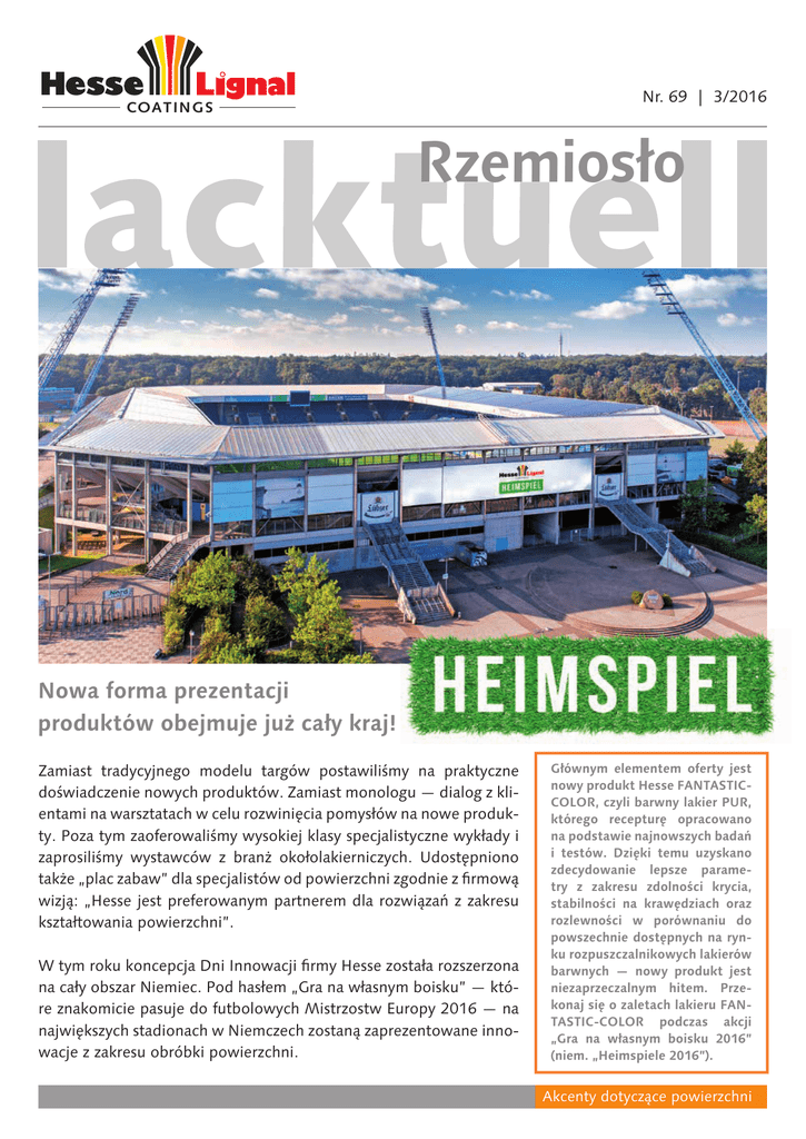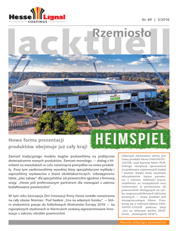Nr. 69 | 3/2016 COAT I N G S Rzemiosło Nowa forma prezentacji produktów obejmuje już cały kraj! Zamiast tradycyjnego modelu targów postawiliśmy na praktyczne doświadczenie nowych produktów. Zamiast monologu — dialog z klientami na warsztatach w celu rozwinięcia pomysłów na nowe produkty. Poza tym zaoferowaliśmy wysokiej klasy specjalistyczne wykłady i zaprosiliśmy wystawców z branż okołolakierniczych. udostępniono także „plac zabaw” dla specjalistów od powierzchni zgodnie z firmową wizją: „Hesse jest preferowanym partnerem dla rozwiązań z zakresu kształtowania powierzchni”. W tym roku koncepcja dni Innowacji firmy Hesse została rozszerzona na cały obszar Niemiec. Pod hasłem „Gra na własnym boisku” — które znakomicie pasuje do futbolowych Mistrzostw Europy 2016 — na największych stadionach w Niemczech zostaną zaprezentowane innowacje z zakresu obróbki powierzchni. Głównym elementem oferty jest nowy produkt Hesse FANTASTICCOLOR, czyli barwny lakier PUR, którego recepturę opracowano na podstawie najnowszych badań i testów. Dzięki temu uzyskano zdecydowanie lepsze parametry z zakresu zdolności krycia, stabilności na krawędziach oraz rozlewności w porównaniu do powszechnie dostępnych na rynku rozpuszczalnikowych lakierów barwnych — nowy produkt jest niezaprzeczalnym hitem. Przekonaj się o zaletach lakieru FANTASTIC-COLOR podczas akcji „Gra na własnym boisku 2016” (niem. „Heimspiele 2016”). Akcenty dotyczące powierzchni PRodukty Voice of Customer, czyli opinie naszych klientów są dla nas bardzo ważne! drodzy Czytelnicy! Podczas mistrzostw Europy w piłce nożnej niemiecka drużyna niestety nie sięgnęła po najwyższe trofeum. Mimo to w trakcie całego turnieju panowała znakomita atmosfera, którą tworzyło barwne grono kibiców z różnych krajów. Futbol jest i będzie najpopularniejszym sportem w Europie. Zadbaliśmy o to, aby podtrzymać tę niepowtarzalną atmosferę i dobry nastrój także po zakończeniu zmagań sportowych. W drugiej połowie roku zespół firmy Hesse skoncentruje się na dwóch interesujących projektach. Pierwszy z nich to premiera wyjątkowego produktu: nowego barwnego lakieru PuR FANtAStIC-CoLoR, a drugi to zapowiadana wcześniej seria regionalnych dni Innowacji, czyli cykl imprez pt. „Gra na własnym boisku”. te tematy będą nas angażować w nadchodzących miesiącach. Produkt FANtAStIC-CoLoR będzie kluczowym „graczem” podczas dni Innowacji. Jego rewelacyjne „przygotowanie do gry” – czyli właściwości użytkowe – zostały potwierdzone przez wielu klientów i liczne testy. Również nasi Czytelnicy mają możliwość bezpłatnego wypróbowania nowego lakieru. Wystarczy zamówić pakiet testowy gratis, klikając „Produkt miesiąca” na stronie www. hesse-lignal.de. Właściwości lakieru FANtAStIC-CoLoR zapewnią utworzenie doskonałej powłoki. Można także wziąć udział w jednej z imprez z cyklu „Gra na własnym boisku” i przekonać się o znakomitych możliwościach FANtAStIC-CoLoR podczas prezentacji na żywo i przy okazji skorzystać z innych punktów bogatego programu dla uczestników. oprócz tego wśród gości rozlosujemy bilety na interesujące mecze Bundesligi. Powodzenia podczas losowania! Życzymy miłej lektury najnowszego wydania magazynu lacktuell i zachęcamy do szybkiej rejestracji udziału w „Grze na własnym boisku” na stronie www. hesse-heimspiel.de. Liczba uczestników jest ograniczona. Z pozdrowieniem, Jens Hesse 2 lacktuell Rzemiosło 3/2016 kultywowane od dawna w firmie Hesse bliskie relacje z klientami, a wręcz całymi segmentami rynków, mają najwyższy priorytet dla wszelkich prac badawczo-rozwojowych mających na celu opracowanie nowych lakierów. taki sposób działania jest kluczowy dla sukcesu naszego przedsiębiorstwa. Nie inaczej było w przypadku lakieru barwnego PuR FANtAStIC-CoLoR. W tym celu przeprowadzono zainicjowaną przez firmę Hesse branżową ankietę wśród wykonawców i nabywców, w której obszernie przeanalizowano tematykę barwnych lakierów PuR. Za szczególnie ważne uznano następujące cechy: - dobre właściwości kryjące i wypełniające, aby zredukować liczbę etapów pracy oraz gramatury powłok - dobra stabilność na pionowych, lakierowanych powierzchniach, a jednocześnie dobra rozlewność na powierzchniach poziomych - wysoka odporność na test obrączki, dzięki czemu można pominąć przezroczystą warstwę wierzchnią www.hesse-lignal.de - szybkie suszenie i prosta obróbka dla uzyskania wysokiej wydajności - znakomite właściwości dotykowe, zapewniające wyjątkowe wrażenia dla użytkowników w porównaniu do popularnych systemów lakierów barwnych PuR - uniwersalne możliwości tworzenia struktur lakierowych i kombinacji nowego produktu Zainteresował Cię nowy produkt FANTASTIC-COLOR, który spełnia oczekiwania wykonawców z zakresu stosowania barwnych lakierów PUR? Zatem skontaktuj się z przedstawicielem firmy Hesse lub odwiedź nas na jednej z imprez z cyklu „Gra na własnym podwórku” i weź udział w prezentacji FANTASTIC-COLOR na żywo. Oprócz tego możesz także zamówić gratis pakiet testowy FANTASTIC-COLOR za pośrednictwem naszej strony internetowej. www. hesse-lignal.de Produkty Znakomita zdolność krycia już po jednym etapie prac To zadanie było niełatwym wyzwaniem dla specjalistów z zakładu w Hamm. Jednak rezultat ich wysiłków — innowacyjny lakier barwny FANTASTIC-COLOR — przeszedł najśmielsze oczekiwania. Już pierwsze próby i testy rynkowe wprawiły zespół projektowy i specjalistów kontrolnych w zachwyt. Bezpośrednie powlekanie lakierem barwnym foliowanych płyt MDF z surowymi krawędziami FANTASTIC-COLOR - zdolność krycia wyższa o 40% dla wszystkich kolorów - zawartość substancji nielotnych wyższa o 25% w porównaniu z serią Hesse UNA-COLOR - aplikacja materiału wyższa nawet o 60% na powierzchniach pionowych w porównani