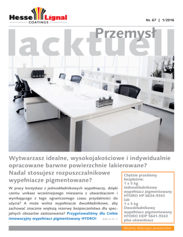 Nr. 67 | 1/2016 COAT I N G S Przemysł Wytwarzasz idealne, wysokojakościowe i indywidualnie opracowane barwne powierzchnie lakierowane? Nadal stosujesz rozpuszczalnikowe Chętnie prześlemy bezpłatnie: wypełniacze pigmentowane? 1 x 5 kg W pracy korzystasz z jednoskładnikowych wypełniaczy, dzięki czemu unikasz wcześniejszego mieszania z utwardzaczem i wynikającego z tego ograniczonego czasu przydatności do użycia? A może wolisz wypełniacze dwuskładnikowe, aby zachować znacznie większą rezerwę bezpieczeństwa dla specjalnych obszarów zastosowania? Przygotowaliśmy dla Ciebie innowacyjny wypełniacz pigmentowany HYDRO! dalej na str. 2 Jednoskładnikowy wypełniacz pigmentowany HYDRO HP 6634-9343 lub 1 x 5 kg Dwuskładnikowy wypełniacz pigmentowany HYDRO HDP 5641-9343 plus utwardzacz Akcenty dotyczące powierzchni Produkty Innowacyjne wypełniacze pigmentowane HYDRO W obecnym wydaniu zajęliśmy się następującymi zagadnieniami: Lakiery wodne są znane na całym świecie a ich popularność stale rośnie. Nasze działania w tym zakresie asortymentu są przejawem troski o środowisko naturalne i o przyszłość następnych pokoleń. Nieustannie inwestujemy w rozwój i dystrybucję systemów lakierowych przyjaznych dla środowiska. Dlatego gorąco zachęcamy: wypróbuj nowe systemy. Zaskoczy Cię jakość rezultatów i łatwe zastosowanie. Systemy wodne w niczym nie ustępują klasycznym lakierom PUR. Nie zwlekaj – otwórz się na nowe. Na zakończenie: czekasz może na zaproszenie na Dni Innowacji 2016? Interesuje Cię, co przygotowaliśmy w nowej edycji imprezy w 2016 roku? Musisz się jeszcze uzbroić w trochę cierpliwości. Ale zapewniamy, że będzie wiele niespodzianek, a informacje o nich przekażemy z odpowiednim wyprzedzeniem. E ff G re e n Jednoskładnikowy wypełniacz pigmentowany HYDRO HP 6634-9343: > Wysokojakościowy, szybkoschnący wypełniacz HYDRO o szczególnych właściwościach tiksotropowych zapewniających dobrą stabilność nawet na wysokich krawędziach. Do ekonomicznych barwnych struktur lakierowych. Szybkoschnący, dobrze szlifowalny. Materiał można dodatkowo suszyć w sposób wymuszony! Dwuskładnikowy wypełniacz pigmentowany HYDRO HDP 5641-9343: > Mieszanina w proporcji (obj.): 16 : 1 z HDR 5081. Szybkoschnący dwuskładnikowy wypełniacz izolujący HYDRO-PUR o zawartości rozpuszczalnika <3% (po mieszaniu!). Nadaje się także w szczególności do obiektów spełniających wymogi „green building” i realizacji w ramach publicznych przetargów. Z uwagi na wysoką zawartość ciał stałych materiał ma bardzo dobre właściwości kryjące i wypełniające – dlatego jest bardzo wydajny! Jakie jeszcze są korzyści dla klienta? Z pozdrowieniem, Jens Hesse Oba materiały można bez problemu kombinować z materiałem HYDRO SPEED-COLOR HB 6525x (st. połysku)- 2 lacktuell Przemysł 1/2016 www.hesse-lignal.de (odcień) lub HYDRO HB 65285-(odcień). i ld ing Życzę Wam Szczęśliwego Nowego Roku! Rok 2015 obfitował w liczne niepokojące wydarzenia polityczne na całym świecie, które trudno zignorować w naszej codziennej pracy. Mimo przeszkód konsekwentnie umacniamy swoją pozycję w branży lakierniczej i zamierzamy to robić także w nadchodzącym 2016 roku. Jesteśmy doskonale przygotowani na wyzwania, jakie niesie przyszłość. W Nowy Rok wkroczymy z nową organizacją pionu sprzedaży, idealnie dostosowaną do potrzeb rynku — umożliwi nam to lepsze dotarcie do docelowych grup klientów i sprawniejsze działanie na poziomie międzynarodowym. Chętnie wyjaśnię szczegóły w kolejnym wydaniu magazynu lacktuell. Bu Drodzy Czytelnicy, n c y f o r Gr e e n e ic i PRO-COLOR Przy niskich nakładach można uzyskać powierzchnię wysokiej jakości, bez normalnie występujących przez dłuższy czas oparów rozpuszczalnika! W połączeniu z lakierem barwnym HYDRO SPEED-COLOR poddanym schnięciu wymuszonemu można uzyskać elegancką, wysokojakościową powierzchnię w najkrótszym czasie. Kombinacja HDP 5641-9343 i lakieru barwnego HYDRO PRO-COLOR HB 65285-(odcień) z uwagi na zawartość rozpuszczalnika <3% w obu produktach nadaje się do zleceń w obiektach „green-building”! Oczywiście, to czego można oczekiwać po lakierach wodnych: brak specjalnego rozcieńczania lub rozcieńczania czyszczącego — wystarczy WODA! Przetestuj materiały i spróbuj znaleźć różnice w stosunku do wypełniaczy rozpuszczalnikowych! Rezultaty mile Cię zaskoczą. Wypełnij kartkę pocztową na stronach tytułowych — opłaci się! Produkty Wysokopołyskowy, matowy i odporny na zadrapania Lakier nawierzchniowy UV do nakładania walcem UU 75069, bezbarwny. Zaprezentowane podczas Dni Innowacji 2015 w firmie Hesse lakierowanie przy użyciu wysokopołyskowego, utwardzanego nadfioletem lakieru UU 75069 w procesie nakładania walcem zostało przyjęte z dużym zainteresowaniem. Lakierowane powierzchnie wykazują znakomitą rozlewność oraz minimalną tendencję do zmiany objętości na optymalnie przygotowanych podłożach. Utworzone powierzchnie w większości zastosowań nie wymagają także polerowania płócienną tarczą polerską. Dzięki dobrej odporności na działanie światła możliwe jest użycie również na wielu odcieniach kolorystycznych. Z uwagi na duże zapotrzebowanie jeszcze bardziej rozszerzyliśmy obszar zastosowań. Jednowarstwowy lakieru UV UU 75079 do nakładania walcem, bezbarwny, obojętny Stosowana już od dawna przy powlekaniu folii, technologia folii rozdzielających wzbudza coraz większe zainteresowanie użytkowników, także w przypadku lakierowania płyt melaminowych i tworzyw drzewnych. Możliwe jest w ramach zaledwie jednego etapu lakierowania nałożenie wymaganych gramatur do 60 g /m² i w razie użycia folii rozdzielających utwardzenie lakieru UV w warunkach obojętnych. Dzięki temu można uniknąć inhibicji utwardzania UV (polimeryzacja), spowodowanej przez tlen z powietrza, uniemożliwiającej optymalny pr