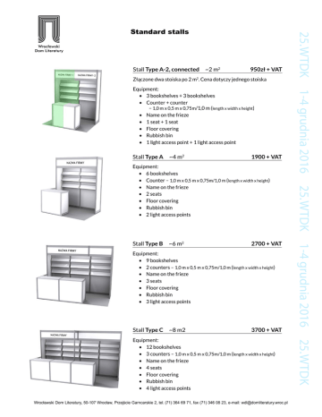 Stall Type A-2, connected ~2 m2 950zł + VAT Złączone dwa stoiska po 2 m2. Cena dotyczy jednego stoiska Equipment: • 3 bookshelves + 3 bookshelves • Counter + counter – 1,0 m x 0,5 m x 0,75m/1,0 m (length x width x height) • Name on the frieze • 1 seat + 1 seat • Floor covering • Rubbish bin • 1 light access point + 1 light access point Stall Type A ~4 m2 1900 + VAT Equipment: • 6 bookshelves • Counter – 1,0 m x 0,5 m x 0,75m/1,0 m (length x width x height) • Name on the frieze • 2 seats • Floor covering • Rubbish bin • 2 light access points Stall Type B ~6 m2 2700 + VAT Equipment: • 9 bookshelves • 2 counters – 1,0 m x 0,5 m x 0,75m/1,0 m (length x width x height) • Name on the frieze • 3 seats • Floor covering • Rubbish bin • 3 light access points Stall Type C ~8 m2 3700 + VAT Equipment: • 12 bookshelves • 3 counters – 1,0 m x 0,5 m x 0,75m/1,0 m (length x width x height) • Name on the frieze • 4 seats • Floor covering • Rubbish bin • 4 light access points Wrocławski Dom Literatury, 50-107 Wrocław, Przejście Garncarskie 2, tel. (71) 364 69 71, fax (71) 346 08 23, e-mail: [email protected] 25. W TDK 1-4 grudnia 2016 25. W TDK 1-4 grudnia 2016 25. W TDK Standard stalls 3800 + VAT Only in locations specified by the organiser Equipment: • 12 bookshelves • 3 counters – 1,0 m x 0,5 m x 0,75m/1,0 m (length x width x height) • Name on the frieze • 3 seats • Floor covering • Rubbish bin • 4 light access points • Zaplecze – 1,0 m x 1,0m (dł. x szer.) The stalls can have shared side walls. They can be a mirror image of the presented models. Extra elements • Bookcase - 3 shelves - image 1 • Partition - image 2 • Wall shelves - image 3 – bookshelf (metal) –shelf (wood, 25 cm) rys. 1 • Table rys. 2 rys. 3 • Socket 230V/1KW • Stool Wrocławski Dom Literatury, 50-107 Wrocław, Przejście Garncarskie 2, tel. (71) 364 69 71, fax (71) 346 08 23, e-mail: [email protected] 25. W TDK 1-4 grudnia 2016 25. W TDK 1-4 grudnia 2016 25. W TDK Stall Type D (with background) ~8 m2
