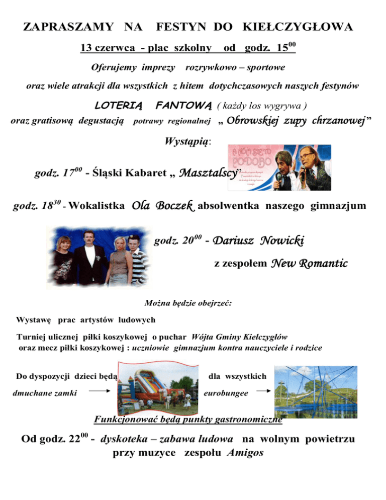 ZAPRASZAMY NA FESTYN DO KIEŁCZYGŁOWA 13 czerwca - plac szkolny od godz. 1500 Oferujemy imprezy rozrywkowo – sportowe oraz wiele atrakcji dla wszystkich z hitem dotychczasowych naszych festynów LOTERIĄ FANTOWĄ ( każdy los wygrywa ) oraz gratisową degustacją potrawy regionalnej „ Obrowskiej zupy chrzanowej ” Wystąpią: godz. 1700 - Śląski Kabaret „ Masztalscy” godz. 1830 - Wokalistka Ola Boczek absolwentka naszego gimnazjum godz. 2000 - Dariusz Nowicki z zespołem New Romantic Można będzie obejrzeć: Wystawę prac artystów ludowych Turniej ulicznej piłki koszykowej o puchar Wójta Gminy Kiełczygłów oraz mecz piłki koszykowej : uczniowie gimnazjum kontra nauczyciele i rodzice Do dyspozycji dzieci będą dmuchane zamki dla wszystkich eurobungee Funkcjonować będą punkty gastronomiczne Od godz. 2200 - dyskoteka – zabawa ludowa na wolnym powietrzu przy muzyce zespołu Amigos