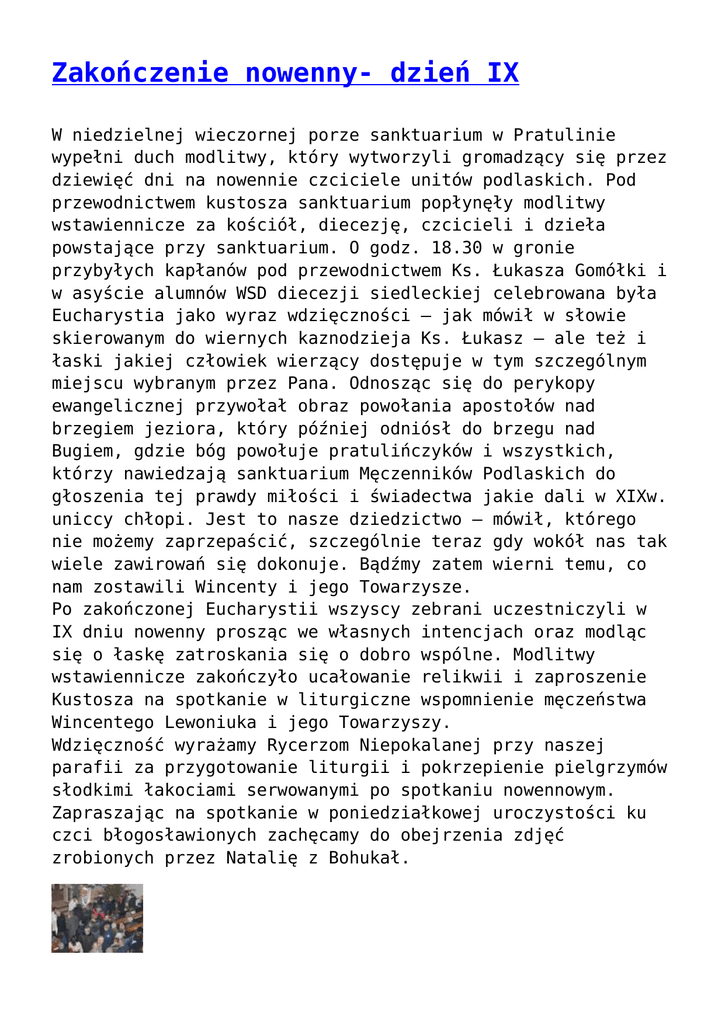 Zakończenie nowenny- dzień IX W niedzielnej wieczornej porze sanktuarium w Pratulinie wypełni duch modlitwy, który wytworzyli gromadzący się przez dziewięć dni na nowennie czciciele unitów podlaskich. Pod przewodnictwem kustosza sanktuarium popłynęły modlitwy wstawiennicze za kościół, diecezję, czcicieli i dzieła powstające przy sanktuarium. O godz. 18.30 w gronie przybyłych kapłanów pod przewodnictwem Ks. Łukasza Gomółki i w asyście alumnów WSD diecezji siedleckiej celebrowana była Eucharystia jako wyraz wdzięczności – jak mówił w słowie skierowanym do wiernych kaznodzieja Ks. Łukasz – ale też i łaski jakiej człowiek wierzący dostępuje w tym szczególnym miejscu wybranym przez Pana. Odnosząc się do perykopy ewangelicznej przywołał obraz powołania apostołów nad brzegiem jeziora, który później odniósł do brzegu nad Bugiem, gdzie bóg powołuje pratulińczyków i wszystkich, którzy nawiedzają sanktuarium Męczenników Podlaskich do głoszenia tej prawdy miłości i świadectwa jakie dali w XIXw. uniccy chłopi. Jest to nasze dziedzictwo – mówił, którego nie możemy zaprzepaścić, szczególnie teraz gdy wokół nas tak wiele zawirowań się dokonuje. Bądźmy zatem wierni temu, co nam zostawili Wincenty i jego Towarzysze. Po zakończonej Eucharystii wszyscy zebrani uczestniczyli w IX dniu nowenny prosząc we własnych intencjach oraz modląc się o łaskę zatroskania się o dobro wspólne. Modlitwy wstawiennicze zakończyło ucałowanie relikwii i zaproszenie Kustosza na spotkanie w liturgiczne wspomnienie męczeństwa Wincentego Lewoniuka i jego Towarzyszy. Wdzięczność wyrażamy Rycerzom Niepokalanej przy naszej parafii za przygotowanie liturgii i pokrzepienie pielgrzymów słodkimi łakociami serwowanymi po spotkaniu nowennowym. Zapraszając na spotkanie w poniedziałkowej uroczystości ku czci błogosławionych zachęcamy do obejrzenia zdjęć zrobionych przez Natalię z Bohukał. Pobożność Maryjna – temat VIII dnia nowenny Przedostatnie spotkanie nowennowe zgromadziło w Sanktuarium Pratulińskim liczne grono rozmodlonych pielgrzymów. Spotkanie rozpoczęła koronka przez przyczynę błogosławionych Unitów. Przed Eucharystią zostały pobłogosławione dary, które biskup pomocniczy diecezji siedleckiej Piotr Sawczuk ofiarował dla sanktuarium /haftowana ręcznie struła z męczennikami oraz głęboka patena/. Pod przewodnictwem Biskupa Piotra kapłani zgromadzeni przy ołtarzu i wierni w świątyni celebrowali Eucharystię. Zebrani w słowie skierowanym przez biskupa pomocniczego usłyszeli, że każdy dzień nowenny podprowadza nas coraz bliżej ku tajemnicy tego świętego miejsca, gdzie 143 lata temu świeccy ludzie oddali swoje życie za wiarę. Ukazując zaś współczesną postawę człowieka – letniość wielu chrześcijan – kaznodzieja wskazał na postawę, której współczesny świat nie rozumie, bo nie mając Boga nie ma nadprzyrodzonych motywacji. To Jezus powiedział Ja jestem drogą – i w ten sposób dał drogowskaz, w którym człowiek – tak jak Maryja staje się szczęśliwy w tajemnicy swej wiary.Tak rozumieli swoją misję Unici – wierni Bogu, Kościołowi i Jego Matce. Niech ta, która była mocą pratulińskich Unitów idących na śmierć, pomoże i nam oddać swoje życie Bogu i wszystkie życiowe sprawy układać według Ewangelii – zakończył biskup. Licznie przyjęta komunia to odpowiedź na przeżycie słowa, wiary i ofiary na wzór męczenników podlaskich. Ona też sprawiła, że modlitwa nowennowa tego wieczoru stała się jeszcze bardziej wymowna i pełniejsza. Na zakończenie tradycyjnie zebrani mieli możliwość ucałowania relikwii, a babcie i dziadkowie z okazji ich święta otrzymali słodkie babeczki przygotowane przez parafian. Serdeczne zaproszenie popłynęło także od Kustosza w imieniu wszystkich członków Parafialnego Oddziału Koła Przyjaciół Katolickiego Radia Podlasie, który przygotował słodki poczęstunek do którego wszyscy zostali zaproszeni. Wierność w rzeczach małych – temat VII dnia nowenny Zgromadzeni w Sanktuarium Błogosławionych Męczenników Podlaskich na kolejnym dniu nowenny przez ich orędownictwo odkrywali prawdę wyrażoną w słowach Ewangelii św. Łukasza: kto w drobnej rzeczy jest wierny ten i w wielkiej będzie wierny. Ks. Krzysztof Skwierczyński – Ojciec duchowny WSD Siedlce, który w asyście kapłanów przybyłych ze Szpak, Komarna, Marianowa, Klonownicy, Janowa Podlaskiego, i miejscowych duszpasterzy przewodniczył dzisiejszej nowennie. W słowie umacniającym nas do kroczenia śladami Pana – przez przykład błogosławionych z Pratulina wskazywał słuchaczom wielkość, która zaczyna się od najmniejszych, codziennych, zwykłych zadań i obowiązków człowieka. Mówił: Kto w drobnej rzeczy jest wierny – trzeba nam spojrzeć na nas samych, na nasze postawy, wynikające z życia zadania, na to że jestem chrześcijaninem one to mówią nam o tej wielkości naszego życia, świadectwa chrześcijaństwa, człowieczeństwa, bo kto kocha ten zawsze jest wierny, ale ten co nie potrafi kochać ten i wierny nie będzie – mówił kaznodzieja. I do tego obrazu winniśmy dorastać tak jak błogosławieni Męczennicy prze swoją codzienność. Jezus obiecuje wszystkim wielkość jeśli będziemy wierni w rzeczach małych czego mamy przykład w świadectwie męczeńskiego Podlasia. Ubogaceni Słowem i łaską żywego Jezusa obecnego w Eucharystii zgromadzenie w świątyni ugięli kolana i w kolejnym dniu nowenny popłynęły dziękczynienia, przeproszenia i prośby przedstawione przez Kustosza w modlitwie wstawienniczej. Ks. Krzysztof zaś w modlitwie nowennowej prosił o łaskę wierności w tych codziennych, może małych ale jakże ważnych sprawach naszego życia, a ucałowanie relikwii męczenników stało się dla zgromadzonych znakiem zawierzenia ich orędownictwu. Dziękujmy Ks. Krzysztofowi i alumnom oraz prz