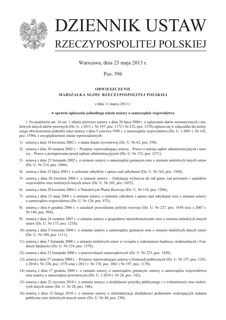 DZIENNIK USTAW RZECZYPOSPOLITEJ POLSKIEJ Warszawa, dnia 23 maja 2013 r. Poz. 596 OBWIESZCZENIE MARSZAŁKA SEJMU RZECZYPOSPOLITEJ POLSKIEJ z dnia 11 marca 2013 r. w sprawie ogłoszenia jednolitego tekstu ustawy o samorządzie województwa 1. Na podstawie art. 16 ust. 1 zdanie pierwsze ustawy z dnia 20 lipca 2000 r. o ogłaszaniu aktów normatywnych i niektórych innych aktów prawnych (Dz. U. z 2011 r. Nr 197, poz. 1172 i Nr 232, poz. 1378) ogłasza się w załączniku do niniejszego obwieszczenia jednolity tekst ustawy z dnia 5 czerwca 1998 r. o samorządzie województwa (Dz. U. z 2001 r. Nr 142, poz. 1590), z uwzględnieniem zmian wprowadzonych: 1) ustawą z dnia 18 kwietnia 2002 r. o stanie klęski żywiołowej (Dz. U. Nr 62, poz. 558), 2)ustawą z dnia 30 sierpnia 2002 r. – Przepisy wprowadzające ustawę – Prawo o ustroju sądów administracyjnych i ustawę – Prawo o postępowaniu przed sądami administracyjnymi (Dz. U. Nr 153, poz. 1271), 3)ustawą z dnia 23 listopada 2002 r. o zmianie ustawy o samorządzie gminnym oraz o zmianie niektórych innych ustaw (Dz. U. Nr 214, poz. 1806), 4) ustawą z dnia 23 lipca 2003 r. o ochronie zabytków i opiece nad zabytkami (Dz. U. Nr 162, poz. 1568), 5)ustawą z dnia 20 kwietnia 2004 r. o zmianie ustawy – Ordynacja wyborcza do rad gmin, rad powiatów i sejmików województw oraz niektórych innych ustaw (Dz. U. Nr 102, poz. 1055), 6) ustawą z dnia 20 kwietnia 2004 r. o Narodowym Planie Rozwoju (Dz. U. Nr 116, poz. 1206), 7)ustawą z dnia 12 maja 2006 r. o zmianie ustawy o ochronie zabytków i opiece nad zabytkami oraz o zmianie ustawy o samorządzie województwa (Dz. U. Nr 126, poz. 875), 8)ustawą z dnia 6 grudnia 2006 r. o zasadach prowadzenia polityki rozwoju (Dz. U. Nr 227, poz. 1658 oraz z 2007 r. Nr 140, poz. 984), 9)ustawą z dnia 24 sierpnia 2007 r. o zmianie ustawy o gospodarce nieruchomościami oraz o zmianie niektórych innych ustaw (Dz. U. Nr 173, poz. 1218), 10)ustawą z dnia 5 września 2008 r. o zmianie ustawy o samorządzie gminnym oraz o zmianie niektórych innych ustaw (Dz. U. Nr 180, poz. 1111), 11)ustawą z dnia 7 listopada 2008 r. o zmianie niektórych ustaw w związku z wdrażaniem funduszy strukturalnych i Funduszu Spójności (Dz. U. Nr 216, poz. 1370), 12) ustawą z dnia 21 listopada 2008 r. o pracownikach samorządowych (Dz. U. Nr 223, poz. 1458), 13)ustawą z dnia 27 sierpnia 2009 r. – Przepisy wprowadzające ustawę o finansach publicznych (Dz. U. Nr 157, poz. 1241, z 2010 r. Nr 238, poz. 1578 oraz z 2011 r. Nr 178, poz. 1061 i Nr 197, poz. 1170), 14)ustawą z dnia 17 grudnia 2009 r. o zmianie ustawy o samorządzie gminnym, ustawy o samorządzie województwa oraz ustawy o samorządzie powiatowym (Dz. U. z 2010 r. Nr 28, poz. 142), 15)ustawą z dnia 22 stycznia 2010 r. o zmianie ustawy o działalności pożytku publicznego i o wolontariacie oraz niektórych innych ustaw (Dz. U. Nr 28, poz. 146), 16)ustawą z dnia 12 lutego 2010 r. o zmianie ustawy o informatyzacji działalności podmiotów realizujących zadania publiczne oraz niektórych innych ustaw (Dz. U. Nr 40, poz. 230), Dziennik Ustaw –2– Poz. 596 17) ustawą z dnia 7 maja 2010 r. o wspieraniu rozwoju usług i sieci telekomunikacyjnych (Dz. U. Nr 106, poz. 675), 18)ustawą z dnia 5 stycznia 2011 r. – Przepisy wprowadzające ustawę – Kodeks wyborczy (Dz. U. Nr 21, poz. 113 oraz z 2012 r. poz. 1399), 19) ustawą z dnia 9 czerwca 2011 r. o wspieraniu rodziny i systemie pieczy zastępczej (Dz. U. Nr 149, poz. 887), 20)ustawą z dnia 31 sierpnia 2011 r. o zmianie ustawy – Kodeks wyborczy oraz niektórych innych ustaw (Dz. U. Nr 217, poz. 1281) oraz zmian wynikających z przepisów ogłoszonych przed dniem 27 lutego 2013 r. 2. Podany w załączniku do niniejszego obwieszczenia jednolity tekst ustawy nie obejmuje: 1) art. 34 ustawy z dnia 18 kwietnia 2002 r. o stanie klęski żywiołowej (Dz. U. Nr 62, poz. 558), który stanowi: „Art. 34. Ustawa wchodzi w życie po upływie 30 dni od dnia ogłoszenia.”; 2)art. 106 ustawy z dnia 30 sierpnia 2002 r. – Przepisy wprowadzające ustawę – Prawo o ustroju sądów administracyjnych i ustawę – Prawo o postępowaniu przed sądami administracyjnymi (Dz. U. Nr 153, poz. 1271), który stanowi: „Art. 106. Ustawa wchodzi w życie z dniem 1 stycznia 2004 r., z wyjątkiem przepisów art. 8 pkt 1 i 2, art. 10 pkt 2 i 3, art. 84 pkt 1, art. 86 § 1, art. 87 § 2, art. 88, art. 90 § 1, art. 91 i art. 92, które wchodzą w życie po upływie 14 dni od dnia ogłoszenia.”; 3)art. 10, art. 11, art. 12, art. 13 i art. 16 ustawy z dnia 23 listopada 2002 r. o zmianie ustawy o samorządzie gminnym oraz o zmianie niektórych innych ustaw (Dz. U. Nr 214, poz. 1806), które stanowią: „Art. 10. Małżonek radnego jednostki samorządu terytorialnego, wójta (burmistrza, prezydenta miasta), zastępcy wójta (burmistrza, prezydenta miasta), członka zarządu powiatu i województwa, skarbnika gminy, powiatu i województwa, sekretarza gminy i powiatu, kierownika jednostki organizacyjnej gminy, powiatu i województwa oraz osoby zarządzającej i członka organu zarządzającego gminną, powiatową i wojewódzką osobą prawną, który w dniu wejścia w życie niniejszej ustawy pełni funkcje lub zajmuje stanowisko, o których mowa, odpowiednio, w art. 24f ust. 2 ustawy, o której mowa w art. 1, art. 25b ust. 3 ustawy, o której mowa w art. 4, i art. 27b ust. 3 ustawy, o której mowa w art. 5, obowiązany jest zrzec się tej funkcji lub stanowiska w terminie 3 miesięcy od dnia wejścia w życie niniejszej ustawy. W razie niezrzeczenia się funkcji lub stanowiska w terminie, o którym mowa w zdaniu pierwszym, małżonek traci je, z mocy prawa, z upływem tego terminu. Art. 11. 1. Kierownicy gminnych, powiatowych i wojewódzkich samorządowych jednostek organizacyjnych oraz osoby zarządzające i członkowie organów zarządzających gminnymi, powiatowymi i wojewódzkimi osobami prawnymi, którzy w dniu wejścia w życ