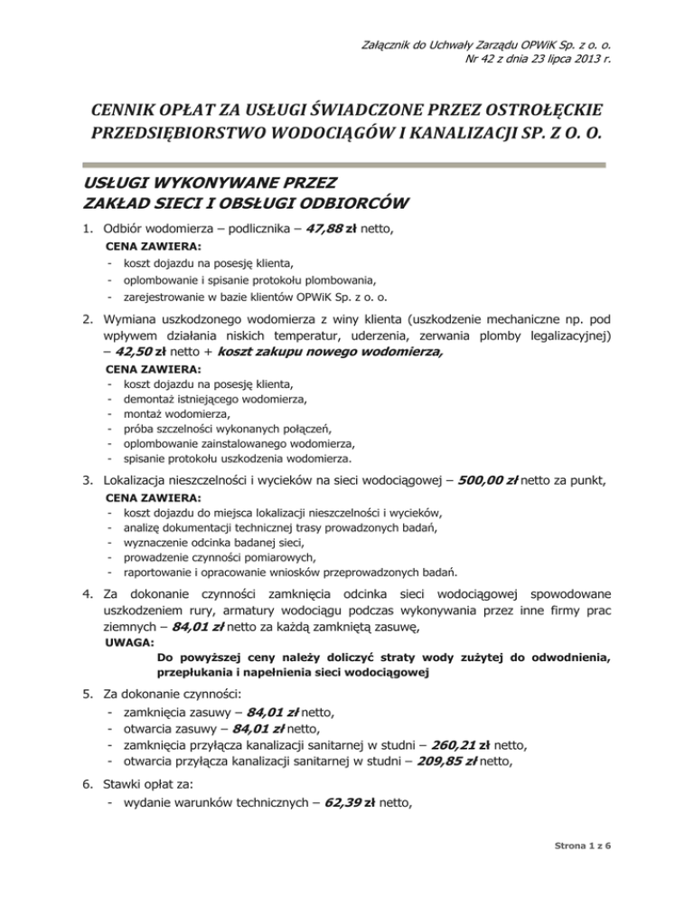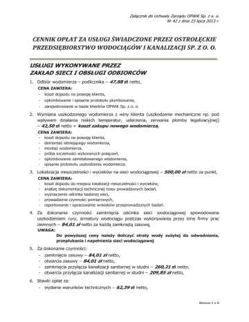 Załącznik do Uchwały Zarządu OPWiK Sp. z o. o. Nr 42 z dnia 23 lipca 2013 r. CENNIK OPŁAT ZA USŁUGI ŚWIADCZONE PRZEZ OSTROŁĘCKIE PRZEDSIĘBIORSTWO WODOCIĄGÓW I KANALIZACJI SP. Z O. O. USŁUGI WYKONYWANE PRZEZ ZAKŁAD SIECI I OBSŁUGI ODBIORCÓW 1. Odbiór wodomierza – podlicznika – 47,88 zł netto, CENA ZAWIERA: - koszt dojazdu na posesję klienta, - oplombowanie i spisanie protokołu plombowania, - zarejestrowanie w bazie klientów OPWiK Sp. z o. o. 2. Wymiana uszkodzonego wodomierza z winy klienta (uszkodzenie mechaniczne np. pod wpływem działania niskich temperatur, uderzenia, zerwania plomby legalizacyjnej) – 42,50 zł netto + koszt zakupu nowego wodomierza, CENA ZAWIERA: - koszt dojazdu na posesję klienta, - demontaż istniejącego wodomierza, - montaż wodomierza, - próba szczelności wykonanych połączeń, - oplombowanie zainstalowanego wodomierza, - spisanie protokołu uszkodzenia wodomierza. 3. Lokalizacja nieszczelności i wycieków na sieci wodociągowej – 500,00 zł netto za punkt, CENA ZAWIERA: - koszt dojazdu do miejsca lokalizacji nieszczelności i wycieków, - analizę dokumentacji technicznej trasy prowadzonych badań, - wyznaczenie odcinka badanej sieci, - prowadzenie czynności pomiarowych, - raportowanie i opracowanie wniosków przeprowadzonych badań. 4. Za dokonanie czynności zamknięcia odcinka sieci wodociągowej spowodowane uszkodzeniem rury, armatury wodociągu podczas wykonywania przez inne firmy prac ziemnych – 84,01 zł netto za każdą zamkniętą zasuwę, UWAGA: Do powyższej ceny należy doliczyć straty wody zużytej do odwodnienia, przepłukania i napełnienia sieci wodociągowej 5. Za dokonanie czynności: - zamknięcia zasuwy – 84,01 zł netto, otwarcia zasuwy – 84,01 zł netto, zamknięcia przyłącza kanalizacji sanitarnej w studni – 260,21 zł netto, otwarcia przyłącza kanalizacji sanitarnej w studni – 209,85 zł netto, 6. Stawki opłat za: - wydanie warunków technicznych – 62,39 zł netto, Strona 1 z 6 Załącznik do Uchwały Zarządu OPWiK Sp. z o. o. Nr 42 z dnia 23 lipca 2013 r. - dokonanie uzgodnień Projektu Budowlanego sieci wodociągowo – kanalizacyjnej – 62,39 zł netto, 7. Stawki opłat za przyłączenie do urządzeń wodociągowo – kanalizacyjnych: - za odbiór przyłącza wodociągowego – 47,88 zł netto, - za odbiór przyłącza kanalizacyjnego – 47,88 zł netto, - za odbiór przyłącza wodociągowo – kanalizacyjnego – 56,38 zł netto. USŁUGI WYKONYWANE PRZEZ ZAKŁAD LOGISTYKI I SPRZEDAŻY 1. Samochód specjalny MAN KAISER ECO COMBI II z funkcją odzysku wody do ciśnieniowego udrażniania kanalizacji oraz odsysania nieczystości płynnych: Cena usług świadczonych w dni robocze w godzinach 700 – 1500 Cena usług świadczonych w dni wolne od pracy oraz w dni robocze poza godzinami 700 – 1500 Cena usług świadczonych w niedziele i święta 300,00 zł/godz. pracy netto 370,00 zł/godz. pracy netto 410,00 zł/godz. pracy netto za dojazd – 4,50 zł/km netto 2. Samochód specjalny STAR/MAN SC – 422 do ciśnieniowego udrażniania kanalizacji: Cena usług świadczonych w dni robocze w godzinach 700 – 1500 Cena usług świadczonych w dni wolne od pracy oraz w dni robocze poza godzinami 700 – 1500 Cena usług świadczonych w niedziele i święta 207,16 zł/godz. pracy netto 277,16 zł/godz. pracy netto 317,16 zł/godz. pracy netto za dojazd – 3,66 zł/km netto 3. Samochód specjalny STAR/MAN SW – 201A do czyszczenia wpustów ulicznych oraz odsysania nieczystości płynnych: Cena usług świadczonych w dni robocze w godzinach 700 – 1500 200,81 zł/godz. pracy netto Cena usług świadczonych w dni wolne od pracy oraz w dni robocze poza godzinami 700 – 1500 270,81 zł/godz. pracy netto Cena usług świadczonych w niedziele i święta 310,81 zł/godz. pracy netto za dojazd – 3,81 zł/km netto 4. Ciągnik URSUS 1234 z beczką asenizacyjną o pojemności 9 m3: Cena usług świadczonych w dni robocze w godzinach 700 – 1500 72,37 zł/godz. pracy netto Cena usług świadczonych w dni wolne od pracy oraz w dni robocze poza godzinami 700 – 1500 107,37 zł/godz. pracy netto Cena usług świadczonych w niedziele i święta 127,37 zł/godz. pracy netto 3 + 7,30 zł/m netto oczyszczania ścieków Strona 2 z 6 Załącznik do Uchwały Zarządu OPWiK Sp. z o. o. Nr 42 z dnia 23 lipca 2013 r. 5. Koparka kołowa CASE WX 185 w klasie 20 ton z łyżką o pojemności 0.60 m3 lub 0.95 m3: Cena usług świadczonych w dni robocze w godzinach 700 – 1500 156,16 zł/godz. pracy netto Cena usług świadczonych w dni wolne od pracy oraz w dni robocze poza godzinami 700 – 1500 191,16 zł/godz. pracy netto Cena usług świadczonych w niedziele i święta 211,16 zł/godz. pracy netto 6. Koparko – ładowarka JCB 3CX SUPER z łyżką do kopania o pojemności 0.26 m3 oraz łyżką do spychania/załadunku o pojemności 1 m3: Cena usług świadczonych w dni robocze w godzinach 700 – 1500 85,13 zł/godz. pracy netto Cena usług świadczonych w dni wolne od pracy oraz w dni robocze poza godzinami 700 – 1500 120,13 zł/godz. pracy netto Cena usług świadczonych w niedziele i święta 140,13 zł/godz. pracy netto 7. Volkswagen Transporter T5 Kombi 9 miejsc: Cena usług świadczonych w dni robocze w godzinach 700 – 1500 74,22 zł/godz. pracy netto/ 2,12 zł/km netto Cena usług świadczonych w dni wolne od pracy oraz w dni robocze poza godzinami 700 – 1500 109,22 zł/godz. pracy netto/ 2,12 zł/km netto Cena usług świadczonych w niedziele i święta 129,22 zł/godz. pracy netto/ 2,12 zł/km netto 8. Renault Master z kabiną załogową 6 miejsc, skrzynia samowyładowcza o ładowności 1 t: Cena usług świadczonych w dni robocze w godzinach 700 – 1500 71,62 zł/godz. pracy netto/ 2,05 zł/km netto Cena usług świadczonych w dni wolne od pracy oraz w dni robocze poza godzinami 700 – 1500 106,62 zł/godz. pracy netto / 2,05 zł/km netto Cena usług świadczonych w niedziele i święta 12