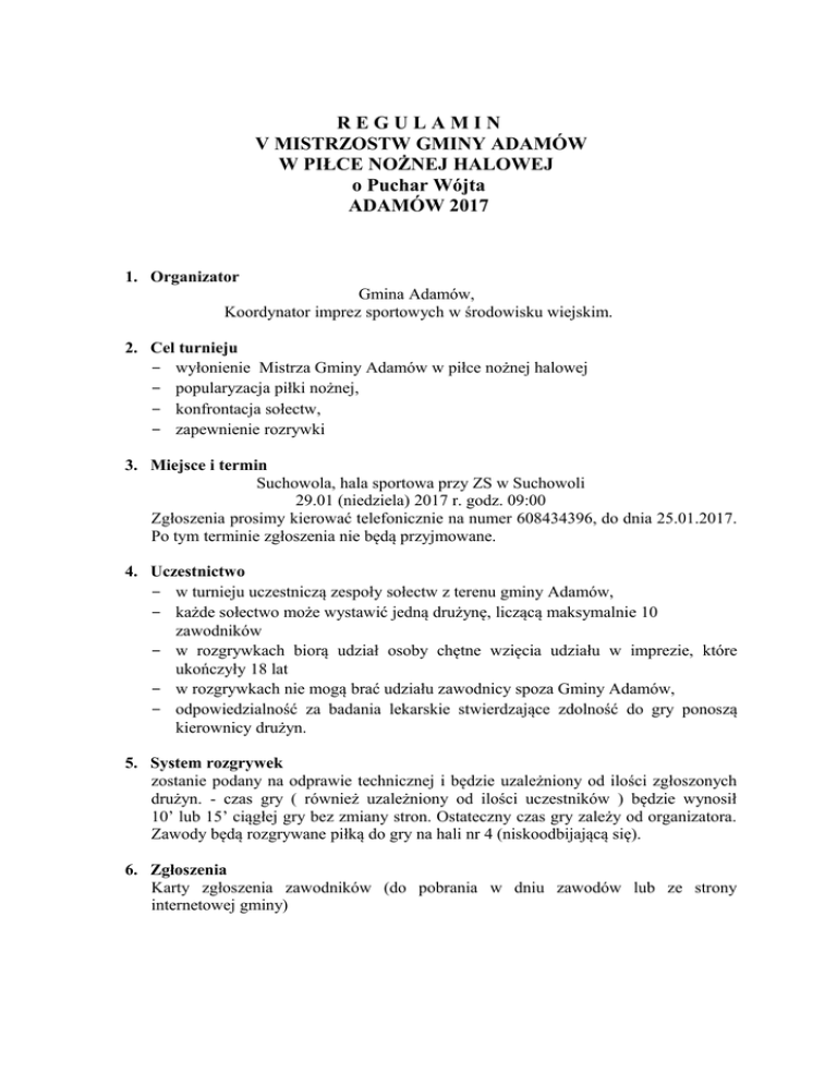 REGULAMIN V MISTRZOSTW GMINY ADAMÓW W PIŁCE NOŻNEJ HALOWEJ o Puchar Wójta ADAMÓW 2017 1. Organizator Gmina Adamów, Koordynator imprez sportowych w środowisku wiejskim. 2. Cel turnieju − wyłonienie Mistrza Gminy Adamów w piłce nożnej halowej − popularyzacja piłki nożnej, − konfrontacja sołectw, − zapewnienie rozrywki 3. Miejsce i termin Suchowola, hala sportowa przy ZS w Suchowoli 29.01 (niedziela) 2017 r. godz. 09:00 Zgłoszenia prosimy kierować telefonicznie na numer 608434396, do dnia 25.01.2017. Po tym terminie zgłoszenia nie będą przyjmowane. 4. Uczestnictwo − w turnieju uczestniczą zespoły sołectw z terenu gminy Adamów, − każde sołectwo może wystawić jedną drużynę, liczącą maksymalnie 10 zawodników − w rozgrywkach biorą udział osoby chętne wzięcia udziału w imprezie, które ukończyły 18 lat − w rozgrywkach nie mogą brać udziału zawodnicy spoza Gminy Adamów, − odpowiedzialność za badania lekarskie stwierdzające zdolność do gry ponoszą kierownicy drużyn. 5. System rozgrywek zostanie podany na odprawie technicznej i będzie uzależniony od ilości zgłoszonych drużyn. - czas gry ( również uzależniony od ilości uczestników ) będzie wynosił 10’ lub 15’ ciągłej gry bez zmiany stron. Ostateczny czas gry zależy od organizatora. Zawody będą rozgrywane piłką do gry na hali nr 4 (niskoodbijającą się). 6. Zgłoszenia Karty zgłoszenia zawodników (do pobrania w dniu zawodów lub ze strony internetowej gminy) 7. Sprawy finansowe Koszty organizacyjne pokrywa Organizator. Drużyny przyjeżdżają na własny koszt. Warunkiem uczestnictwa jest przybycie w wyznaczonym terminie i wypełnienie formularza zgłoszeniowego. 8. Ubezpieczenia Organizator ubezpieczył wszystkich uczestników od NNW. Organizatorzy nie ponoszą odpowiedzialności za rzeczy pozostawione w szatni, zagubione lub skradzione. 9. Przepisy gry Rozgrywki prowadzone będą według aktualnych przepisów gry w halową piłkę nożną (futsal). W trakcie gry zespoły mogą się składać z pięciu zawodników (bramkarz plus czterech zawodników w polu). Dopuszcza się dowolną liczbę zmian w trakcie meczu (tzw. system hokejowy). Zmian można dokonywać tylko w wyznaczonej strefie. Jeżeli zawodnik wchodzący pojawi się na boisku zanim opuści je zawodnik schodzący, sędzia wykluczy go z gry na 1 minutę. Obowiązują bramki do piłki ręcznej Grę z autu wznawia się nogą, z miejsca wyjścia piłki poza boisko (z linii lub zza linii autowej). Bezpośrednio z autu nie można zdobyć bramki. Obowiązuje bezwzględny zakaz gry wślizgiem. Wślizgi będą karane rzutem wolnym bezpośrednim (poza polem karnym) lub rzutem karnym (w polu karnym). Bramkarz może atakować piłkę we własnym polu karnym zgodnie z przepisami. Rzuty karne wykonywane będą z odległości 7 metrów od linii bramkowej. Podczas wykonywania rzutu wolnego zawodnicy drużyny przeciwnej nie mogą znajdować się przy wykonawcy wolnego w odległości bliższej niż 3 metry. Za utrudnianie wykonania rzutu wolnego lub zbliżenie się do wykonawcy na odległość bliższą niż 3 metry sędziowie karać będą 1-minutowym wykluczeniem. Bramkarz może wznawiać grę ręką. Bramka zdobyta bezpośrednio po odbiciu się od sufitu lub innej przeszkody nie zostanie uznana. Uderzenie piłki o sufit lub inną przeszkodę powoduje rzut z autu dla przeciwnika. Przepis o spalonym nie obowiązuje. Zawodnicy mogą być karani wykluczeniem 1-minutowym (żółta kartka) lub czerwoną kartką. Zawodnik ukarany czerwoną kartką opuszcza boisko i nie może już grać do końca meczu, zaś jego drużyna gra bez jednego zawodnika do końca meczu (lub do momentu utraty bramki - po jej stracie, drużyna może uzupełnić skład). W miejsce zawodnika wykluczonego z gry drużyna nie może wprowadzić rezerwowego. Obowiązuje obuwie do gry w hali. O kolejności miejsc w tabeli decyduje ilość zdobytych punktów (3 punkty za zwycięstwo, 1 punkt za remis, bez punktów za porażkę).W przypadku uzyskania przez dwie lub więcej drużyn tej samej ilości punktów o kolejności w tabeli decydują zasady obowiązujące w rozgrywkach ligowych ZOZPN (tzw. zasada bezpośrednich spotkań). Jeżeli dwie lub więcej drużyn zakończy fazę grupową z identycznym dorobkiem punktowym i bramkowych, a wyniki spotkań bezpośrednich nie pozwolą ustalić kolejności, wówczas przeprowadzony zostanie konkurs rzutów karnych (zasada dotyczy tylko przypadku, gdy nie będzie można wyłonić zwycięzcy grupy, w pozostałych przypadkach zespoły zakończą rozgrywki w grupie na miejscach ex aequo) Jeśli mecze półfinałowe lub finał zakończą się remisem, sędzia zarządzi trzy serie rzutów karnych, jeśli nadal będzie remis - po jednej następnej serii aż do wyłonienia zwycięzcy W kwestiach nie ujętych w powyższych punktach obowiązują przepisy gry w piłkę nożną halową PZPN 10. Sprawy organizacyjne Na obiekcie zabronione jest spożywanie alkoholu i palenie papierosów. Rozgrzewkę z piłkami, trwającą nie dłużej niż minutę, zespoły będą mogły przeprowadzić przed meczem. Na arenie głównej mogą przebywać jedynie przedstawiciele organizatorów, sędziowie oraz, kierownicy i piłkarze zespołów aktualnie grających. Pozostałe osoby, kierownicy i piłkarze drużyn oczekujących na swe mecze, nie będą wpuszczane na arenę główną, 11. Sprawy sporne Wszelkie kwestie sporne, które nie są ujęte niniejszym Regulaminem rozstrzyga Organizator.