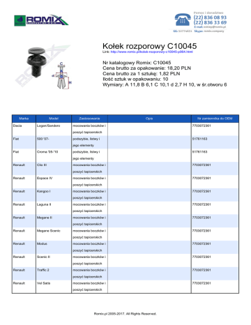 Kołek rozporowy C10045 Link: http://www.romix.pl/kolek-rozporowy-c10045-p964.html Nr katalogowy Romix: C10045 Cena brutto za opakowanie: 18,20 PLN Cena brutto za 1 sztukę: 1,82 PLN Ilość sztuk w opakowaniu: 10 Wymiary: A 11,8 B 6,1 C 10,1 d 2,7 H 10, w śr.otworu 6 Marka Dacia Model Logan/Sandero Zastosowanie Opis mocowania boczków i Nr zamiennika do OEM 7703072361 poszyć tapicerskich Fiat 500 '07- podszybie, listwy i 51761163 jego elementy Fiat Croma '05-'10 podszybie, listwy i 51761163 jego elementy Renault Clio III mocowania boczków i 7703072361 poszyć tapicerskich Renault Espace IV mocowania boczków i 7703072361 poszyć tapicerskich Renault Kangoo I mocowania boczków i 7703072361 poszyć tapicerskich Renault Laguna II mocowania boczków i 7703072361 poszyć tapicerskich Renault Megane II mocowania boczków i 7703072361 poszyć tapicerskich Renault Megane Scenic mocowania boczków i 7703072361 poszyć tapicerskich Renault Modus mocowania boczków i 7703072361 poszyć tapicerskich Renault Scenic II mocowania boczków i 7703072361 poszyć tapicerskich Renault Traffic 2 mocowania boczków i 7703072361 poszyć tapicerskich Renault Vel Satis mocowania boczków i poszyć tapicerskich Romix.pl 2005-2017. All Rights Reserved. 7703072361